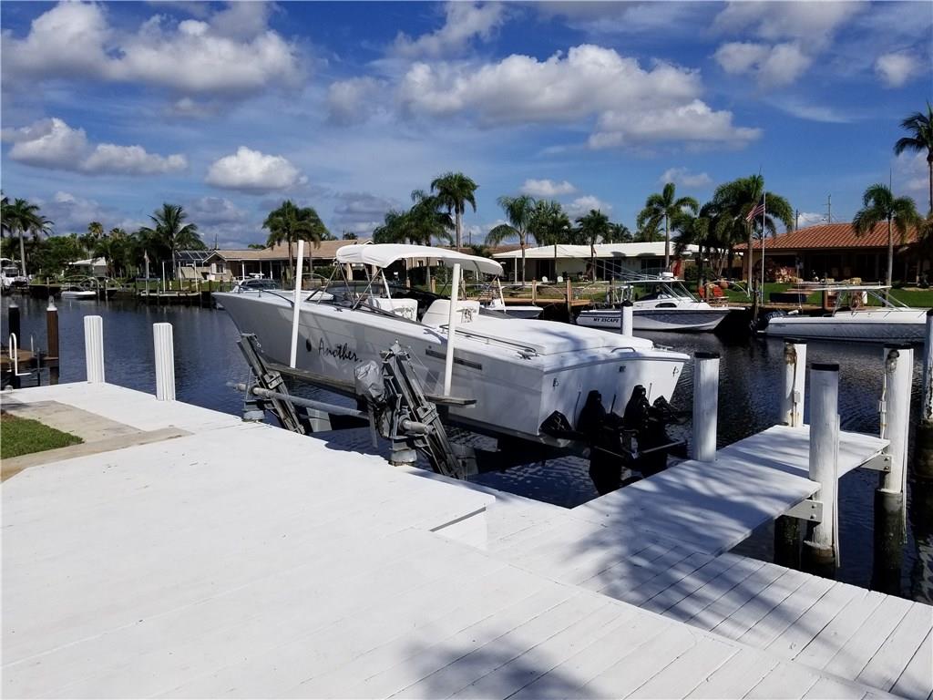 An entertainers home with 8600+ sf lot, boatlift 5,000 lbs, huge tiki hut, built in bbq/firepit, batter pilings, 3 BRs - split plan, 2 baths (cabana bath), 2 car gar., hse.wired for generator, raised seawall cap, 1 ft higher elevation than surrounding streets,70' wf with finger dock, exquisite outdoor area, lg dock, updated electrical, S tile roof, wide driveway ( 4 cars), open kitchen plan, cabinets galore, lg laundry/storage area, crown molding, remodeled bathroom, fabulous landscaping.Incredible house