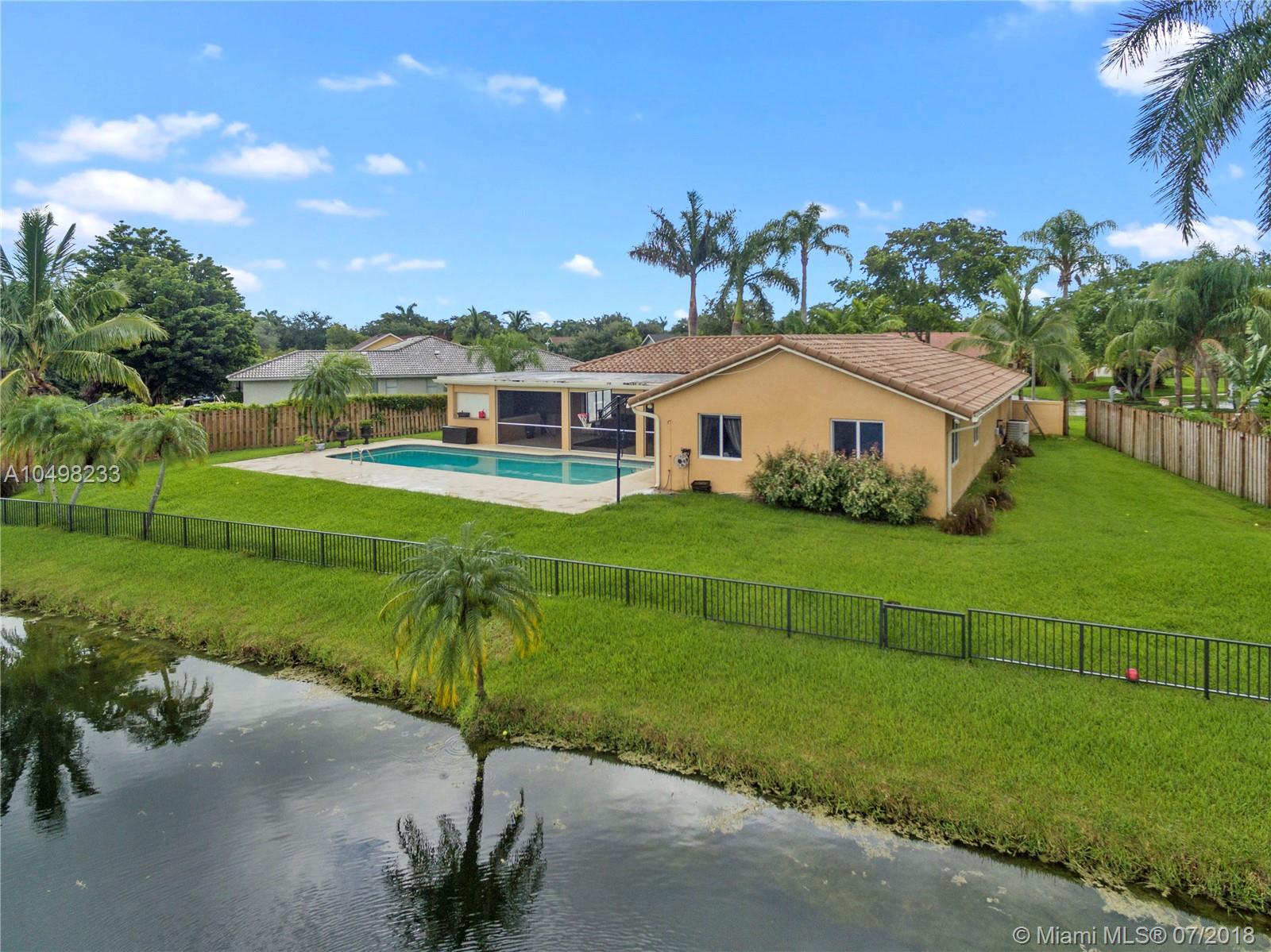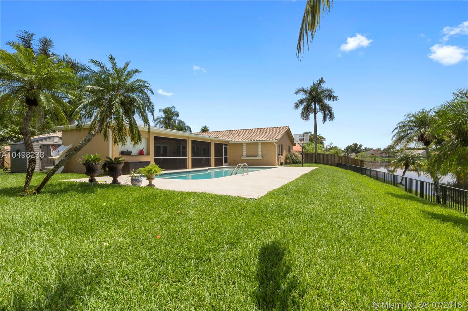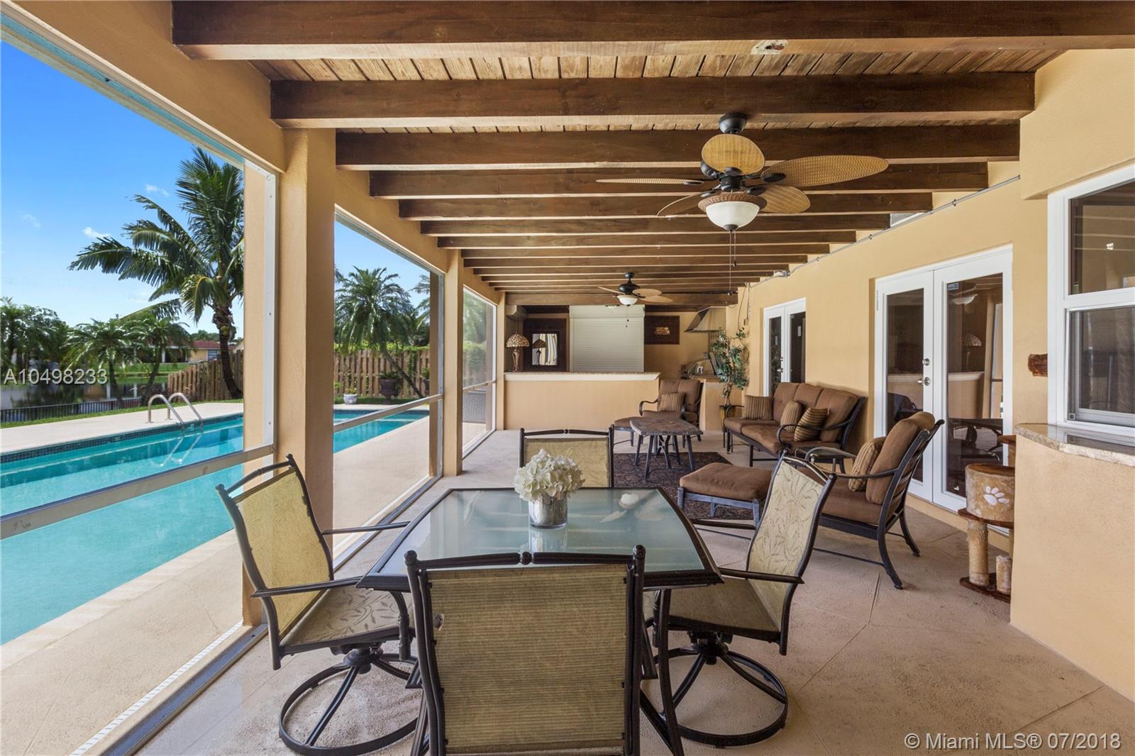 Beautiful Pool Home in Desirable Jacaranda Lakes! Best lake view in the community. Come and show this immaculate 4-bedroom home with numerous upgrades. Impact-resistant doors and windows throughout the house. Newer A/C unit, newer water heater. French doors in master bedroom and living room. The spacious covered patio is an entertainer's delight featuring a built-in BBQ and bar area with top-of-the-line gas BBQ grill, extractor, ice maker and wine cooler. Newer tile floors and updated kitchen with wood cabinets, granite counter tops. Master bedroom with updated bathroom and walk-in closet. Enjoy the serene pool and lake view from the fenced backyard or huge enclosed patio. Exterior shed has plenty of space for tools. Epoxy garage floor and more! Roof-2010; Impact Windows&Doors-2014