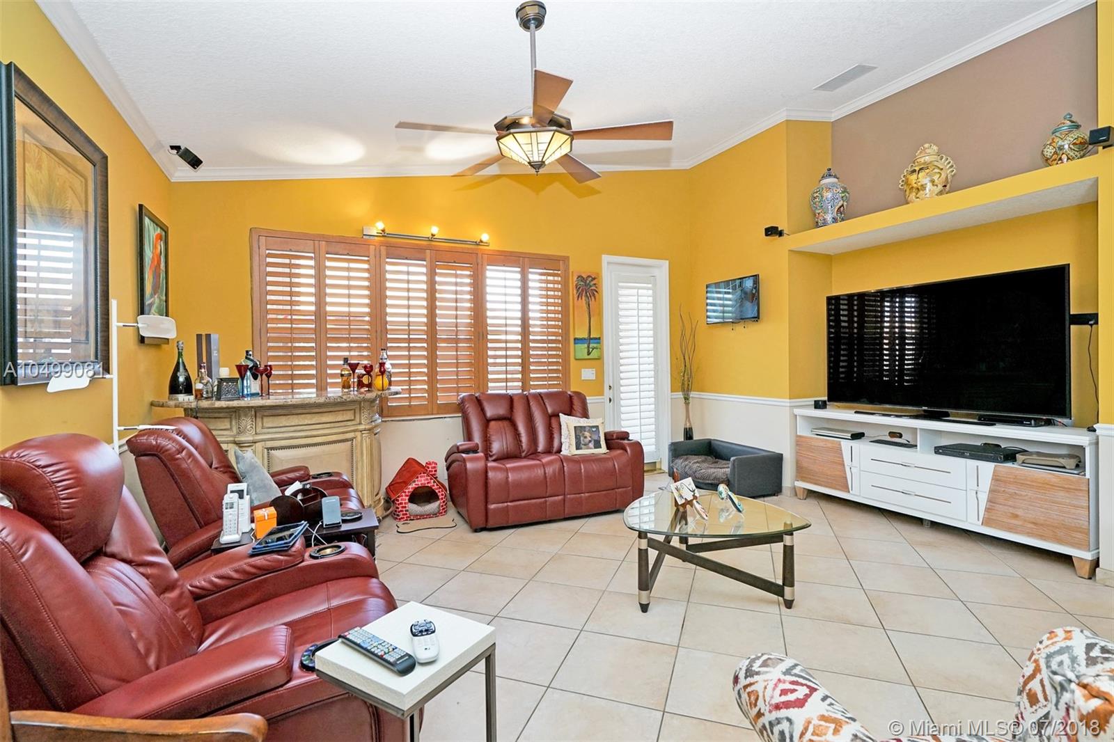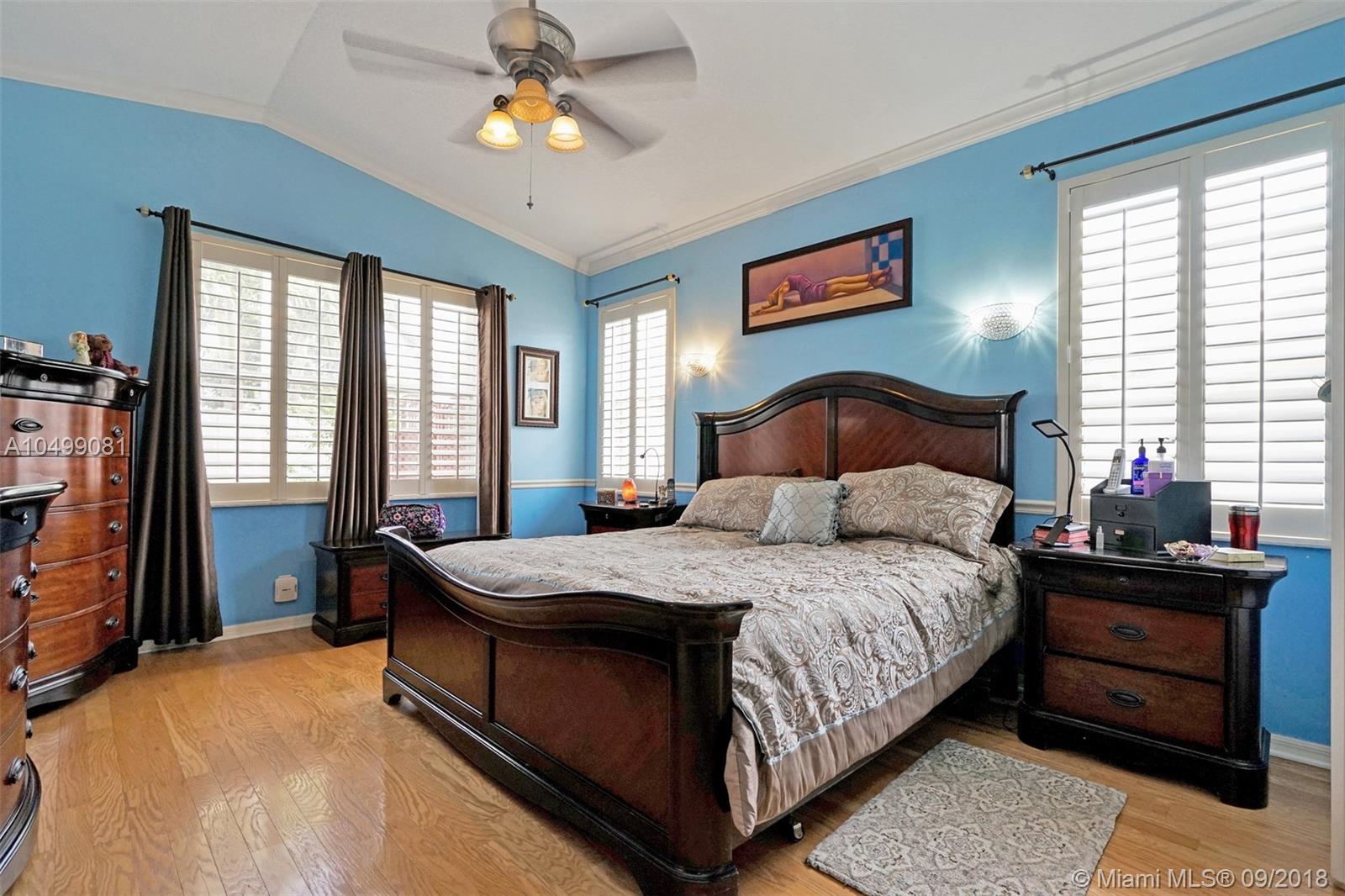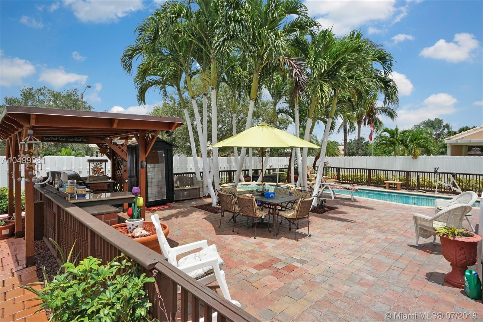 Gorgeous 4 bedrooms 2 bath house in gated community, oversized corner lot, title throughout, vaulted ceilings, crown molding, wooden cabinets with granite counter tops, huge master bedroom with double doors, big walking closet, security cameras, accordion shutters, spectacular patio area heated salt water pool with waterfall, Jacuzzi, exterior kitchen, BBQ, sauna, palm trees, ideal to entertain family and friends. Every little detail you can think of this house has it. Please call today to schedule an appointment.