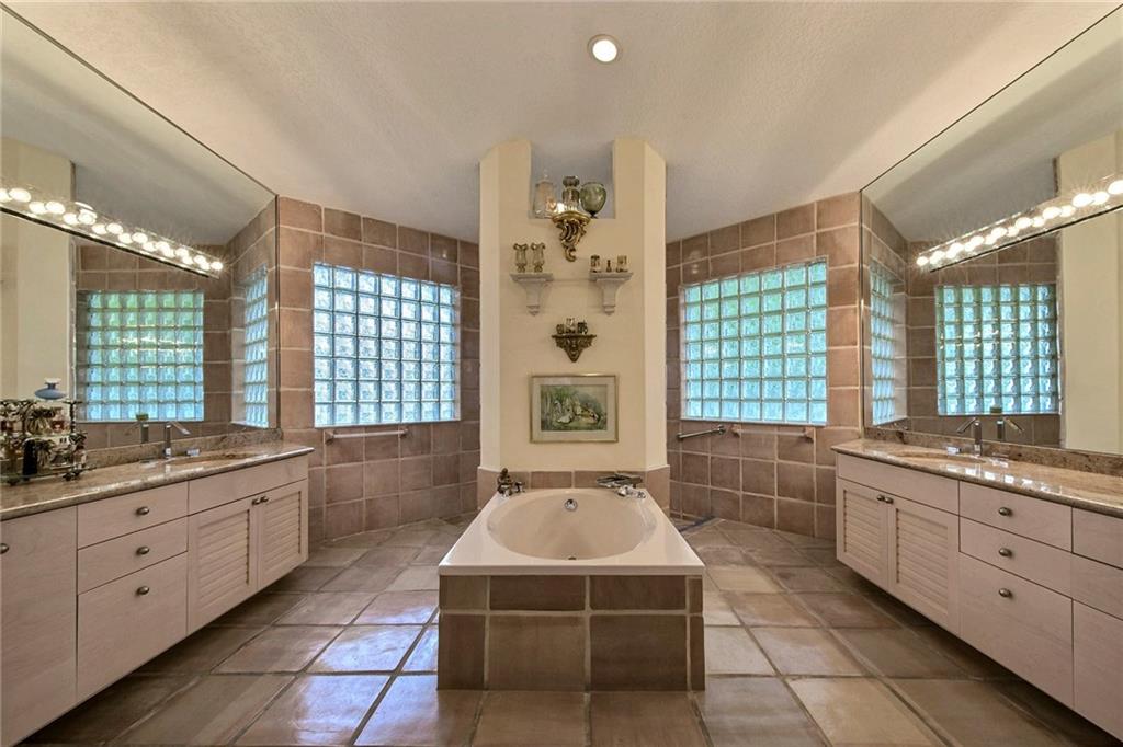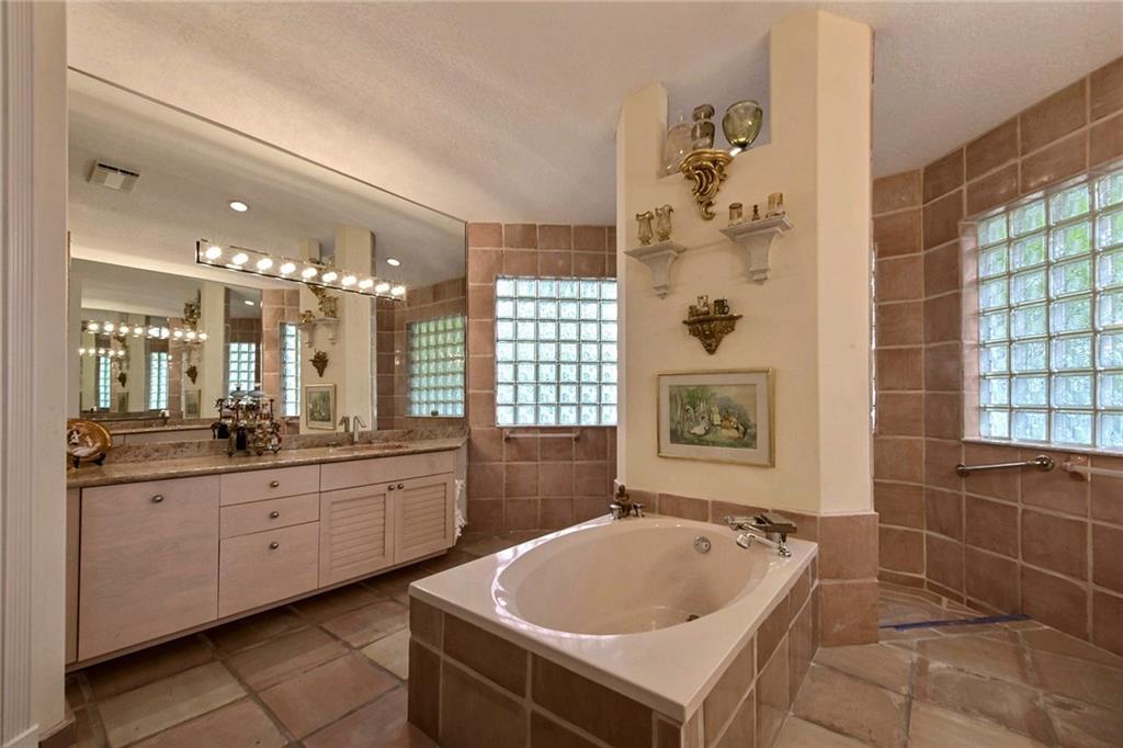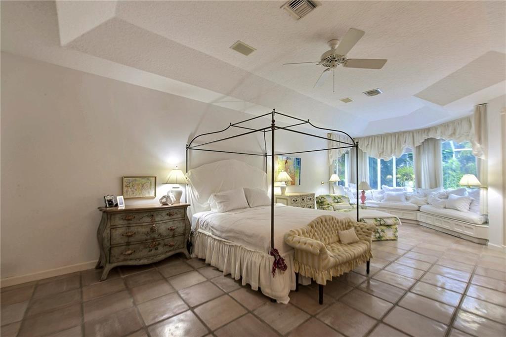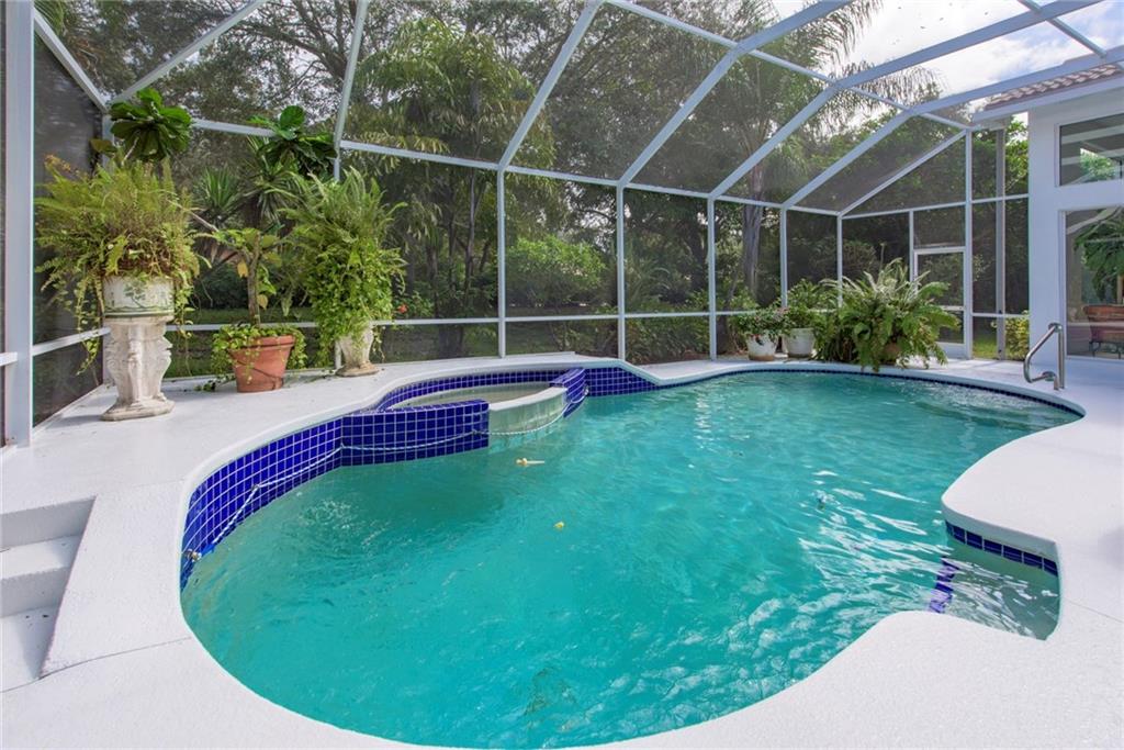 Warmth, light & charm describe this home on tropical cul de sac street of custom homes in prestigious Eagle Trace. Durable terra cotta stone tile living areas & hi end laminate bedrooms. French doors, clerestory & palladium windows, radius walls, & volume 14' flat ceilings. Desirable split bedroom floor plan & luxurious master suite, large bay window sitting area with built-in bench. Lush landscaping surround screened pool, raised spa & patio. 4 column portico entry & enormous circular paver driveway.