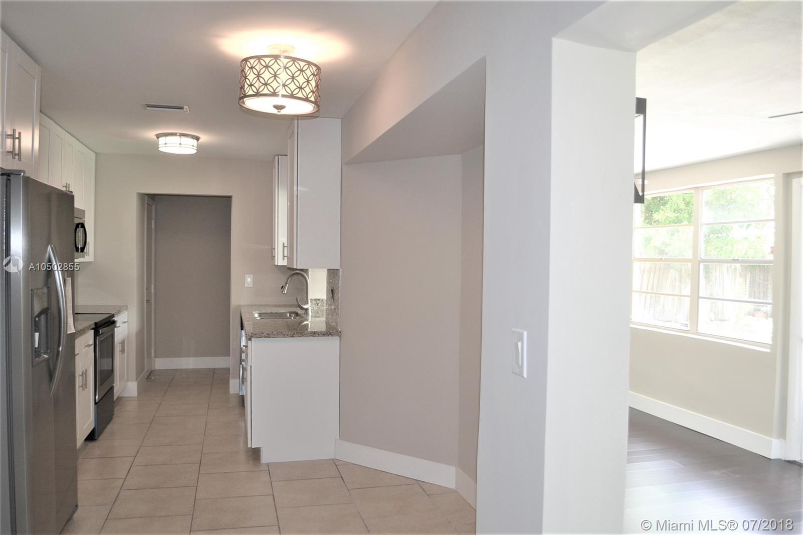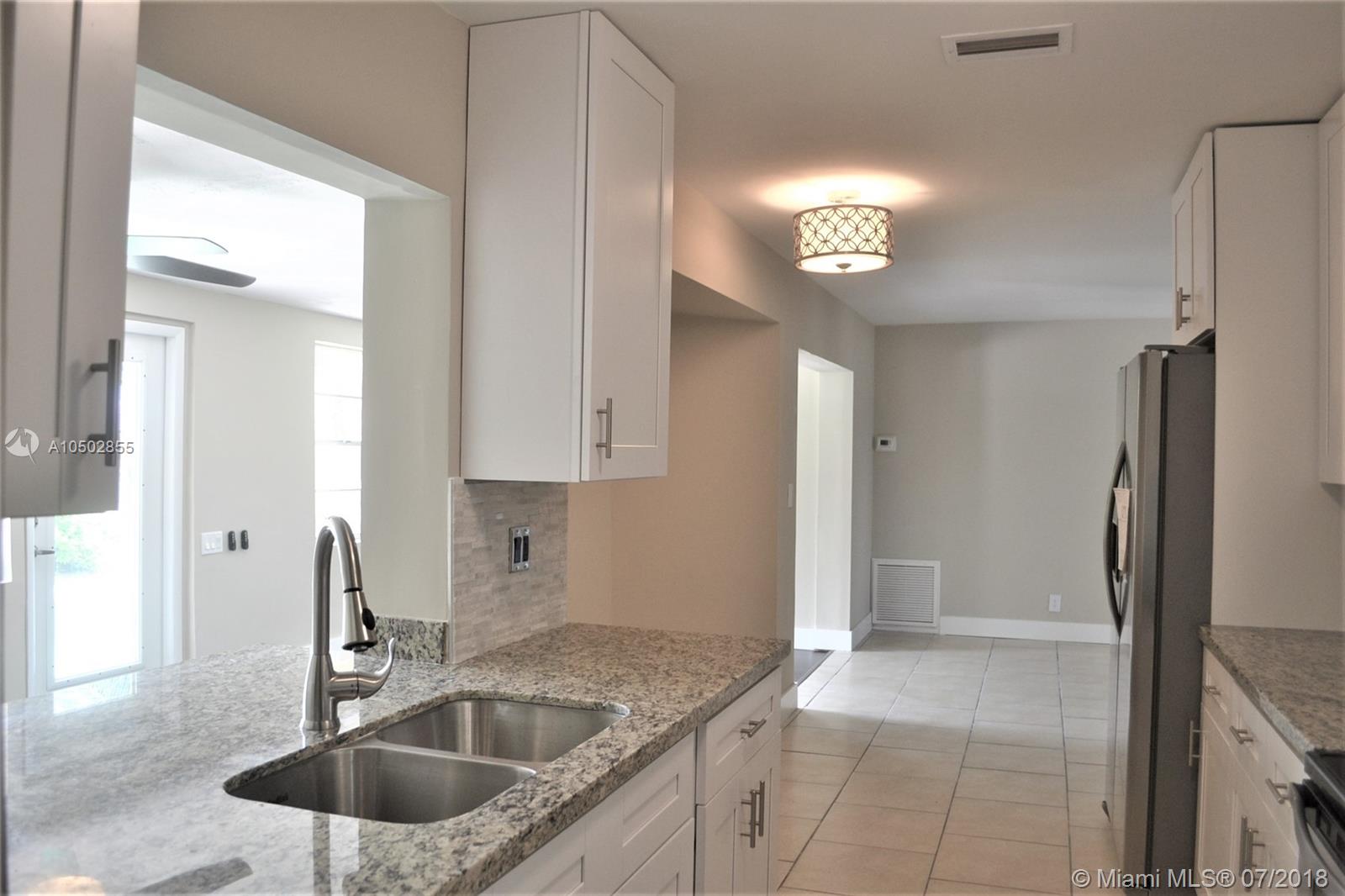 Perfect all remodeled and upgraded 4 bedroom, 2 bath home with pool and 1 car garage close to everything. Home boasts open and bright floor plan with new flooring, new modern white wood soft closing kitchen cabinets with granite counters, stone backsplash and brand new stainless steel appliances, new bathroom vanity, designer tiles in both baths, new LED ceiling fans and lighting throughout, fresh paint, newer A/C and water heater, brand new garage door and much more! Come home to your tropical private oasis, with plenty of room to entertain,and enjoy your free form salt water pool with brand new pool motor in your private fenced in backyard with beautiful coconut tree, paved deck, and enjoy South Florida sunny days!