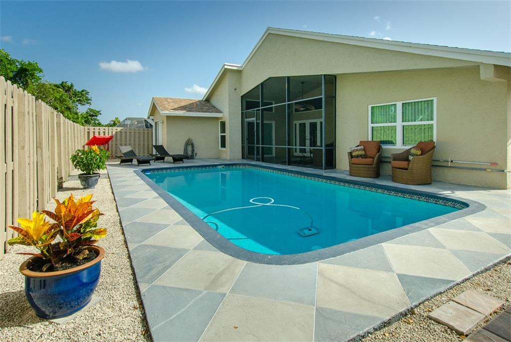 Beautiful remodeled Country Manor model has open floor plan w/vaulted ceilings,split plan & porcelain tile.Kitch. has 42" top cabinets, granite w/ b/s, gas stove, SS app. & more!Freshly painted int./ext., windows,sliding & French doors are Hurr. Impact.Bathrooms w/dual sinks & built in custom closets in bedrooms.Fenced in yard,screened in covered patio w/access from all living areas & master & a screened in BBQ patio.Pool resurfaced in 2016 w/new pool strainer assembly,new pool deck & A/C replaced in 2015