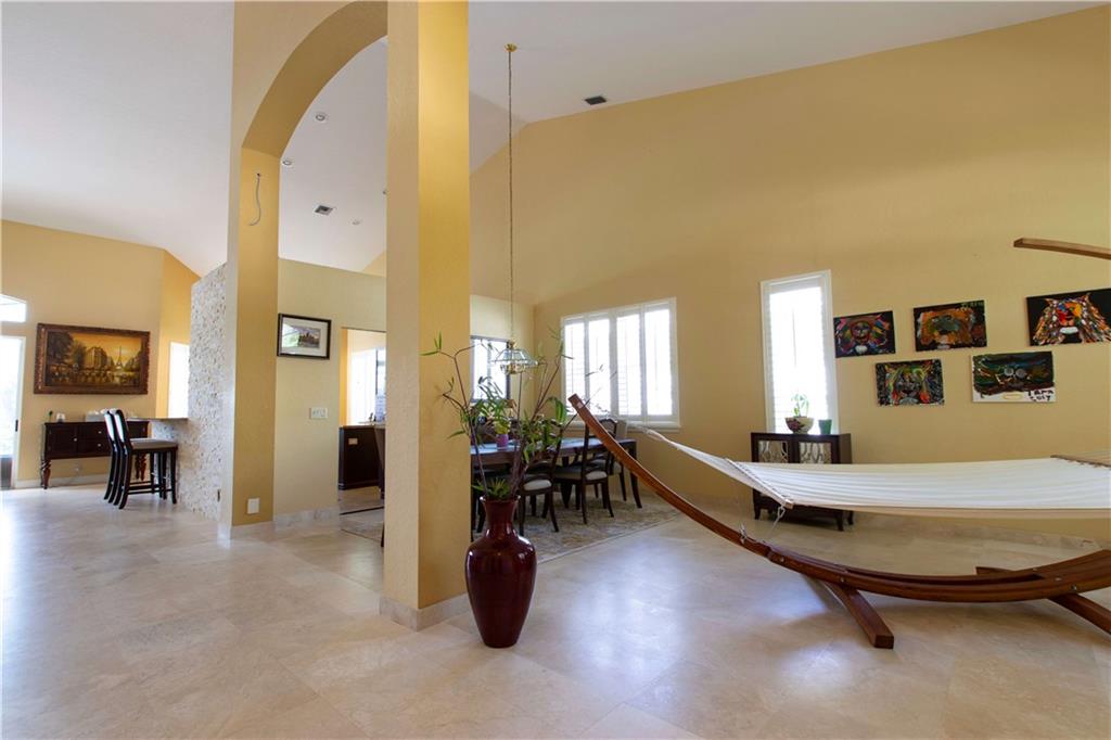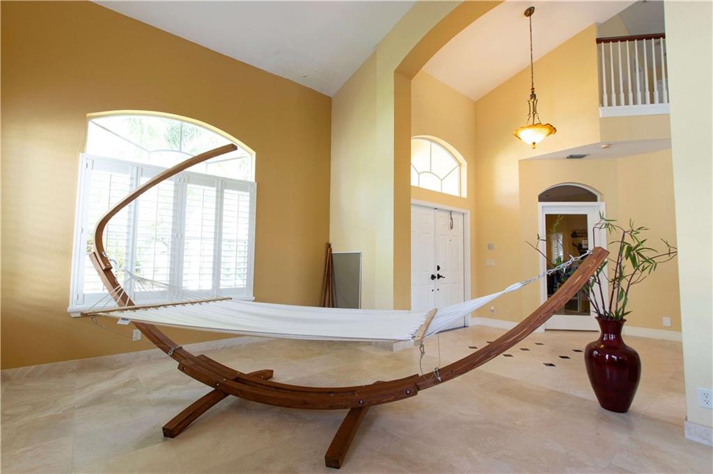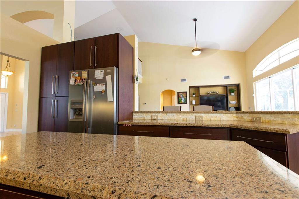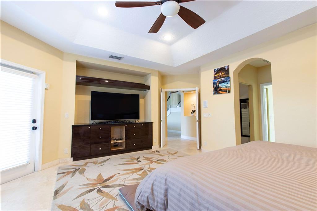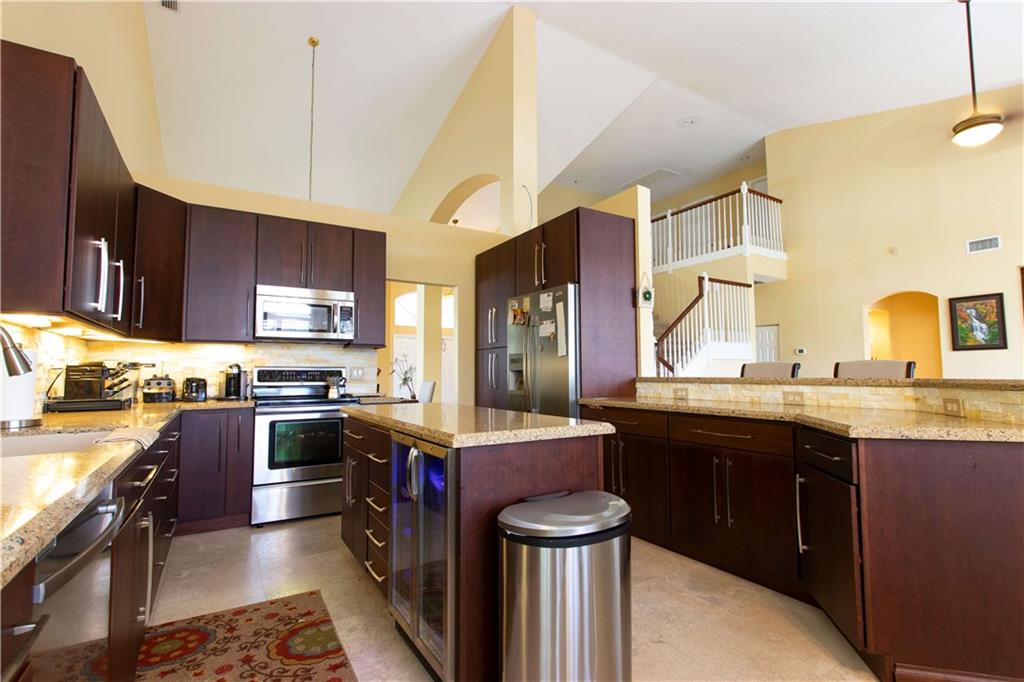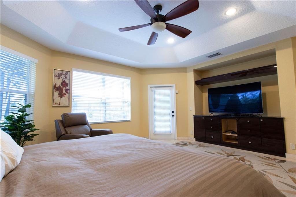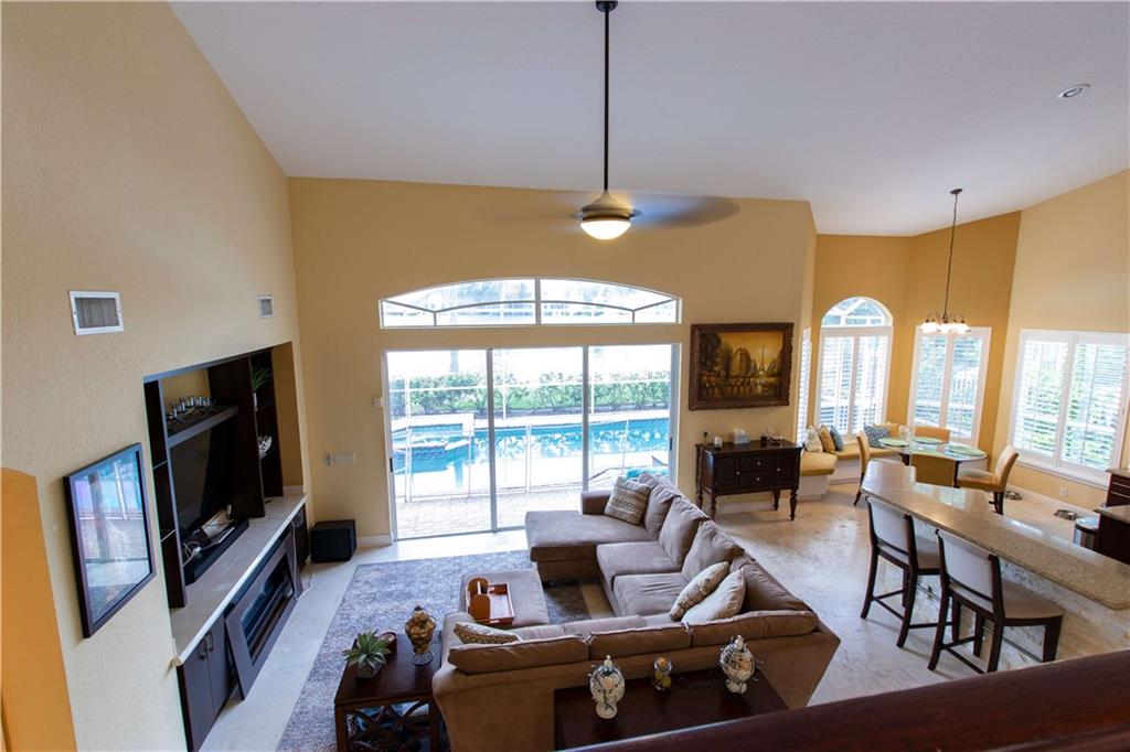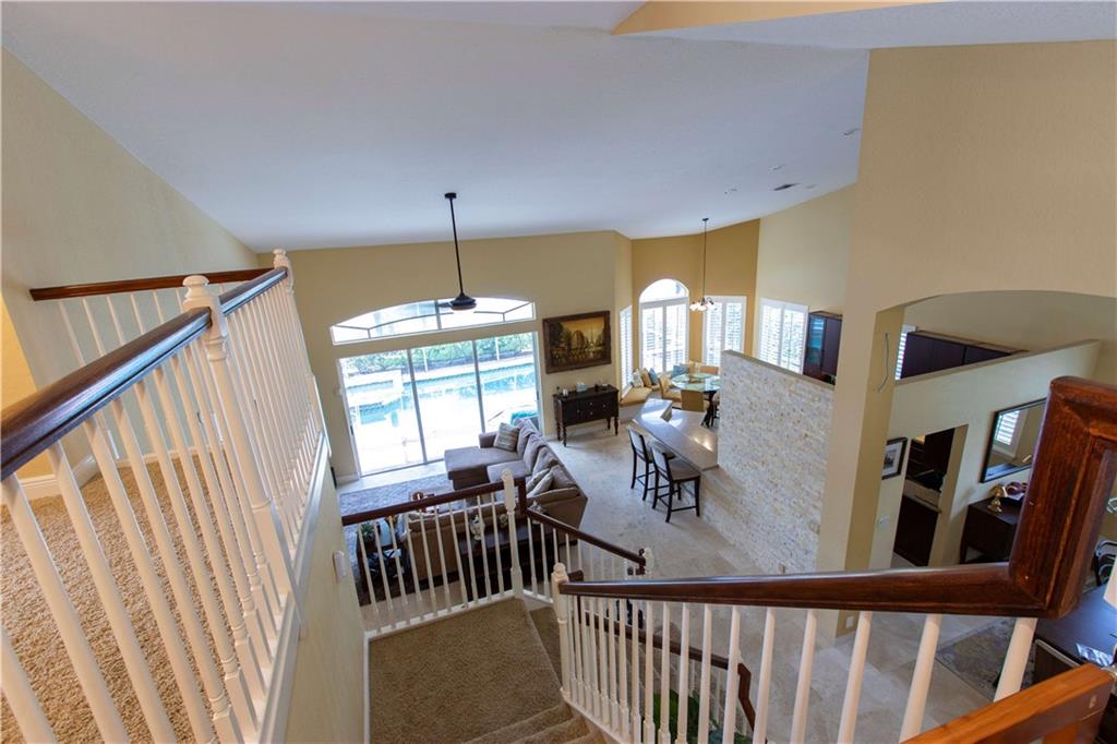 When you walk into the largest model home in the community you will immediately be impressed w/Saturnia marble floors, custom stone wall & backsplash, completely remodeled kitchen w/cherry cabinets which complements the tone of the granite counters all of which are under volume ceilings. With the master bedroom/office downstairs & the other bedrooms upstairs you can enjoy your privacy all while enjoying lake views from your window or pool area on the paver/screened patio. 5th bed is an office/den
