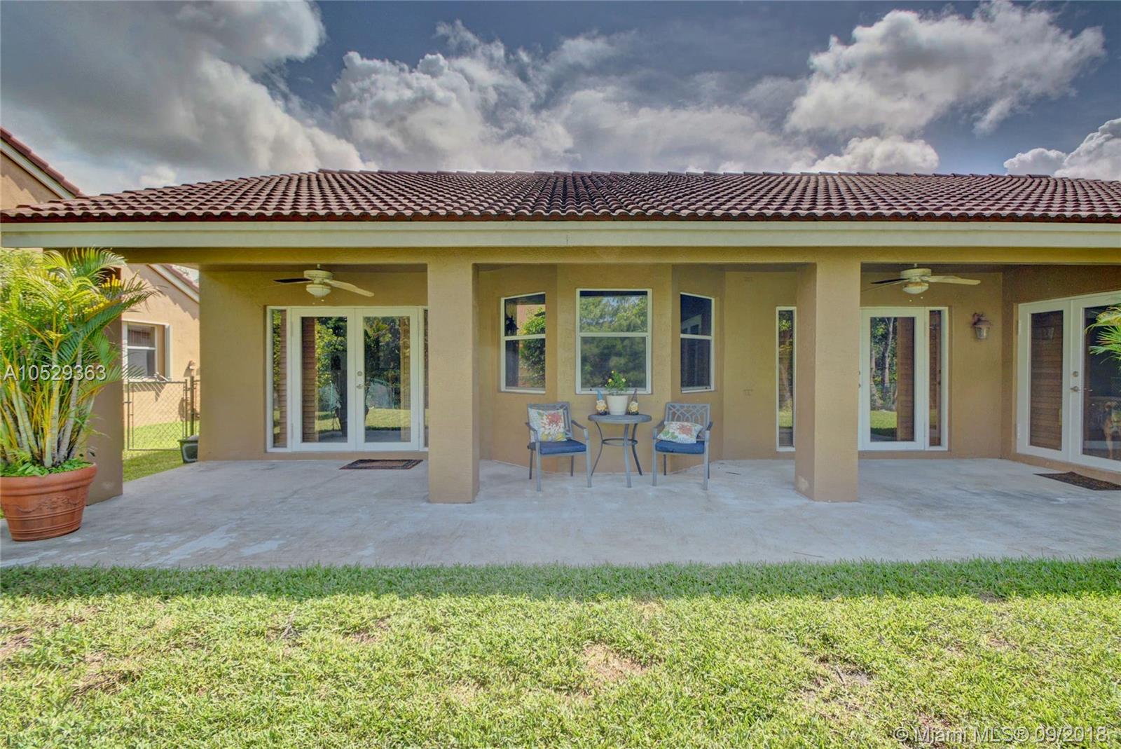 Rarely available house in Alhambra community in west Pembroke Pines. House is a one story on a large lot with no back neighbor. House has a covered back yard patio great for entertainment or just relaxing. House is very spacious and open with high ceilings. Home features a upgraded kitchen with custom wood cabinets and granite counter tops and stainless steel appliances. Both bathrooms have been upgraded. Master bathroom has double sinks with tub and shower with frameless glass and marble floors. Large master bedroom with high ceilings and large walk in closet. This house is a must see before its gone.
