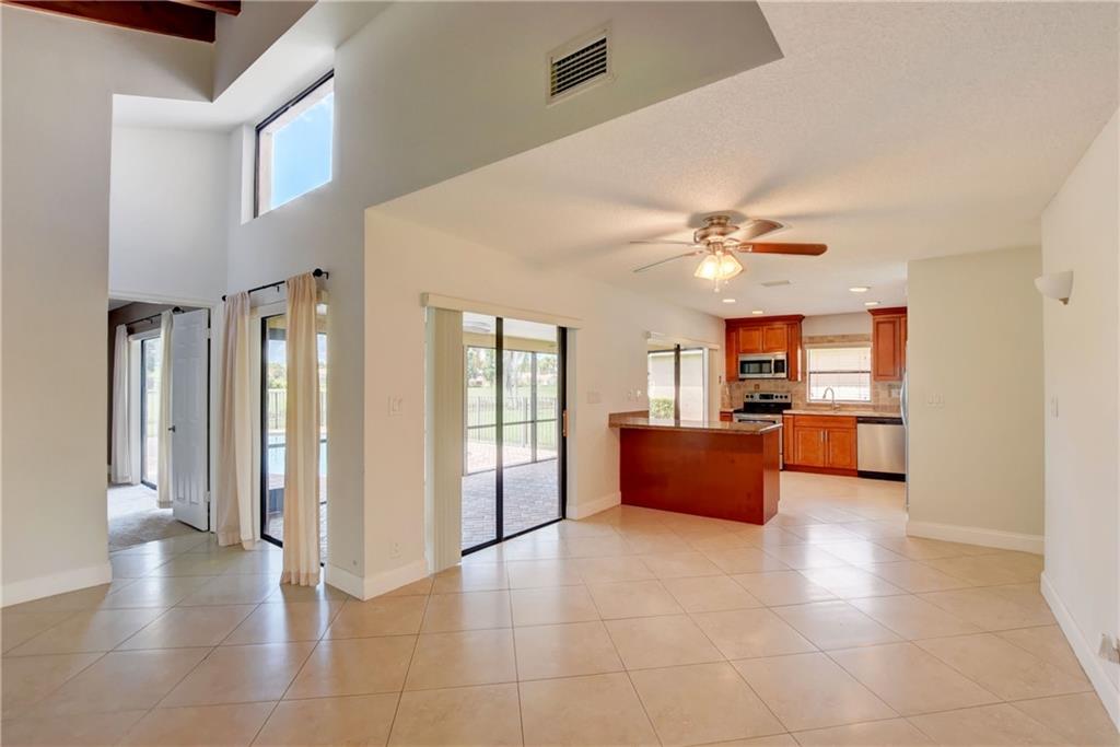 Beautiful one story pool home directly on the golf course! Home is turnkey. Just move in. Features 3 bedroom, 2 bathroom split plan, open floor plan, beautiful wood ceiling work in living room, and updated kitchen and baths! The sliding doors and huge windows keeps the entire house bright and airy! Relax in your screened in patio or enjoy sitting outside by the pool overlooking the canal and golf coarse. The AC was replaced last year. Your across the street from the clubhouse. Very private community with guard gate. No golf membership required!