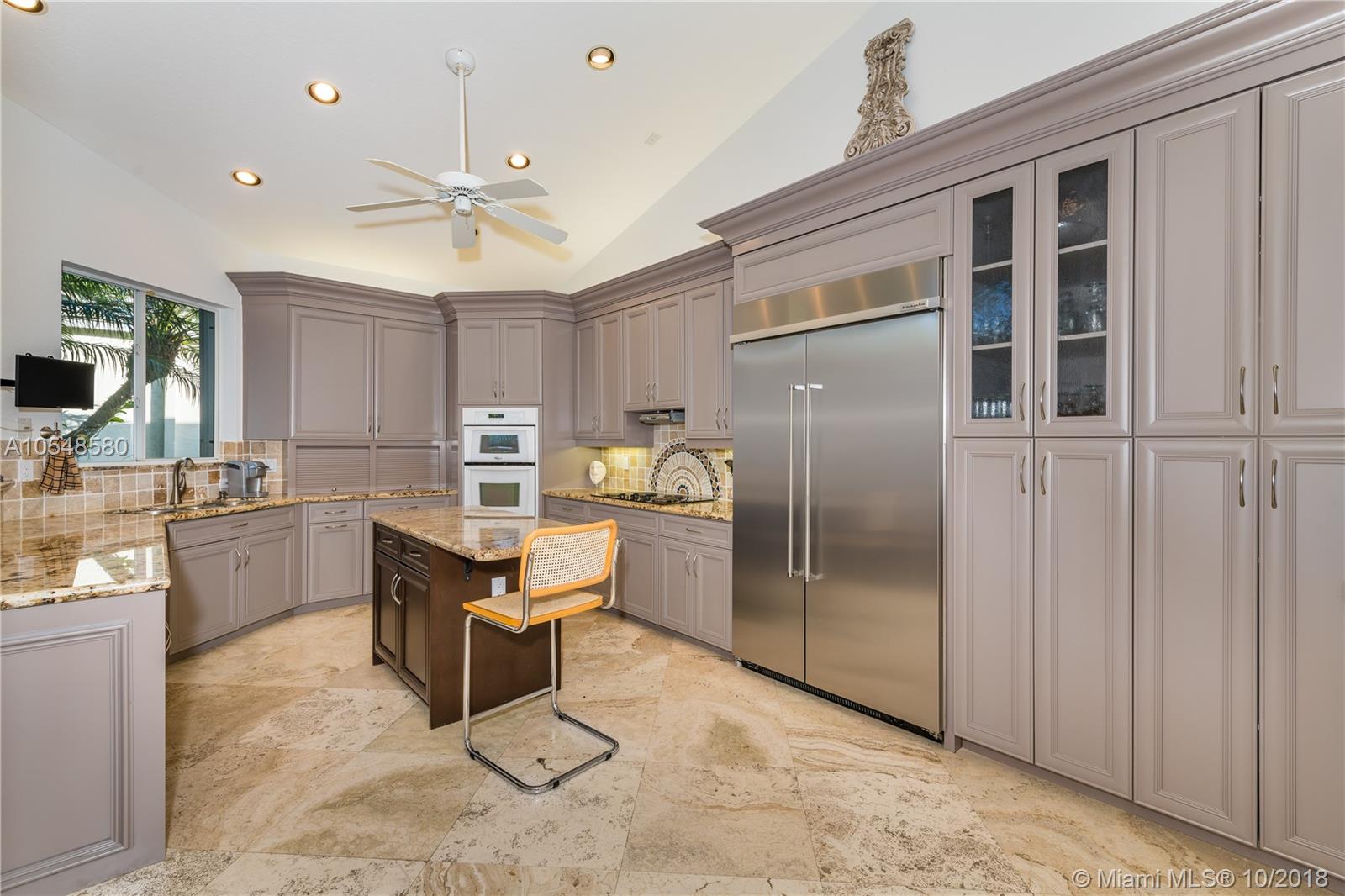 Rarely available stunning one story home in Fully Maintained The Fairways at Weston Hills.This 3 Bedroom 2 1/2 bathroom home with numerous upgrades features staturnia marble flooring with carpeting in the master bedroom. Updated Island kitchen with new appliances.Features kitchen aid refrigerator warming drawer and tumbled marble backsplash. 16' ceilings throughout living area and a magnificent view of the 17th green on the tour course overlooking an-enlarged pool and patio area. Breakfast room off the kitchen and ceiling fans throughout the home.Automatic shades as window treatment with a cordial hurricane shutters. Two walk in mirrored (customized) closets with in - floor safe. Air condition is dual zone the third bedroom is utilized as a den and office. Air conditioning in garage.