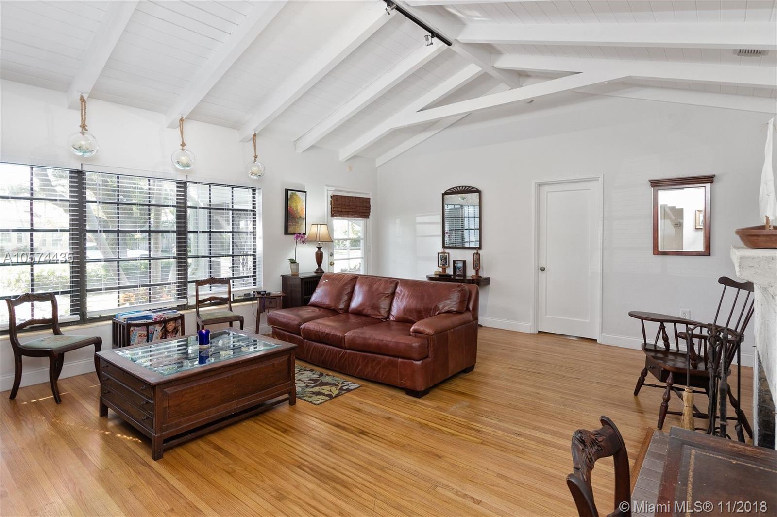 4 bedrooms and 3 full bathrooms in Miami Shores. Huge lot with room for a pool and expansion. Giant mature oak trees, 2 car carport and 1 car garage. Screened in front porch with original quarry tile floors leads to living room with wood beamed ceiling and wood burning fireplace. Formal dining room, family room, updated kitchen and laundry room. 3 bathrooms are vintage. Good bedroom split. Walk to downtown Miami Shores with its cafes, coffe shopes, restaurants, theater and more. Charming with original 1940’s detailing.