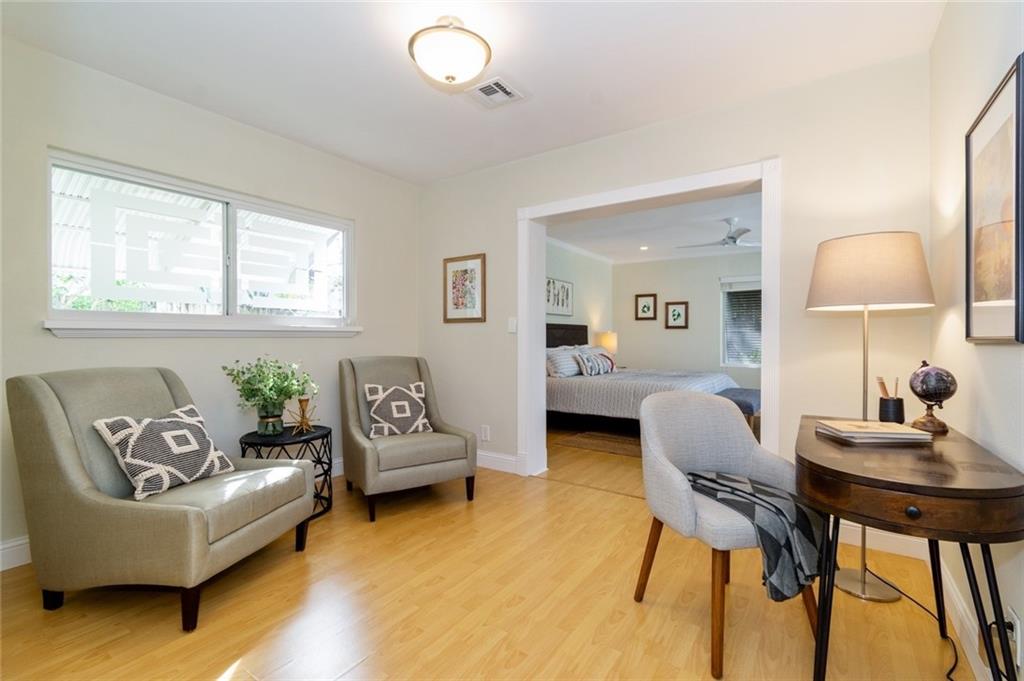 MJUST SEE, MOVE IN READY HOME IN DESIRABLE POINSETTIA HEIGHTS! A single story mid-century modern 2 BR/1 BA home, with the original third bedroom tastefully converted to a dining room, features impeccable renovations throughout. Today's modern finishes with original charm maintained. Top of the line stainless steel appliances in completely expanded kitchen, with open bar to living room, perfect for entertaining. Handcrafted built-in media center/library includes wall mounted SmartTV with no visible wires and custom cedar closets throuhout. MBR boasts sitting/dressing/home office area, with private access to deck and lush gardens. Landscaping is meticulously maintained and creates a private oasis to enjoy year round. SEE IT TODAY, MOVE IN TOMORROW!