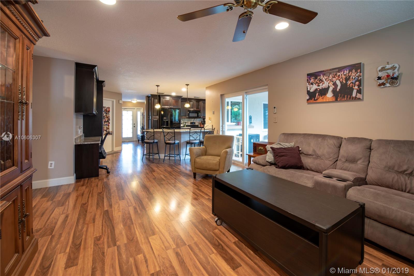 3/2 with a 2 car garage on a corner lot in desirable Flaming Gardens. This updated Flamingo model with Split bedroom floor plan and “Complete” impact windows, doors and garage door is move-in ready. New custom kitchen with stunning granite counters, wood cabinetry and pullouts in the pantry. Right off the kitchen is additional built ins with work area. The kitchen overlooks a large family room and has a pass thru window to the patio great for entertaining. Master bedroom has a walk in closet with built- ins. The master bath has dual vanities, an oversize shower complete with a spa shower head. The yard is fully fenced with double gates in the back. There is Circular drive for additional parking. No HOA ! Griffin Elementary School is on the same street within walking distance.