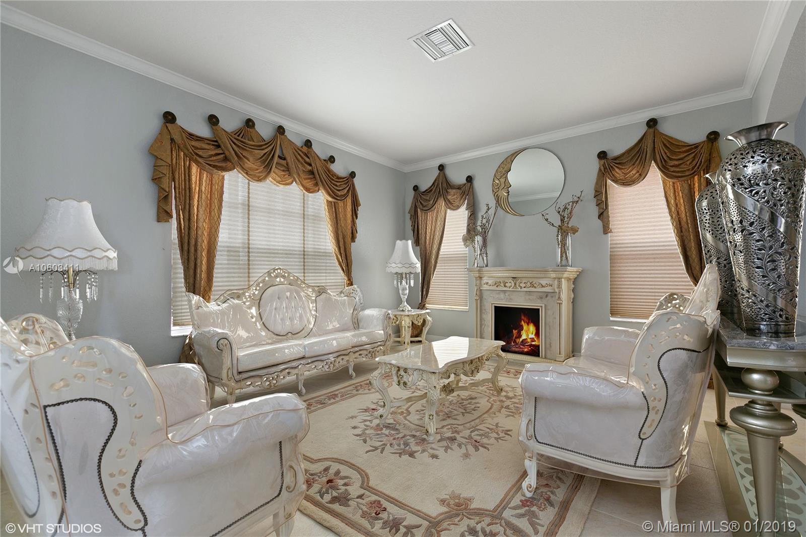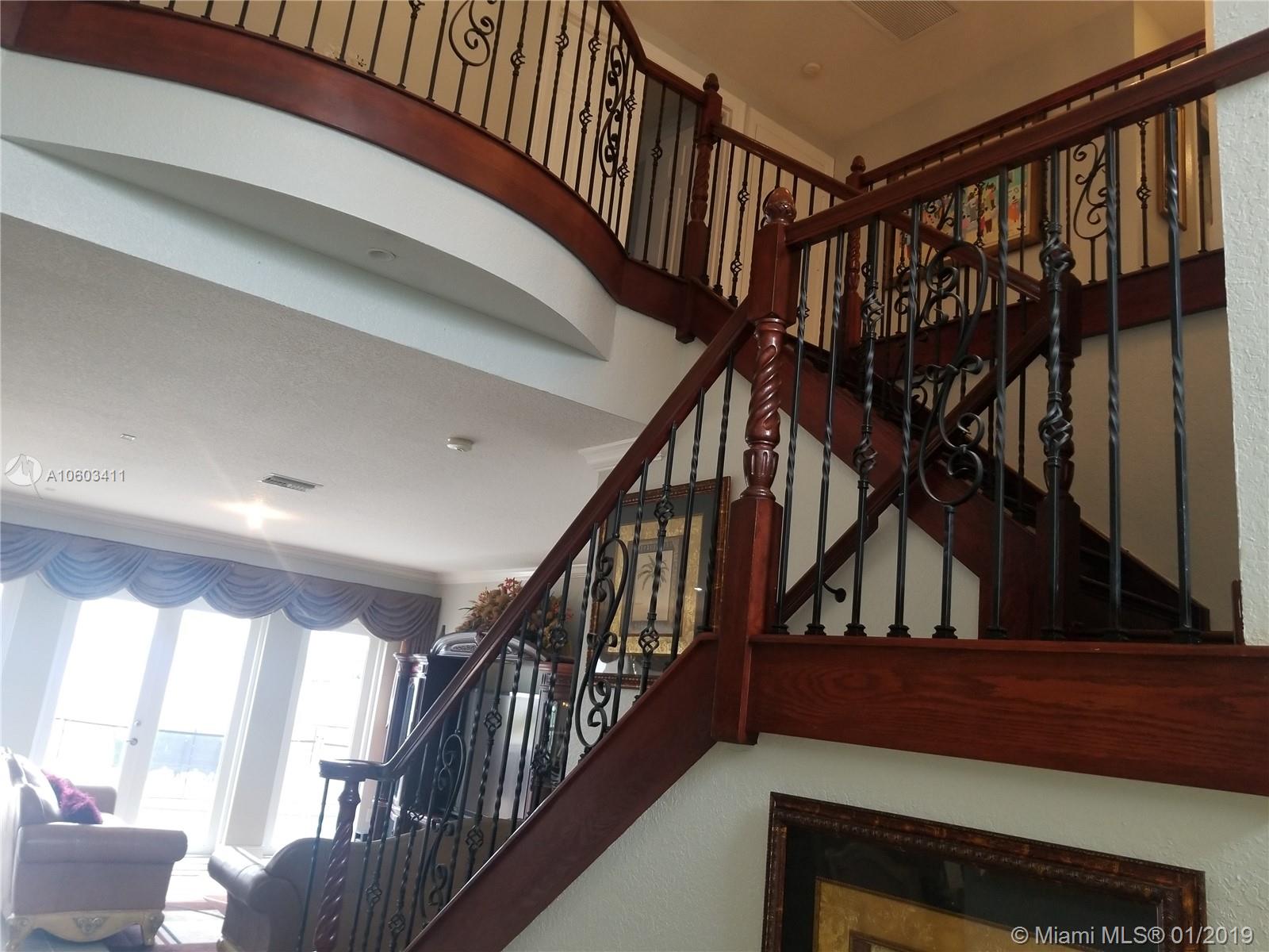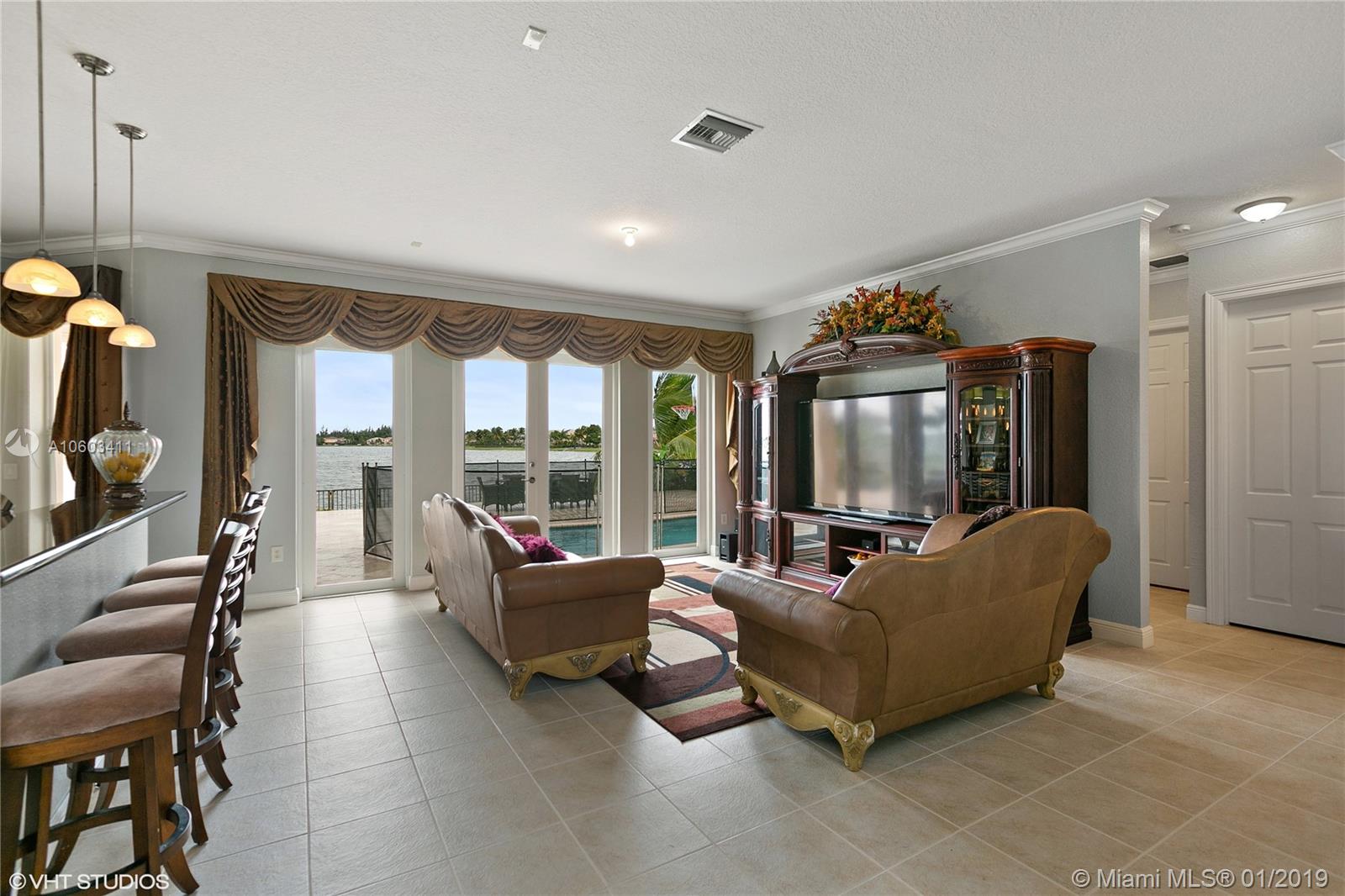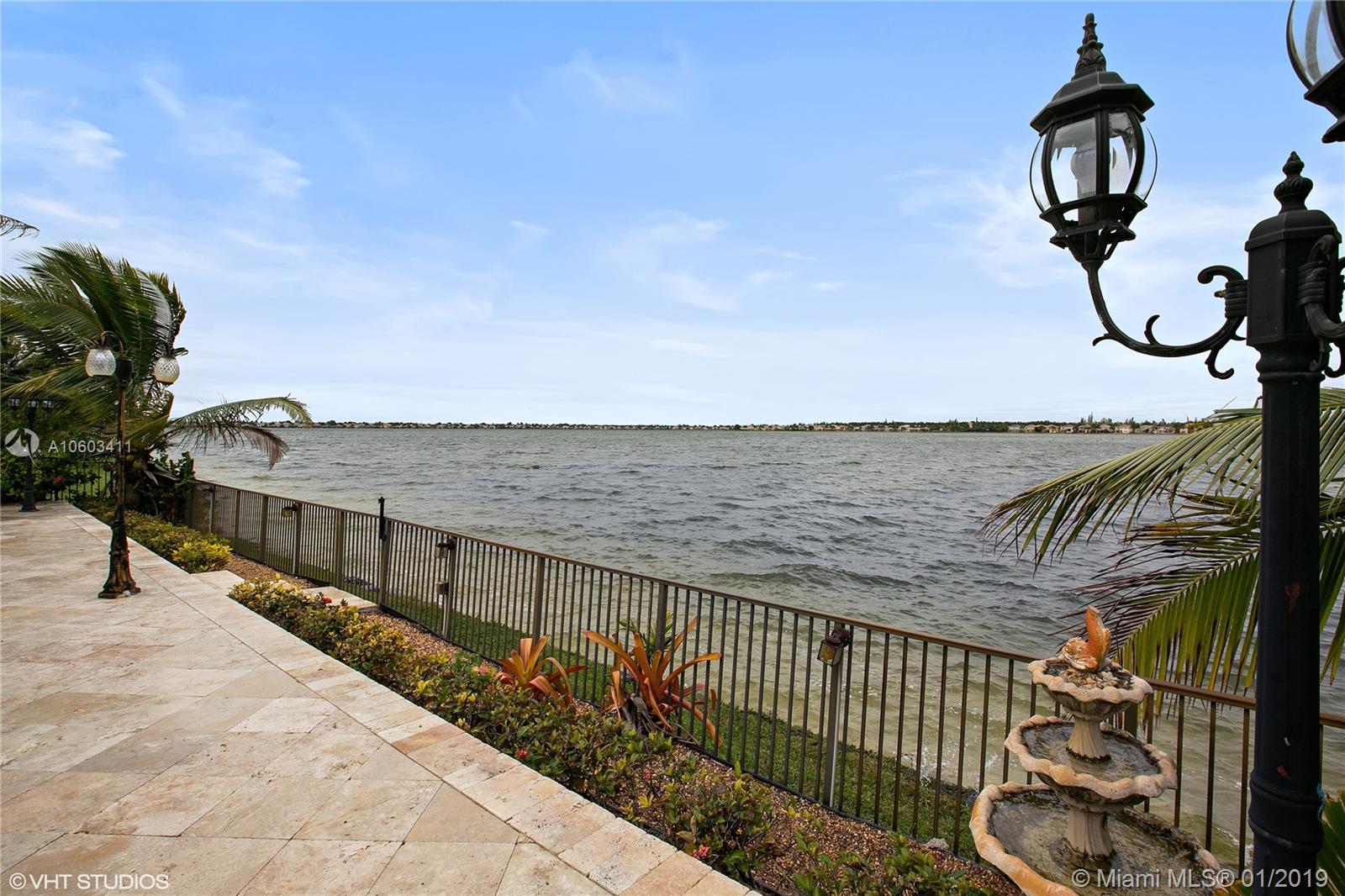 Step inside a spectacular estate home and be greeted with exacting standards, premium finishes and spellbinding panoramic lake and pool views. This over-sized home features a full bed-bath downstairs, entire home freshly painted with newly renovated kitchen with custom cabinets, stainless steel appliances, granite counter tops and spacious breakfast area. Custom mahogany and wrought iron staircase, marble flooring throughout the first and second floor, recessed LED lighting with high doors and ceilings throughout, custom curtains, crown molding, shutters for all openings. Wrought iron fencing encompassing the spacious peaceful and entertaining patio area, automatic irrigation system, heated pool with tank-less water heater , illuminated walk up and pool area. Secured gated community.