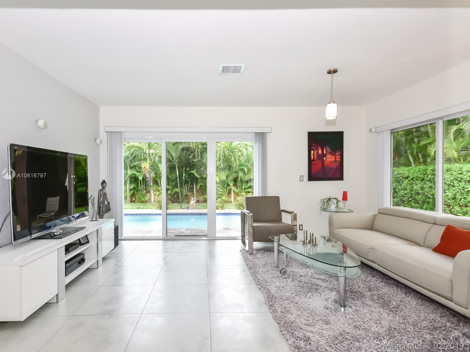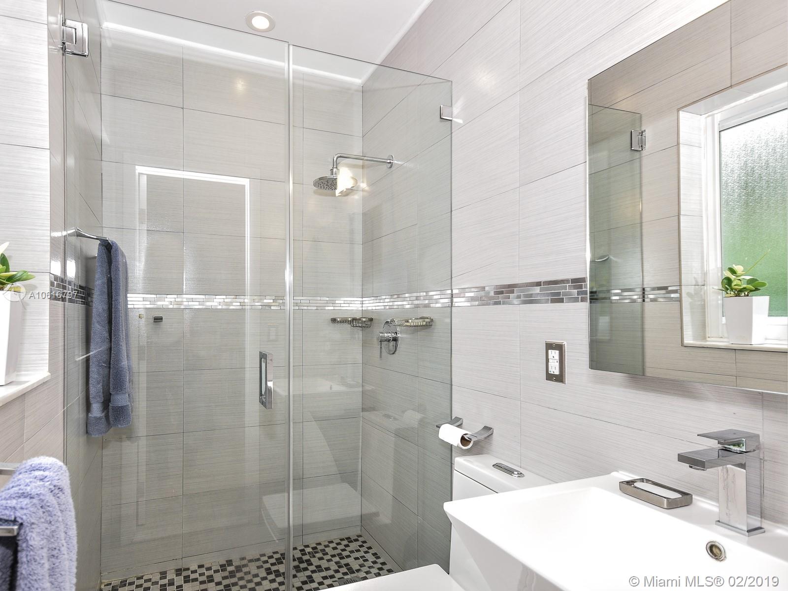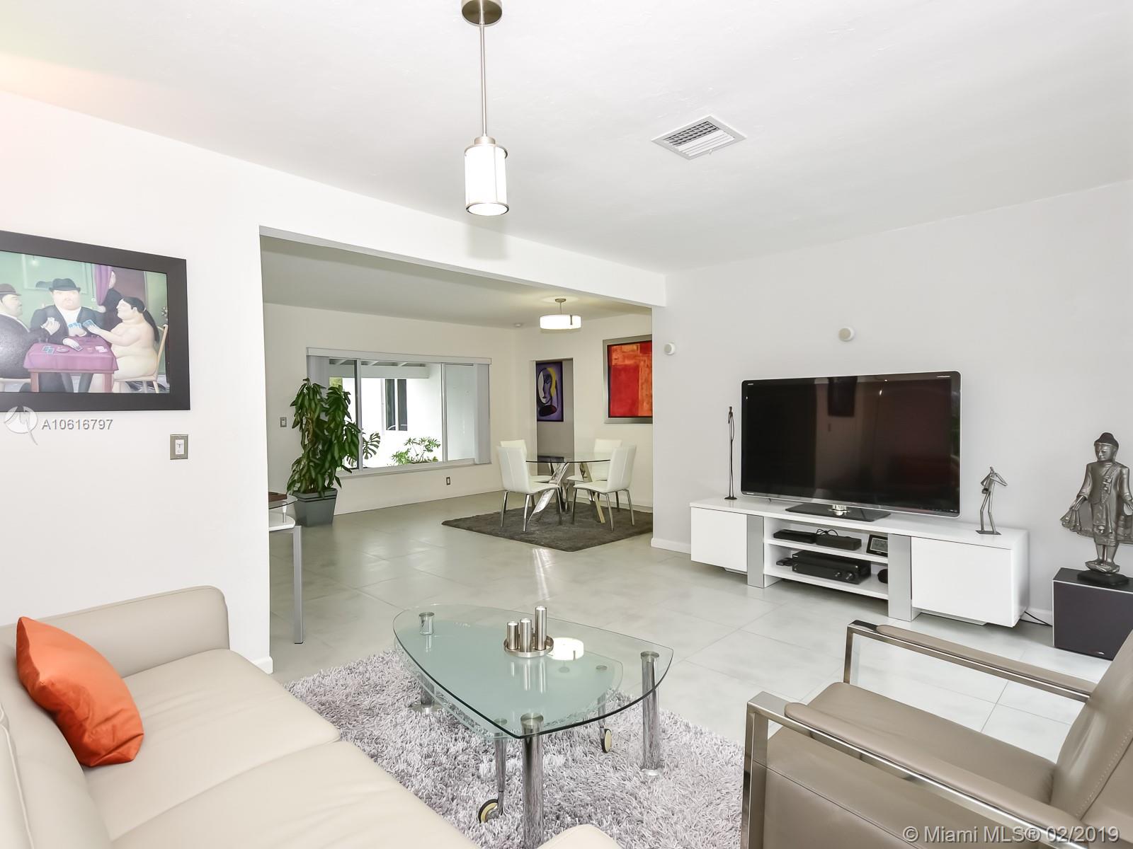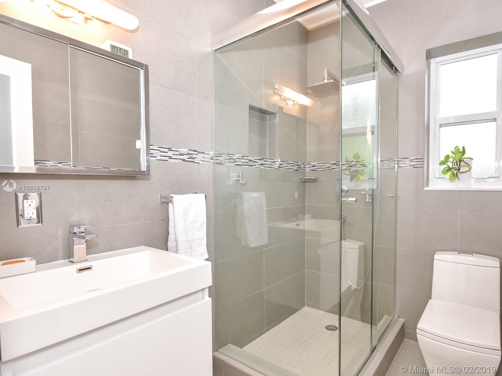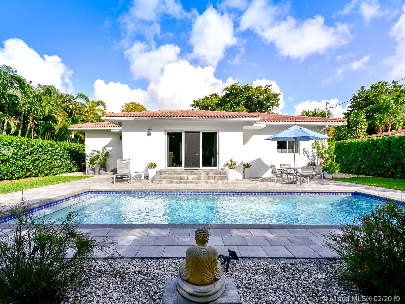 Meticulously remodeled with no expense spared! This delightful Mid Century 2 beds & 2 baths features a gorgeous kitchen with SS appliances and quartz counter tops that opens up to a spacious living room and backyard, new porcelain tile throughout, new bathrooms, spacious master suite with custom walk in closet, hurricane impact windows & doors and much more.Located on a quiet block in Miami Shores, the resort style backyard has been tastefully landscaped, has a salt water pool and a large patio which is perfect for an afternoon barbecue or to host a family gathering. Additional features include new plumbing, updated electric and a converted garage which is ideal for a home office or additional bedroom. Within walk-in distance to local shops, restaurants, the theater and much more.Turn Key!