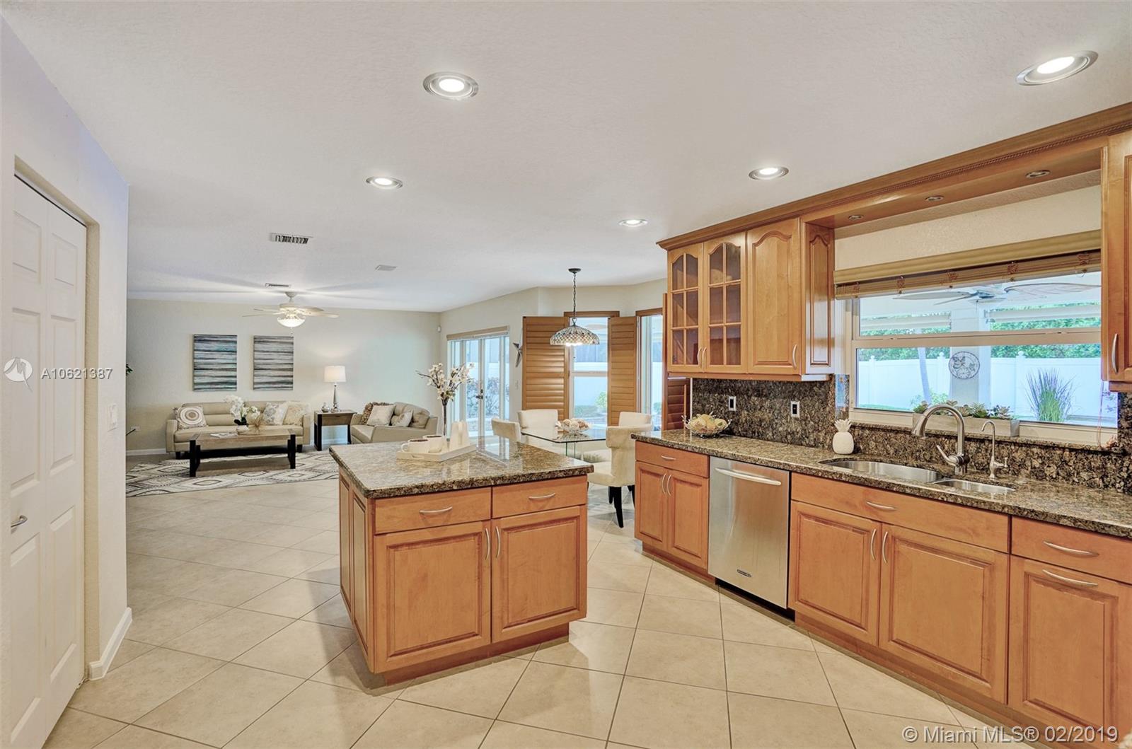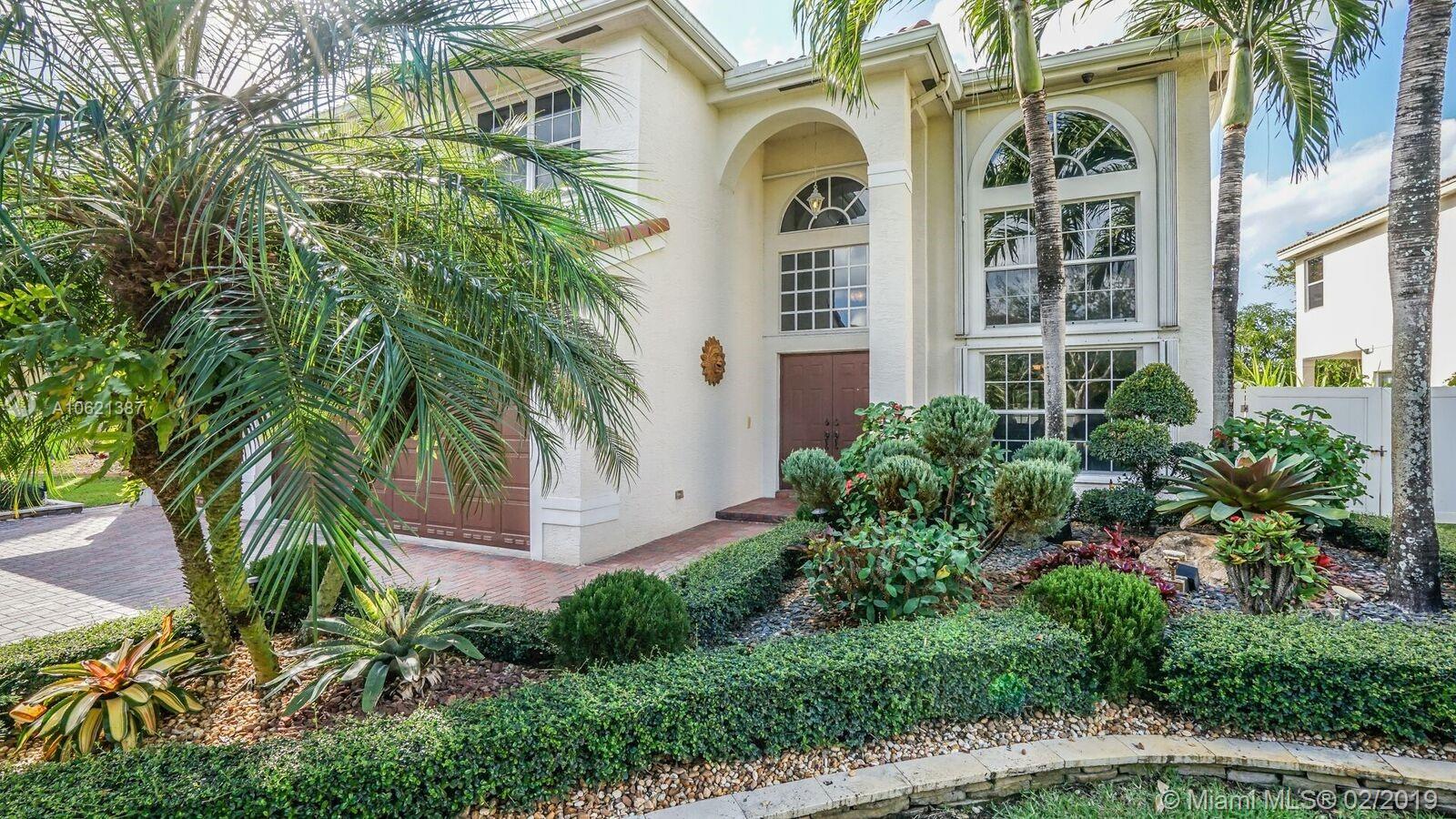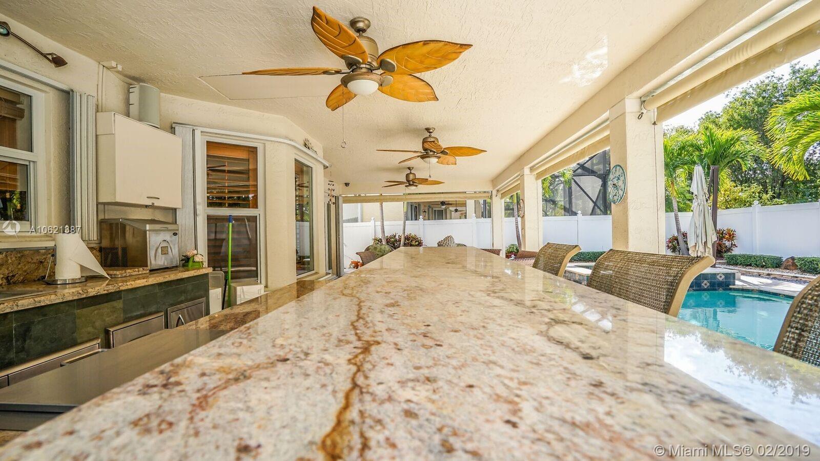 Enjoy South Florida Living!!! Over $100,000 in upgrades in backyard alone, incl outdoor kitchen, salt chlorinated, heated pool and spa, 15x30 covered patio w/awnings and shades. $22,000 spent in landscape design. Felicia/6 model with 5 bedrooms, 3 full baths, family room, sitting room off master bedroom, 3 car garage and stunning 2 story ceiling in living room and dining room. Light-filled home. Kitchen with 42" cabinets, granite, 4yr old top-of-the-line Kitchen Aid appliances. Remodeled Master with glamorous over-sized shower and remodeled modern downstairs bath. IMPACT GLASS for all, but four windows. Accordion & panel shutters. A/Cs 6 yrs old. 5yr old 51 gallon water heater. Water softener, water filtration system, alarm with high-definition cameras, intercom, & plantation shutters.