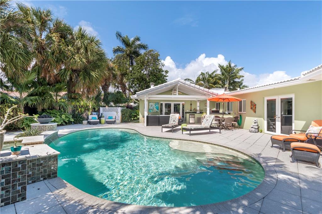 Experience the WOW factor from the lush tropical curb appeal to the exquisitely updated interior inspired by contemporary design. This E. Ft. Lauderdale residence is situated on and oversized lot in the Bayview Elementary school district, within walking distance of shops, restaurants & mins to the beach & parks. The bright spacious floor plan is conducive to today's lifestyle with a gourmet kitchen that overlooks an enormous great rm & formal dining area for intimate gatherings. The spacious master suite & lavish bathrm provide the ultimate retreat. Multiple doorways blend indoor & outdoor living spaces to a covered loggia & summer kitchen which overlook the cascading waterfall & heated salt water pool & spa. Side yard, 2 sheds, home generator, tankless hot water & more. Sq ft. from IMAPP.
