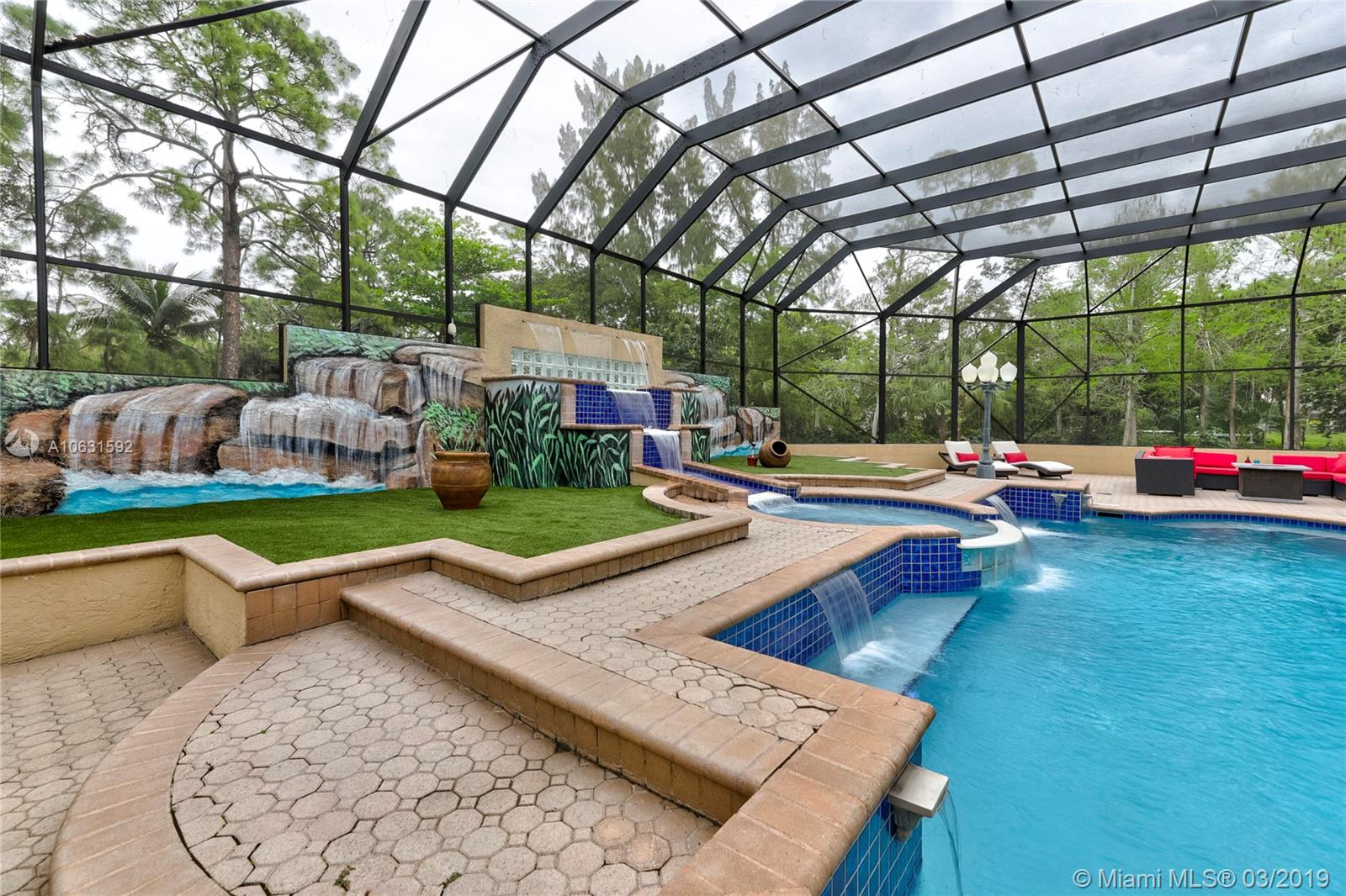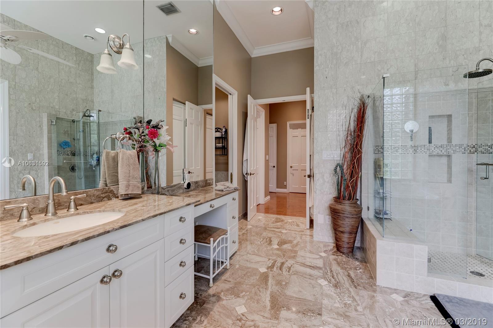 Impeccable 4,800 SQ FT home built in 1994 on 1.25 acre cul-de-sac lot in prestigious Whispering Woods. This is the only community in Coral Springs with 1+ acre lots that is 24-hour manned and gated. Stunning grand entrance invites you to this 4 bedroom/5 bath (3 full & 2 half) with marble tile floors. Home also has a den and a gym. Master suite has two walk in cedar closets with cabinetry. Dream kitchen has been totally remodeled with top of the line Thermador appliances, Silestone Quartz countertops and an oversized island. Kitchen has a built-in wine refrigerator and a built-in microwave drawer. There are three working gas fireplaces and two attics with floors for storage. Laundry room has Bosch large capacity washer and dryer and plenty of cabinets.