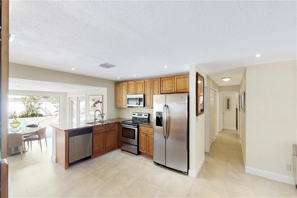 Totally renovated 3/2 located seconds from interstate and Turnpike. Yet the east of 95 location makes the beach a short drive or bike ride away. The home boasts a new roof in 2016 and new vinyl privacy fence in 2018. Both bathrooms and kitchen are updated, and there is a wall of pantries with pull out drawers. AC is also recent, as well as the porcelain floors and recessed lighting. The backyard is a tropical paradise with newly tiled pool and paver deck. The pool cabana is currently used as a home office.