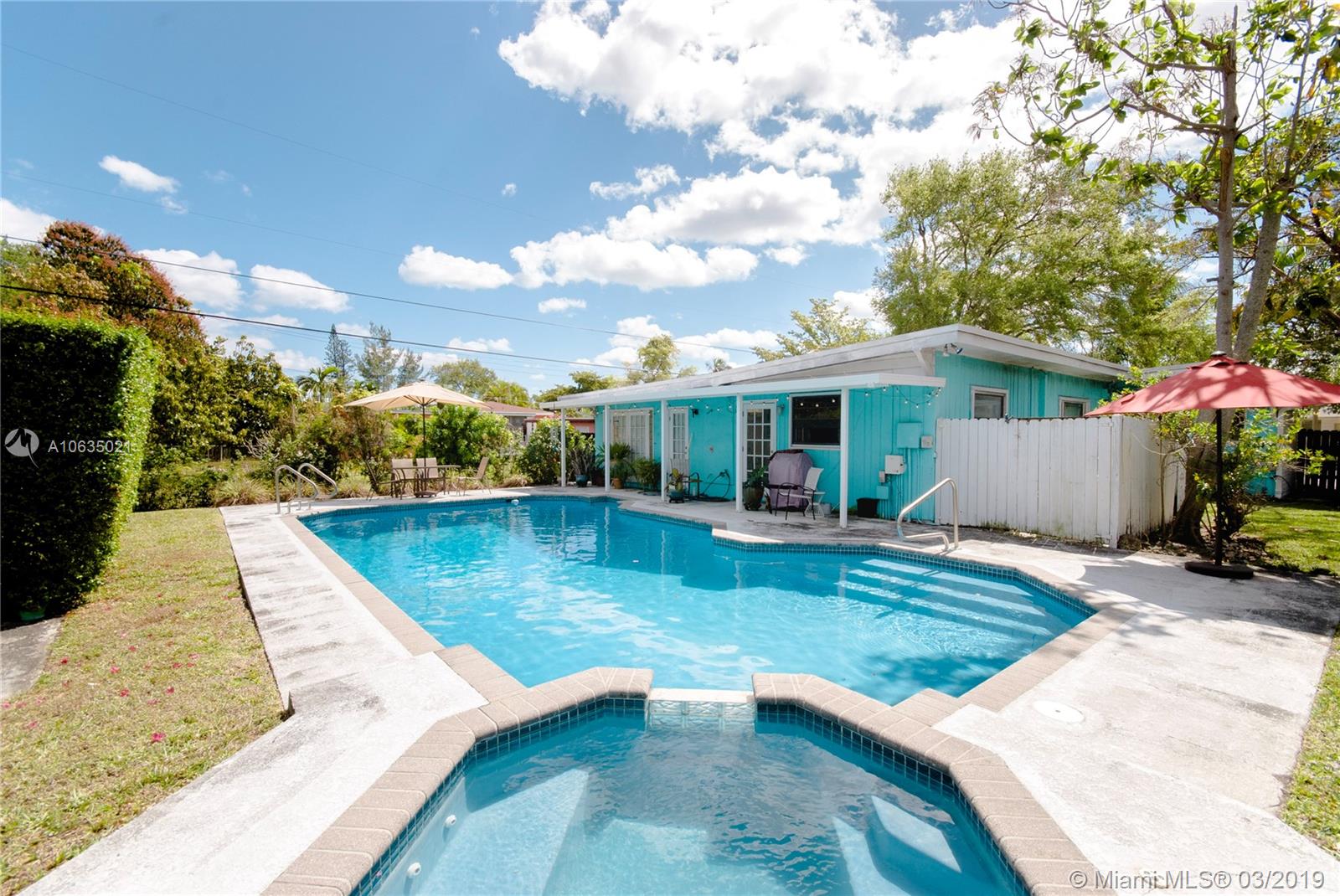 Beautifully designed mid-century home on oversized lot, close to everything. This home features a total of 3 bedrooms, 2 of them can serve as masters and 2 bathrooms, one of them is a cabana with access to pool area. The lot is completely fenced in and private with stunning tropical plant species and separate garden structure for storage. Kitchen, living room, and dining room have open plan concept perfect for entertaining. Corner lot with circular driveway and stunning approach waiting for the perfect buyer that appreciates this home's charm.