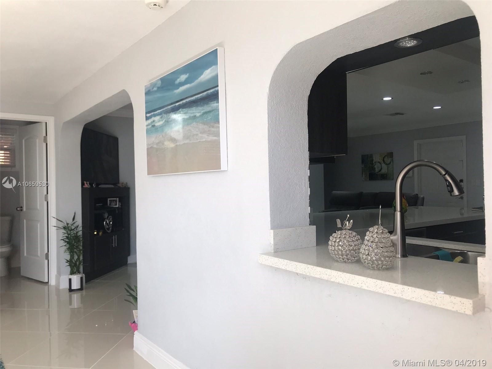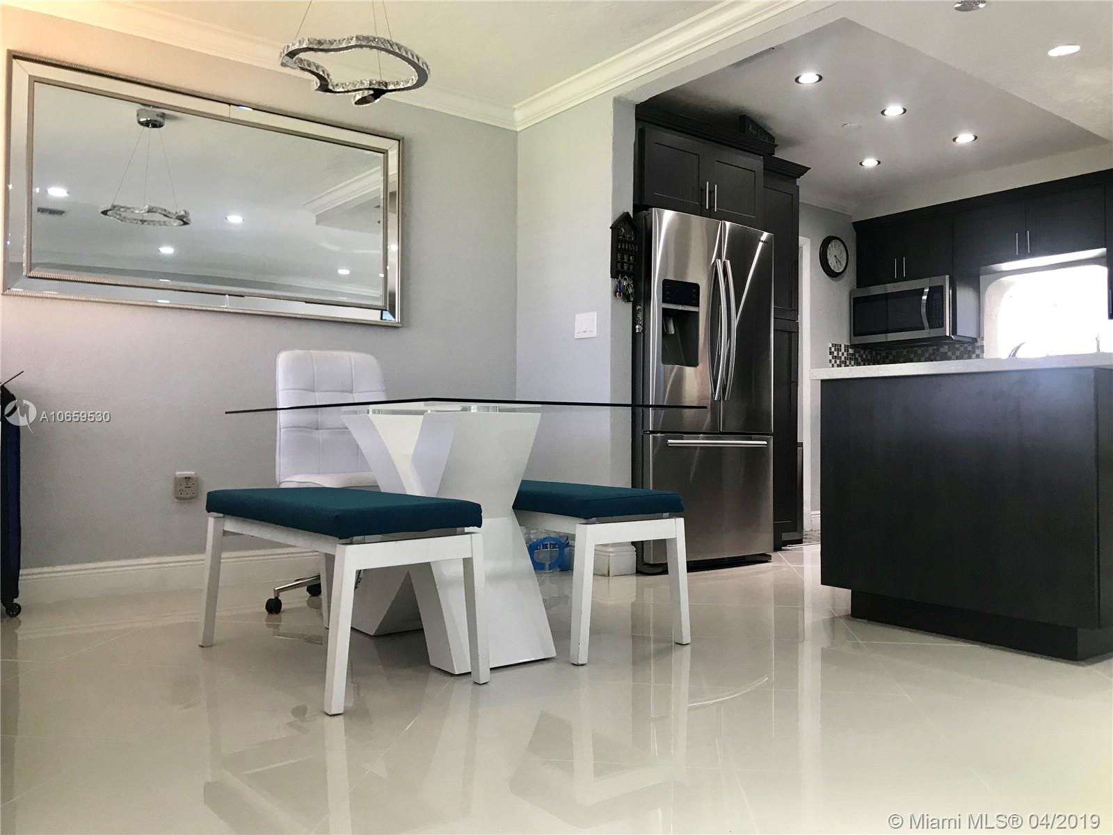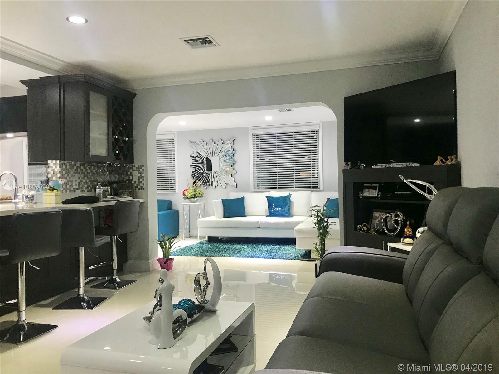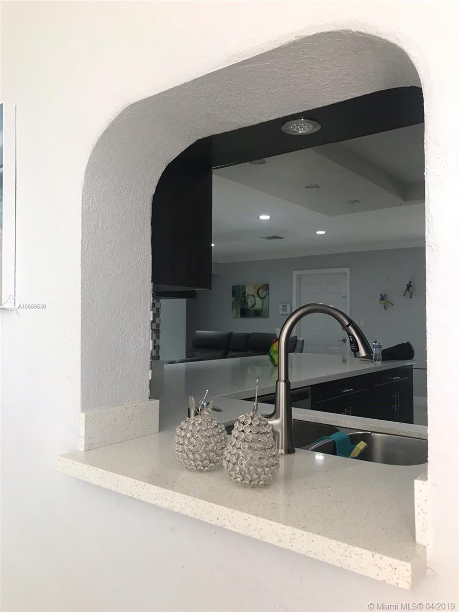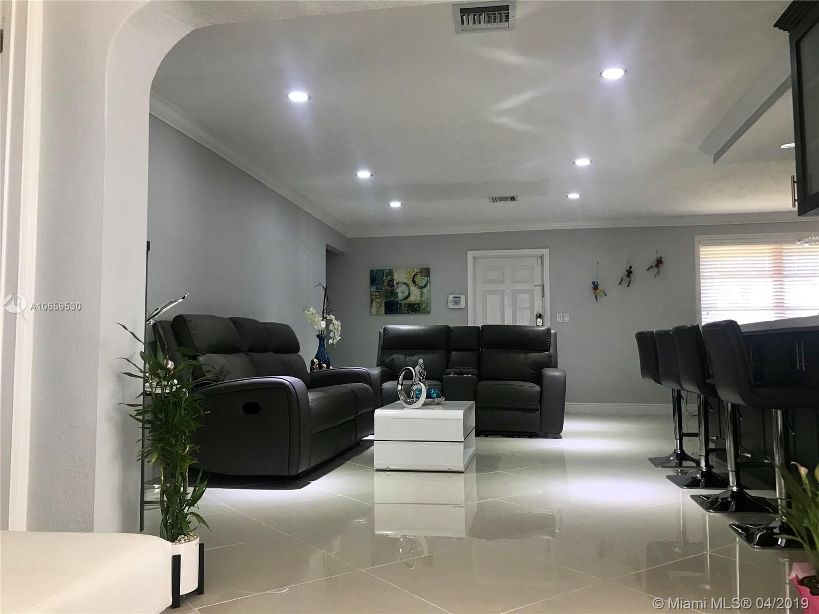 Updated single family home. Features Porcelan 24" tile, custom kitchen with spacious island & underneath storage, quartz counters, glass back splash, wine storage cabinet, soft closing drawers, stainless steel appliances, matching tv console, build in closets, led lighting, newer roof, concrete stamp spacious back yard with built in lighting, reflectors and electrical, impact back windows, french doors. Brand new bathroom with shower. Bedrooms are spacious. It has a newer roof, insulated walls, crown molding, front door with lock system.. Cameras are included. Has lots of natural light. Separate laundry room. This property is beautiful and move in ready. In the heart of Pembroke Pines, no HOA fees, close to the new Pines Center, hospitals, parks, highway, grocery. Will not last!