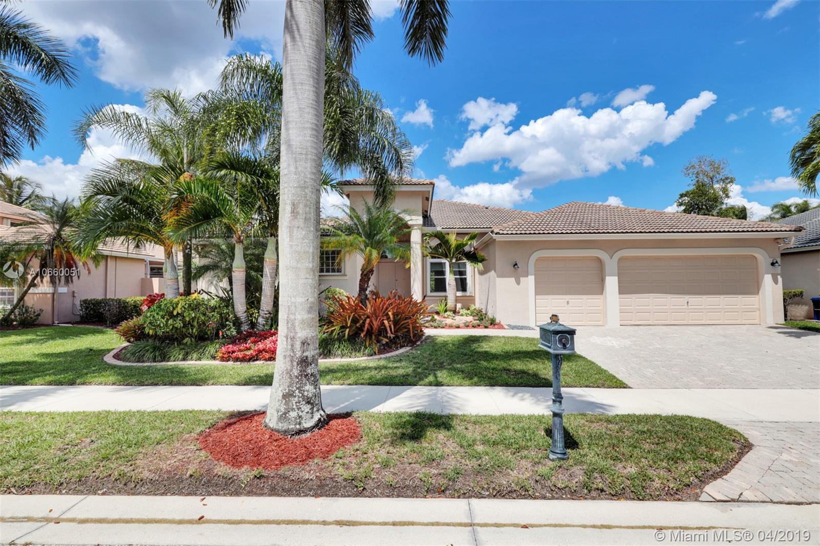 Custom built 3-way split floor plan offers 5BR/4BA/3-car garage. Brick paver driveway and entryway. PGT Premiere Vinyl Impact glass window and doors with Low-E glass (2015) plus accordion shutters. Freshly painted interior and exterior (2019), Ceramic tile floors in social areas; engineered wood flooring in MBR and one bedroom and laminate floors in 3 bedrooms. Newer stainless steel kitchen appliances, wood cabinetry and granite counters. Very private backyard, saline chlorinated (2018) and heated (2014) pool, diamond brited (2013). Newer 2-zone A/C (2015).