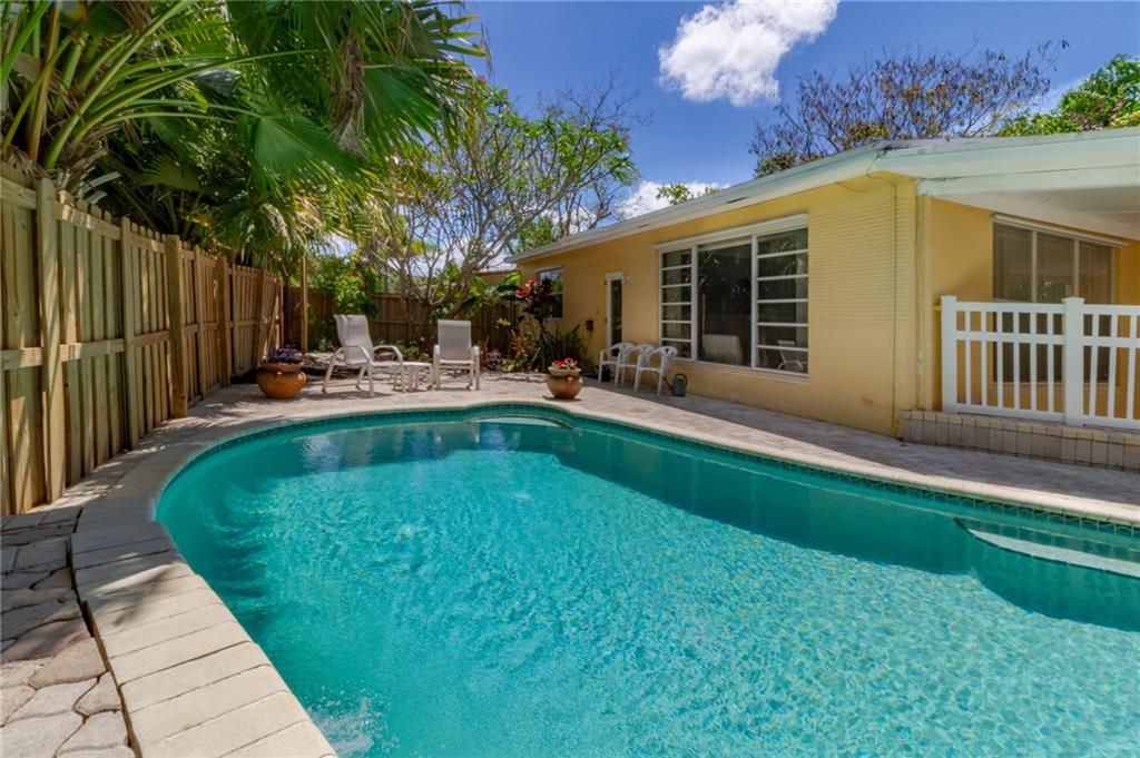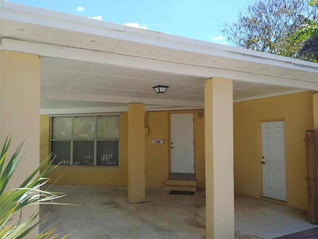 don't miss the photos for this charming home on an oversized and lushly landscaped corner lot. the pool area, in full view from the dining and step down living area add to the beauty of this home. polished terrazzo throughout for easy care and living. the geographic positioning of this home makes for lots of natural light, especially in the living areas. entire property is fenced. updated galley style kitchen makes being in the kitchen easy and convenient to the raised dining area. bathroom makes good use of combo tub/shower with a window. double carport with access for a standard sized vehicle and a compact is a real plus in the florida sun. shaded patio off the dining area is easily accessible for grilling or just chillin, while the pool deck affords plenty of sunshine!