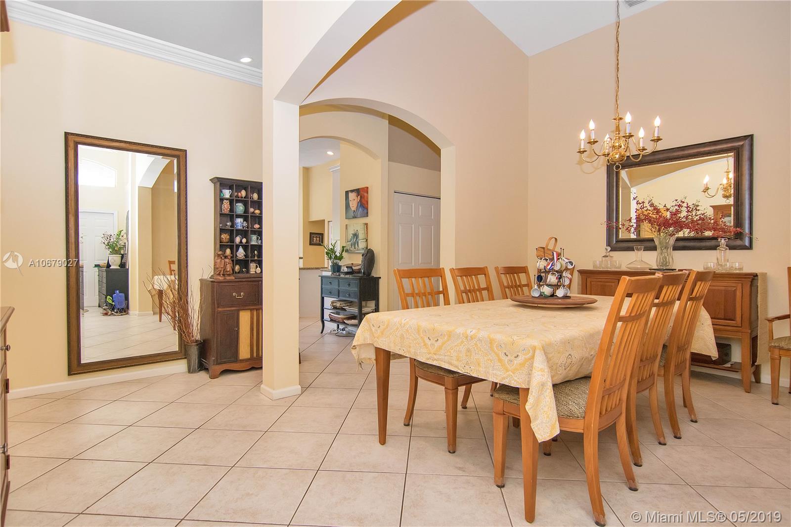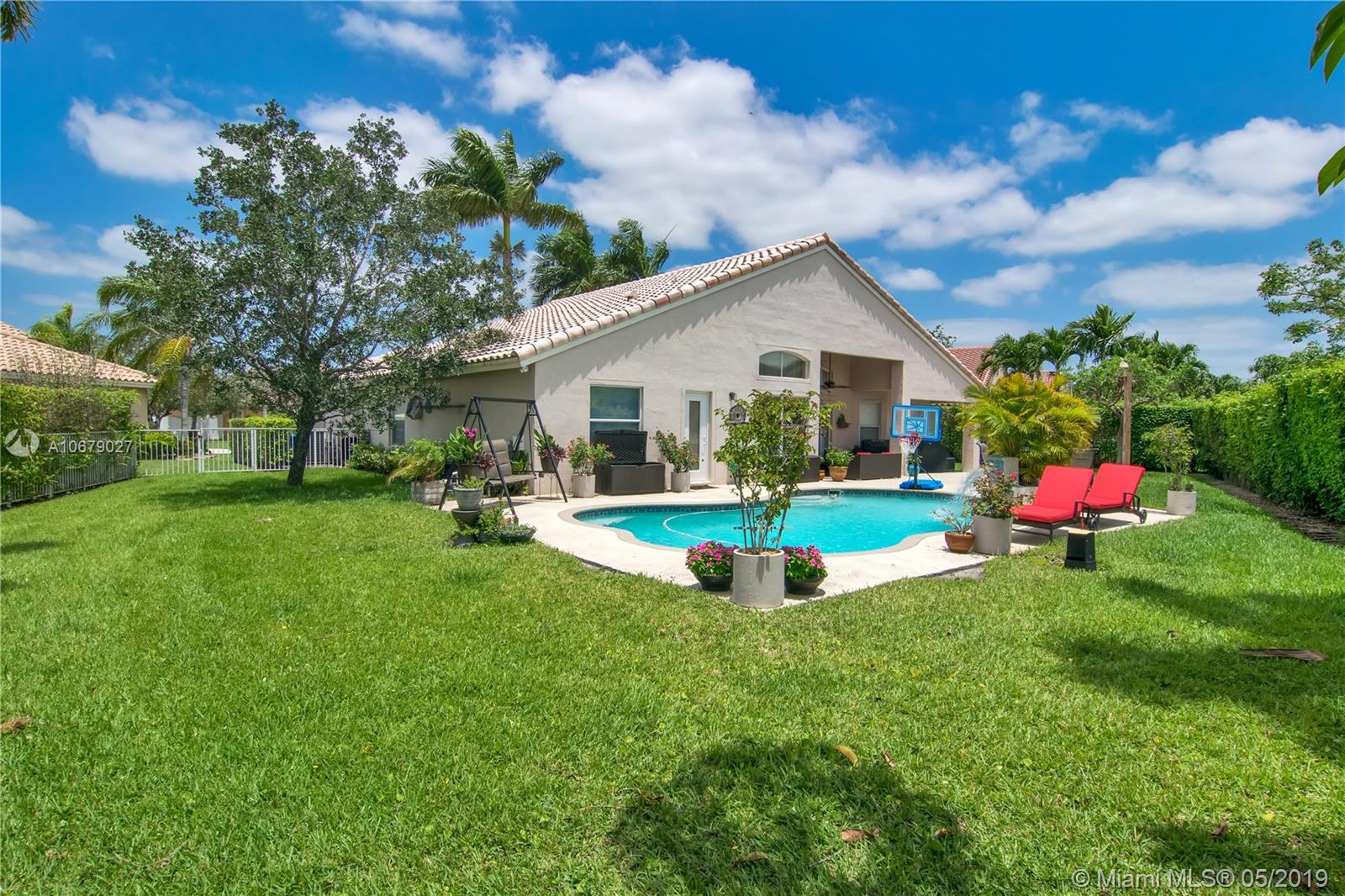 Superb tropical paradise. 5 BR, 3 bath, waterfront pool home. Spacious Embassy model on oversized, fenced, private, pie-shaped lot. Resort-level, manned gated Encantada community with two of the top schools in the state (City of Pembroke Pines West Elementary and Middle Schools) right outside the gate. Other top schools, parks, hospital, shopping and dining nearby. Upgraded kitchen w/ granite counters and breakfast bar, pantry. Double set of sliding glass doors open to covered patio, pool, gorgeous fenced, hedged yard on lake with no neighbors on other side. 2012 A/C. Community amenities incl big pool, clubhouse, tennis, tot lot, more. 5th Bedroom currently configured as huge den/office with french doors. Diagonal tile and wood laminate flooring, no carpeting.