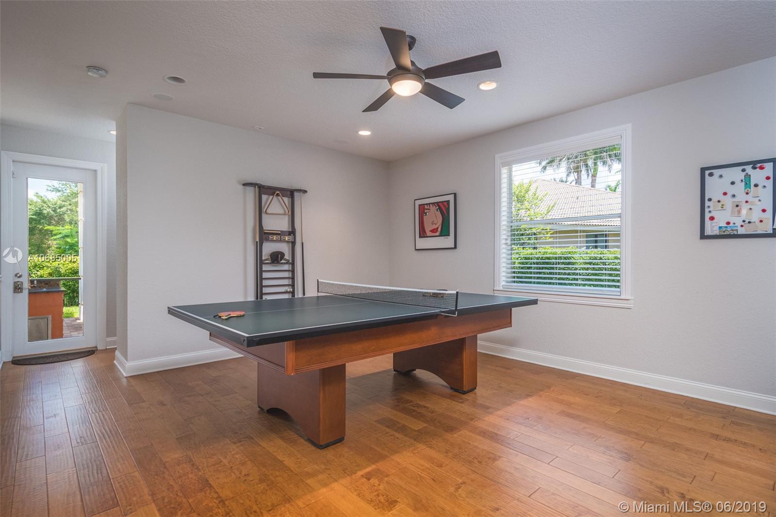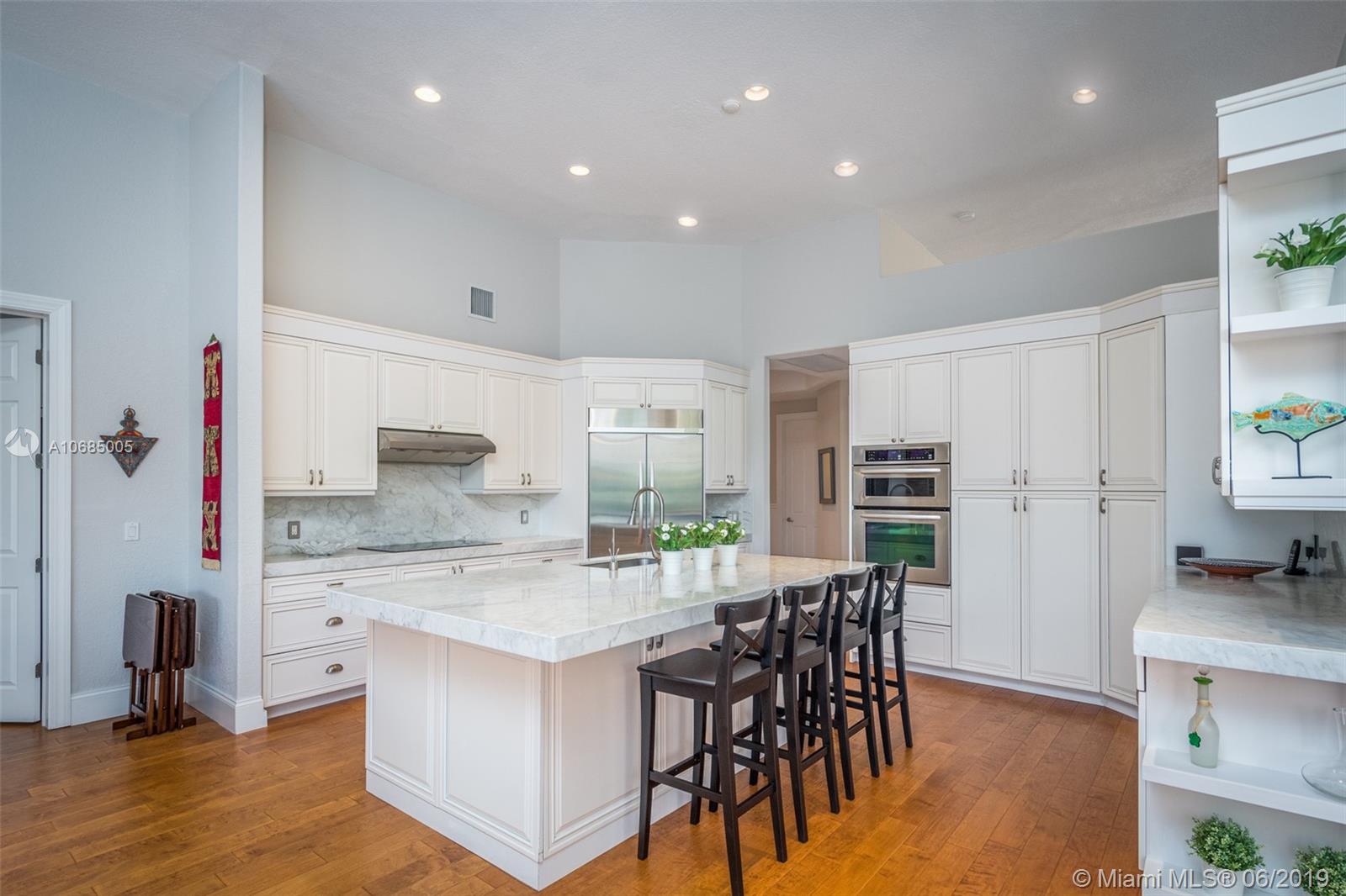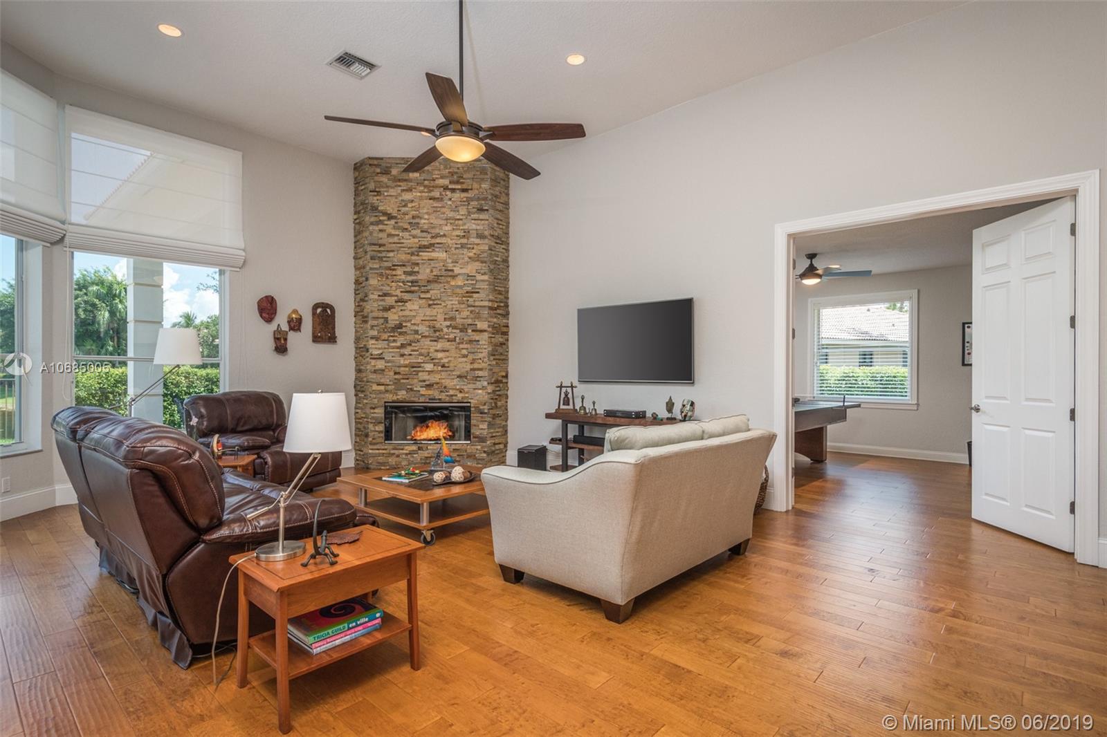 This is the one you have been waiting for. Expanded custom one story home on a private oversized 17,796 square foot lot. Enjoy long lake views with newly renovated heated pool - chlorinated but could be salt*cascading spa*spacious covered paver patio*summer kitchen*fully fenced*across the street from the community park. Chef's Delight kitchen*marble center island 9x5 with seating*top of the line Stainless Steel Appliances*Custom wood floors*Master bedroom with custom built in closet*glass doors*shoe closet*Marble Master Bath*Spa.Newer addition 2010 with full impact glass protection. Kid Wing includes large playroom*guest room*office* Newer Roof*Newer A/C's*Accordions*Fireplace
