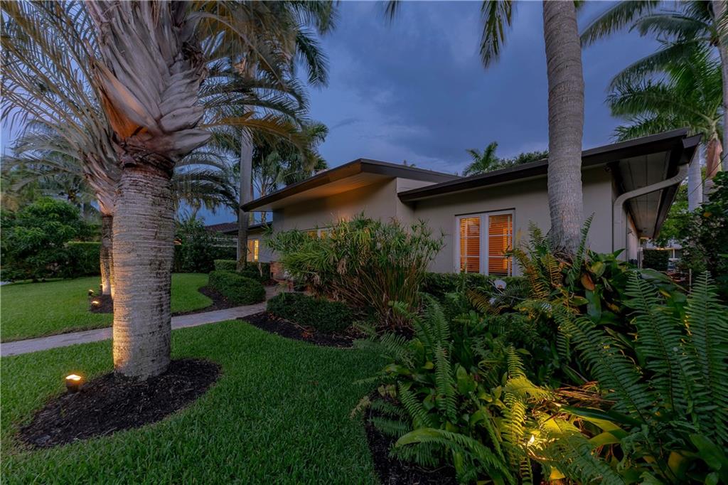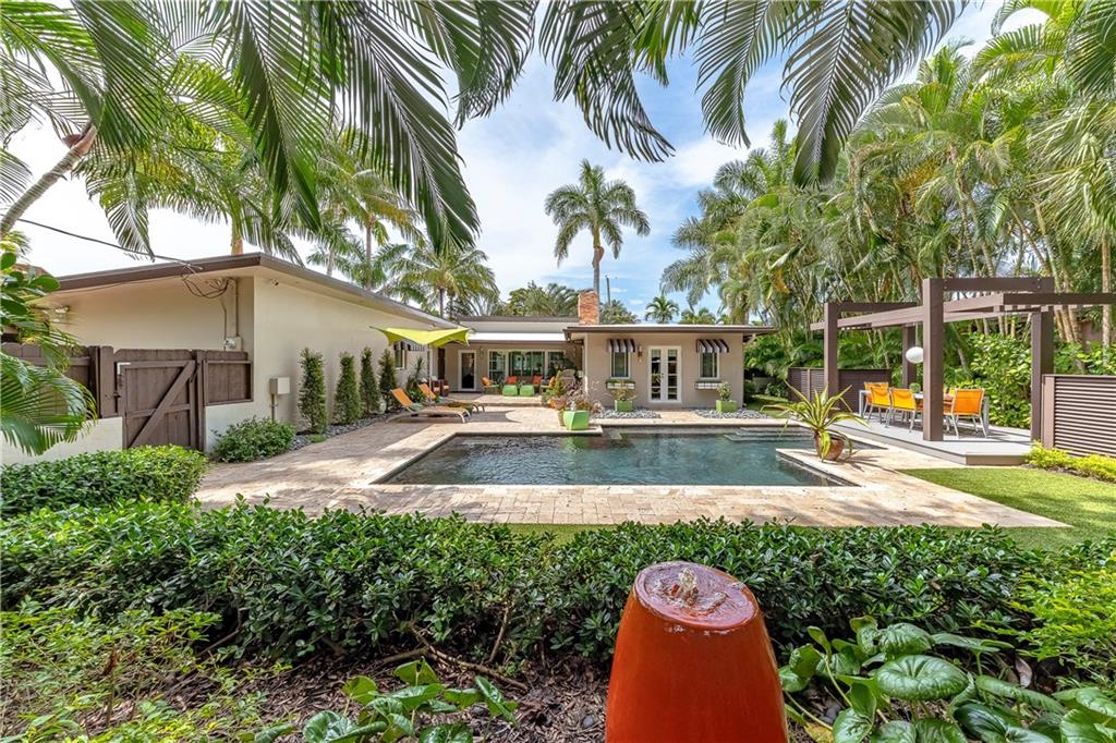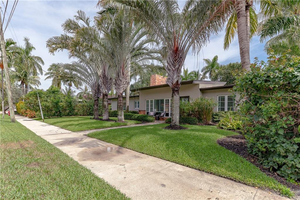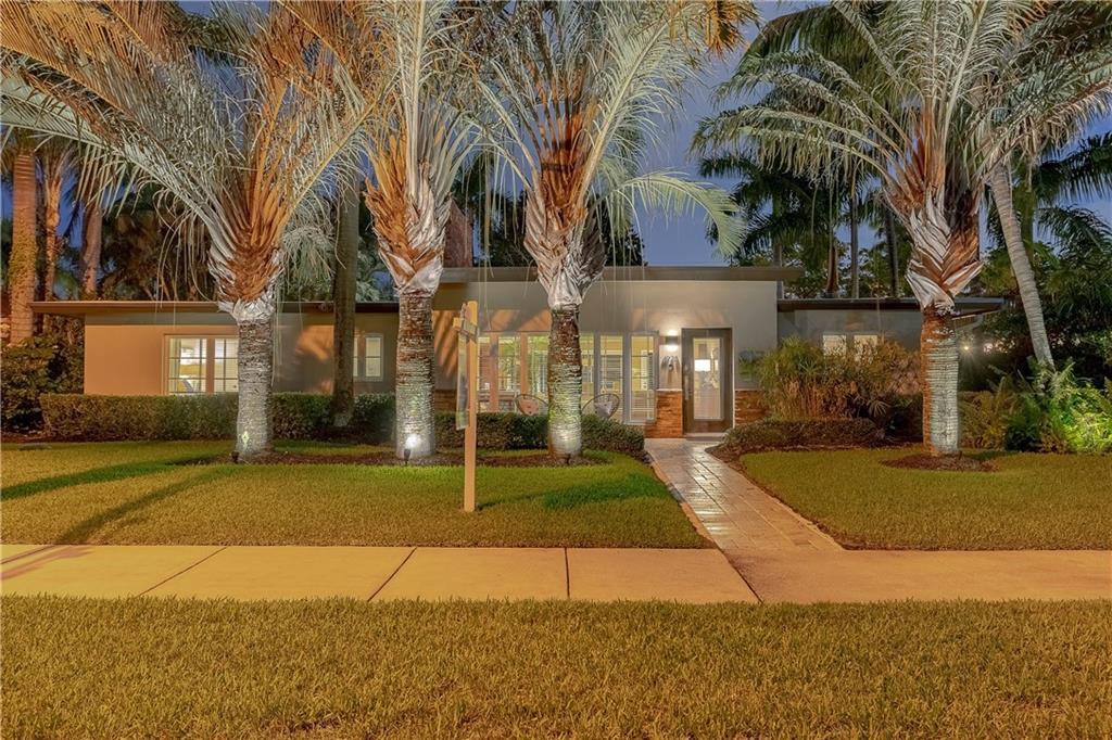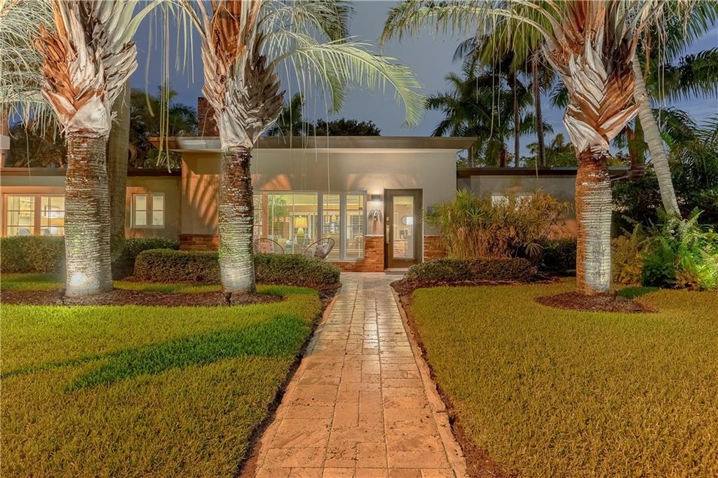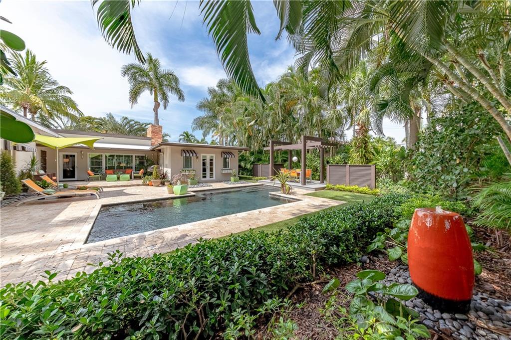 A beautifully modernized Victoria Park Mid-Century is a sterling representation from the Atomic period. This three bedroom, three bath home with a Den boasts an iconic stacked Sandstone wall and room divider, wood burning fireplace, soaring vaulted ceilings, polished slate flooring and sloping roof lines. Features include impact windows and doors, whole house generator, over-sized single bay garage with storage loft and Chef's kitchen with premium stainless appliances including a Thermador gas range, hardwood cabinetry and granite tops. A spacious Breakfast bar separates the kitchen from the dining room. The very private fenced yard is surrounded by spectacular architectural gardens with marble pavered terrace, thoughtful dining loggia overlook a sparkling pool.