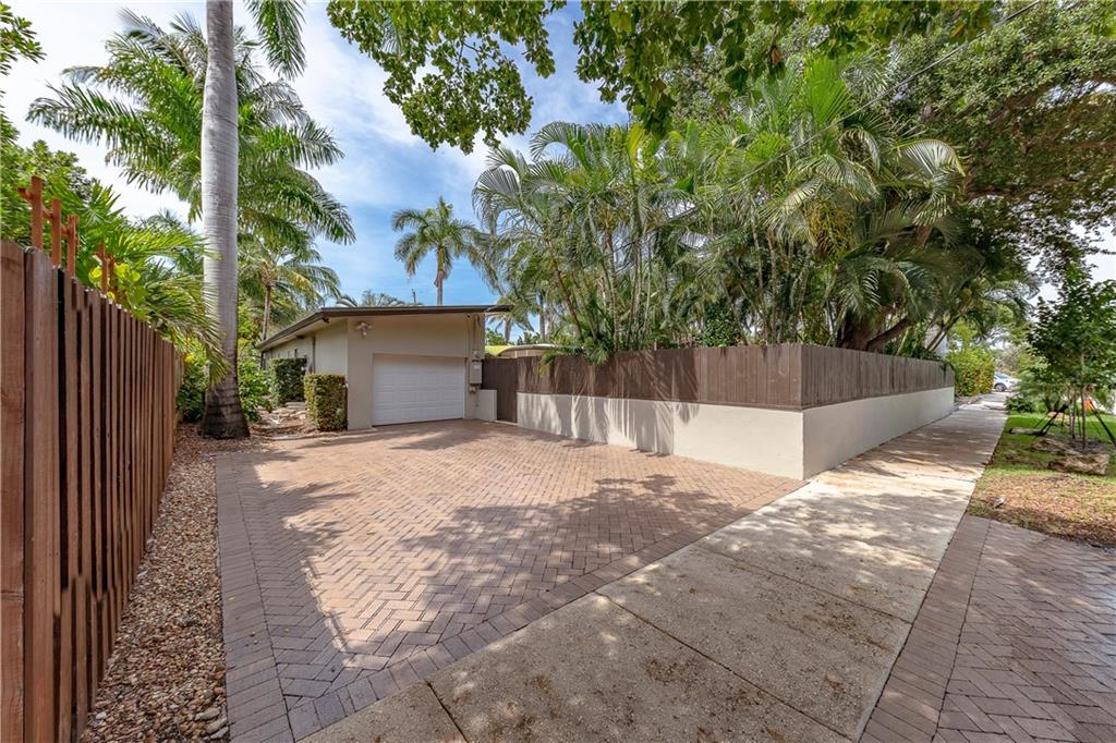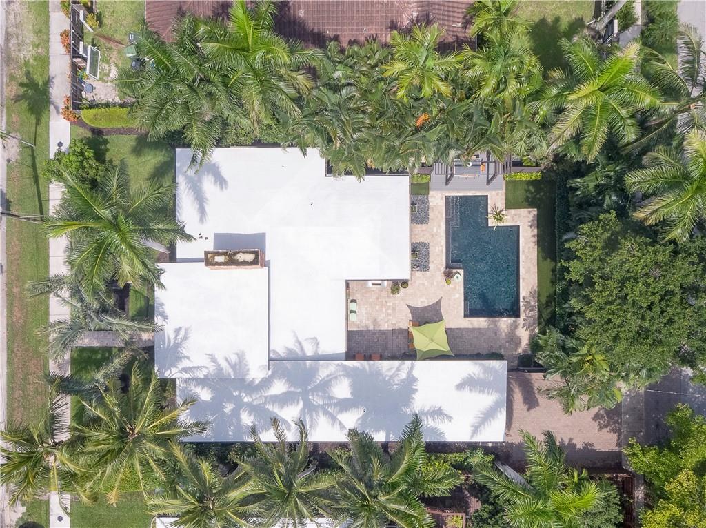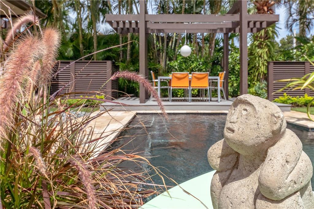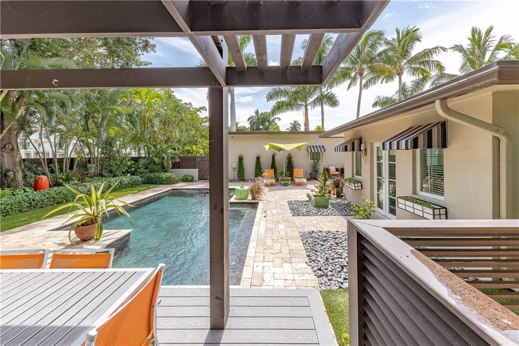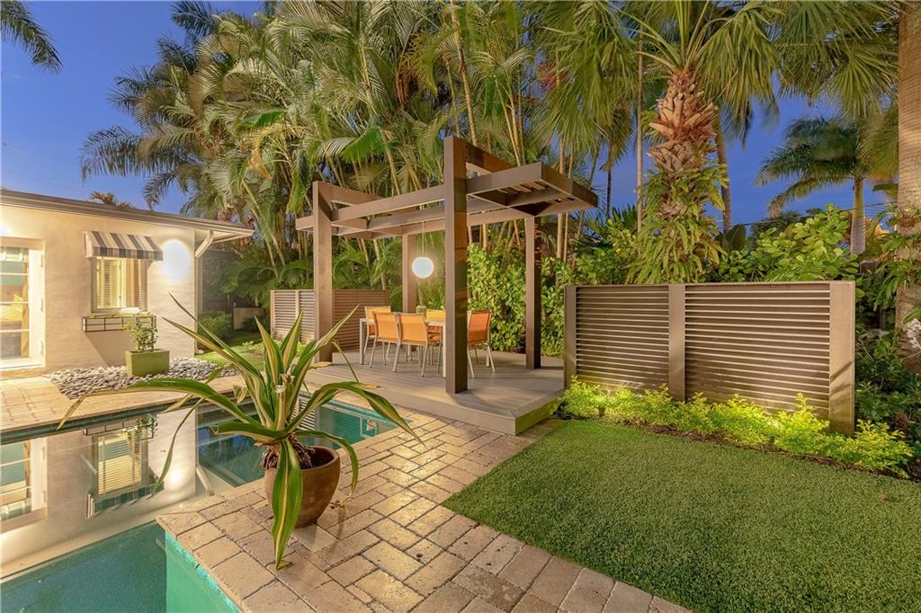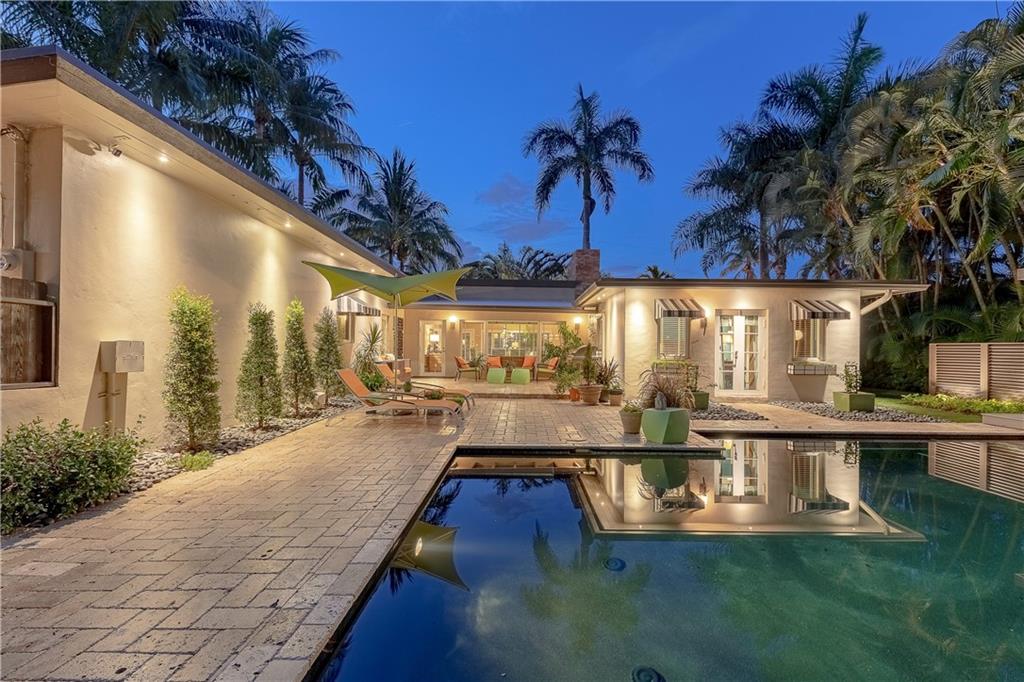 A beautifully modernized Victoria Park Mid-Century is a sterling representation from the Atomic period. This three bedroom, three bath home with a Den boasts an iconic stacked Sandstone wall and room divider, wood burning fireplace, soaring vaulted ceilings, polished slate flooring and sloping roof lines. Features include impact windows and doors, whole house generator, over-sized single bay garage with storage loft and Chef's kitchen with premium stainless appliances including a Thermador gas range, hardwood cabinetry and granite tops. A spacious Breakfast bar separates the kitchen from the dining room. The very private fenced yard is surrounded by spectacular architectural gardens with marble pavered terrace, thoughtful dining loggia overlook a sparkling pool.