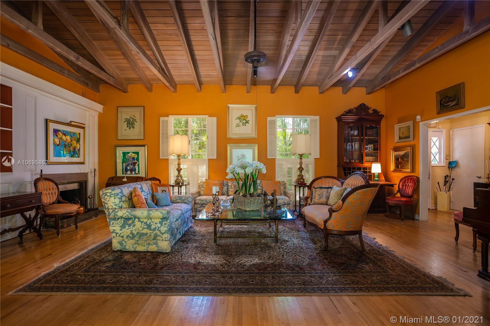 Spectacular High & Dry half acre tropical paradise in Ye Little Wood, South Coconut Grove’s quintessential, private, gated enclave of 31 homes. Beautiful sited home has excellent floor plan with solid hardwd floors, open beamed ceilings, walls of windows, new roof and lots of natural light throughout. Lovely covered veranda and elegant center foyer entry, wide open formal living & family rooms, fireplace, formal dining room, butler’s pantry and large eat-in kitchen. Huge covered terrace with terrazzo patio and summer kitchen provide living al fresco. Wide hallways access the Master BR suite, bath, dressing area, large closets +2 additional bedrooms & bath. 4th BR +separate bath are located off the kitchen, over-sized 2 car garage and utility areas. Plenty of room for pool and expansion.