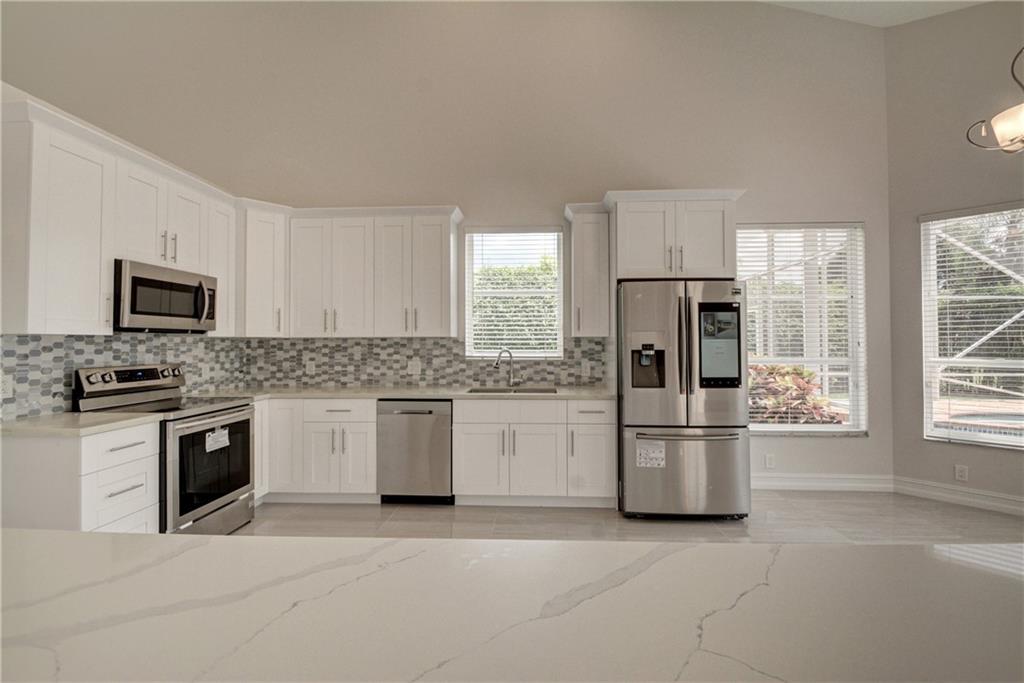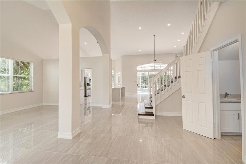 This 4 bedroom 2.5 bath + loft home in Lexington Estates Boca Raton has been totally renovated. Very spacious living area with vaulted ceilings. Brand new kitchen featuring a quartz waterfall island, and top of the line stainless steal appliances. New tile floors though out living area and dark laminate wood floors upstairs and bedrooms. Master bedroom is on the first floor, with two California walk-in closets. Master bathroom has been fully renovated with new vanities, quartz countertop, new tub and show. The rest of the bathrooms have been renovated and freshly painted inside and out! Oversized screened in pool and extended patio. This guard gated community is one of the few that does not require a mandatory membership fee! Centrally located to restaurants and shopping in Boca Raton.