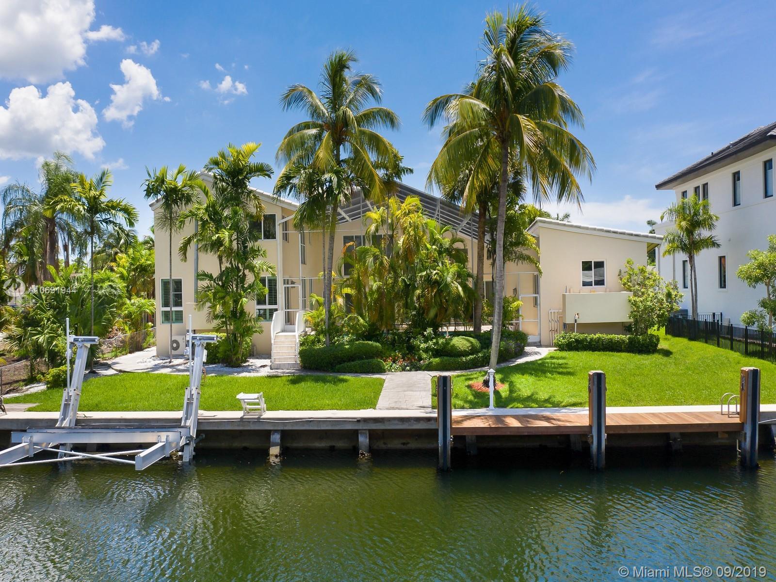 Contemporary residence with phenomenal value has the lowest price in community with 100ft of prime waterfront on wide canal. NO BRIDGES with direct ocean access. Private dock and boat lift allows for extra docking. Revel in breathtaking sunsets from your back yard. Grand two-story living and dining rooms. Unique design with open layout and large expanses of glass. Main floor wet bar can be enjoyed from social areas. Spiral staircase w/ Guggenheim flair leads to 2nd floor loft w/imposing views and multiple uses. Sleek, functional kitchen with S/S appliances. Breakfast area opens to family room. Secondary spiral staircase leads to private master complete w/ en-suite bath and walk-in closet. Perfectly situated in gated community near elite schools, shopping, dining, downtown & beaches.