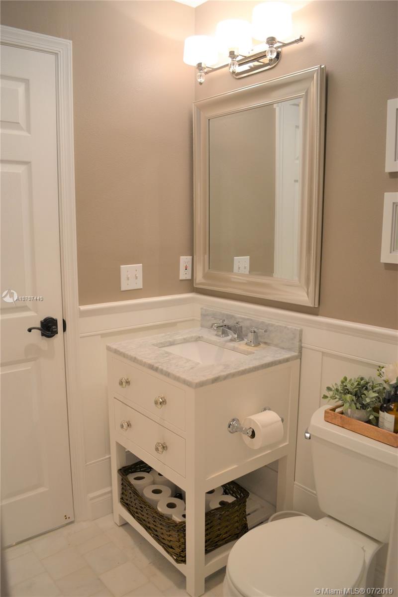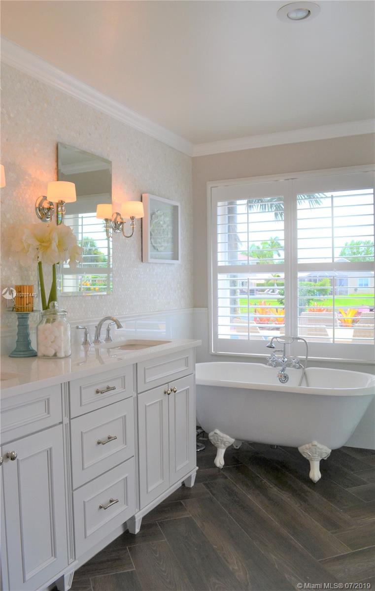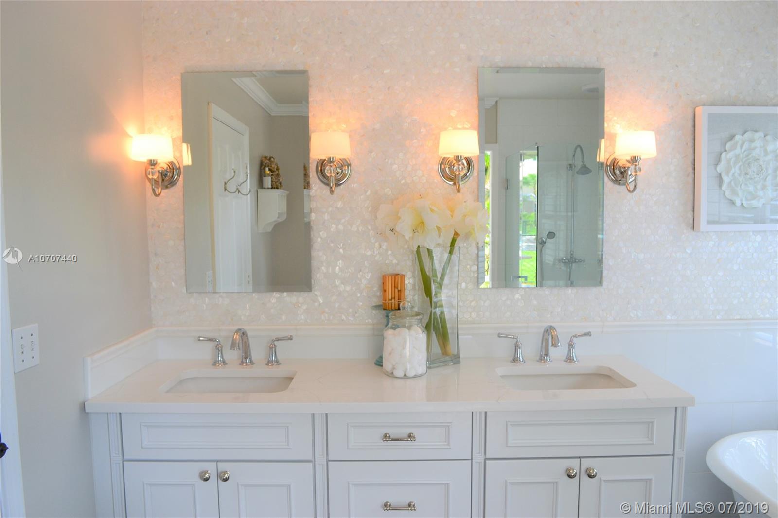 Upgraded gourmet kitchen featuring KraftMaid cabinetry, quartzite countertops, Blanco farmhouse style sink, an oversized island, and professional series KitchenAid appliances. Designer upgrades throughout the home include wood grain floor tile, wainscot, crown moulding, and wood shutters. 500-gallon underground propane tank supplies tankless water heater with connection for outdoor grill and future generator hookup/ future outdoor kitchen. GE front load washer/dryer. All bathrooms have been upgraded with custom cabinetry and tile. The home sits on a pie-shaped, oversized lot with mature tropical foliage. The pool area is westward facing for beautiful sunsets. Diamondbrite/waterline tile in pool replaced in 2017. Dock on canal (boat not included).