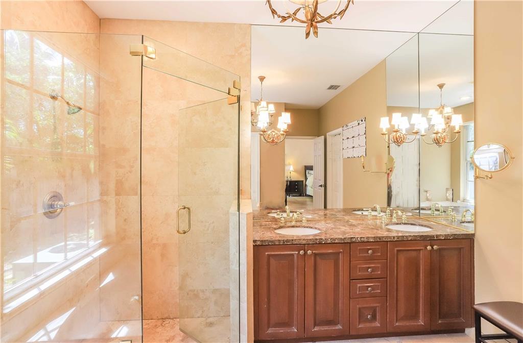 A must see! one-story corner lot home with 6 rooms which includes a custom built office and a guest house + 4.5 baths. 2 car-garage + additional parking space. Courtyard home entrance great for entertaining and extra privacy. Patio/pool area w/Roman columns, tall French doors & custom ceiling design. Inside, travertine floors, coffered ceilings, large windows facing the backyard, plantation shutters, detailed moldings, venetian plaster plus other designer touches. Kitchen w/gourmet center island, wood cabinetry and granite countertop. Guard gated community. Property walled & hedge for privacy. Free flow split Plan w/rooms on opposite sides for maximum privacy. The setting is private, the outside garden is lush and scenic. Walking distance to community play area. A+ schools.