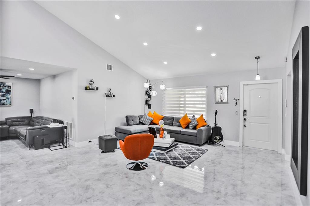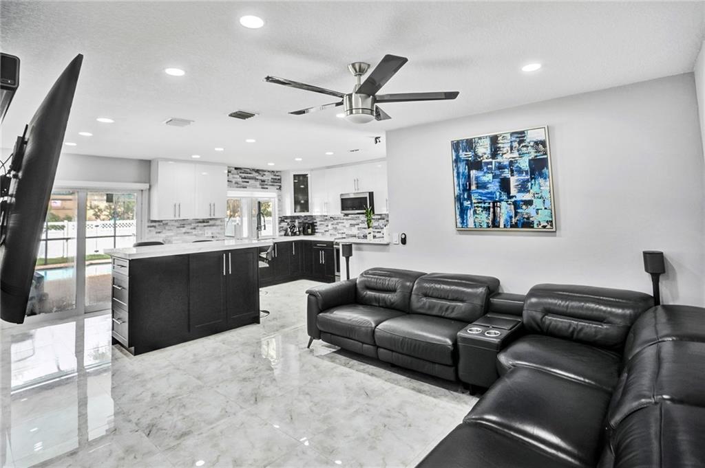 FULLY RENOVATED - 4/2 SINGLE FAMILY HOME WITH POOL, IN RAMBLEWOOD PERFECT TO ENTERTAIN!"NO HOA FEE" "ASSURA" (2019) IMPACT WINDOWS AND DOORS THROUGH OUT THE PROPERTY, CUSTOM MOVABLE ISLAND KITCHEN WITH CALLACATA QUARTZ COUNTER TOPS, WHITE AND GREY STONE BACK SPLASH, AND MODERN CUSTOM SOFT CLOSING CABINETS AND DRAWERS. SAMSUNG STAINLESS STEEL APPLIANCES CUSTOM BUILT BAR, WITH BUILT IN WINE COOLER IN THE LIVING AREA, POLISHED WHITE & GREY PORCELAIN IN THE LIVING AREA, 6" MODERN SQUARE BASEBOARDS THROUGH OUT, UPGRADED BATHROOMS, WIRELESS SPEAKERS IN THE BATHROOMS, JACUZZI TUB IN GUEST BATHROOM,LAMINATED WOOD FLOORS IN THE BEDROOMS. CUSTOM RECESSED LIGHTING IN LIVING AREA, KITCHEN, AND MASTER BEDROOM. ROOF: 2006, A/C: 2014, WATER HEATER: 2015. WHITE 6' PVC FENCE SURROUNDING ENTIRE PROPERTY.