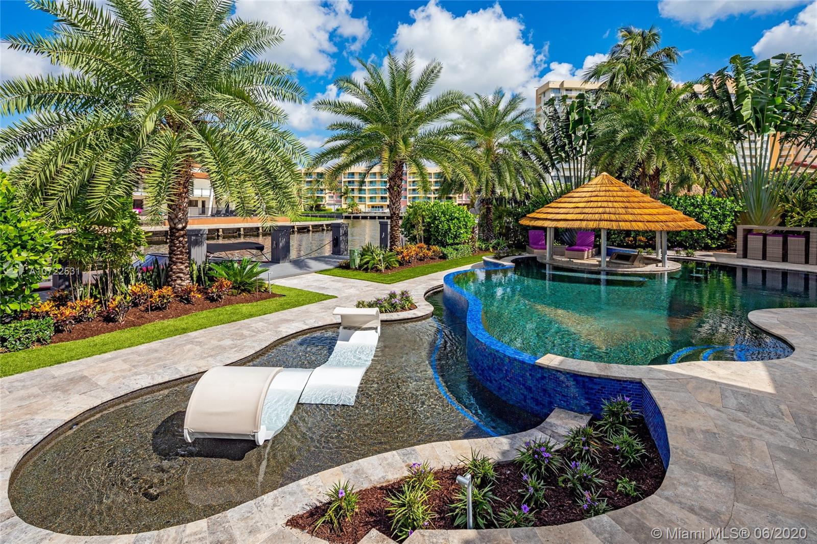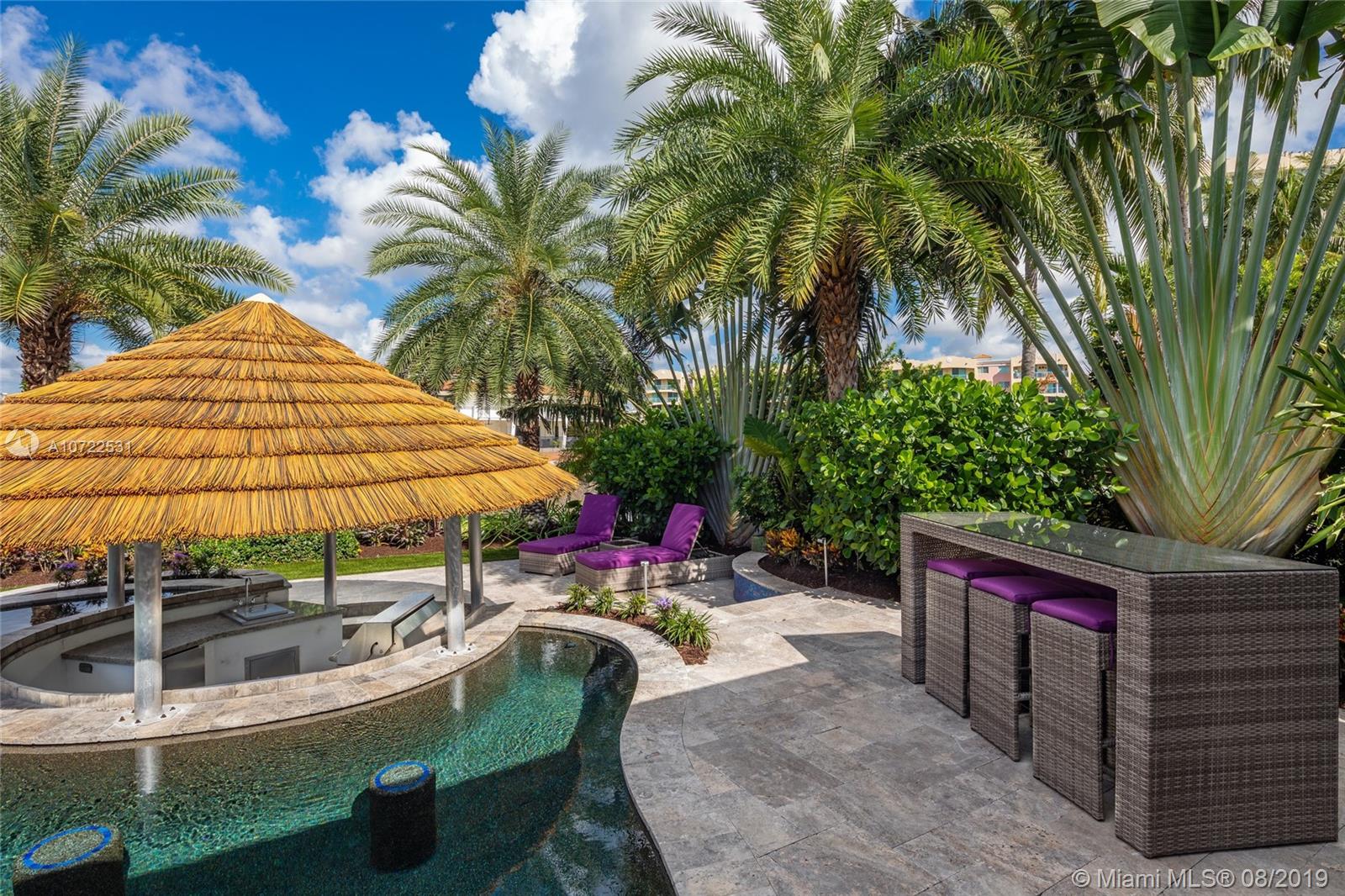 Waterfront luxury masterpiece tucked away in the prestigious Golden Isles community. Fully renovated & turn key this stunning residence features 4 oversized bedrooms and 5 bathrooms, 4,000 Sq Ft of living space. A tranquil entry covered in bougainvillea welcomes you to a sleek modern vibrant place to call home. Open concept floor plan. White 32' porcelain tile throughout, custom doors, closets, LED lighting. Snaidero-Pininfarina Kitchen includes Subzero refrigerator & wine cooler, Quartz countertops, Wolf oven & range. 14' high ceilings, impact windows. Resort style backyard perfect for entertaining, custom designed infinity edge salt water pool w/ built in swim up tiki hut including summer kitchen & bar overlooking 85' of water frontage.Easy access to intracoastal,a plus for avid boaters!