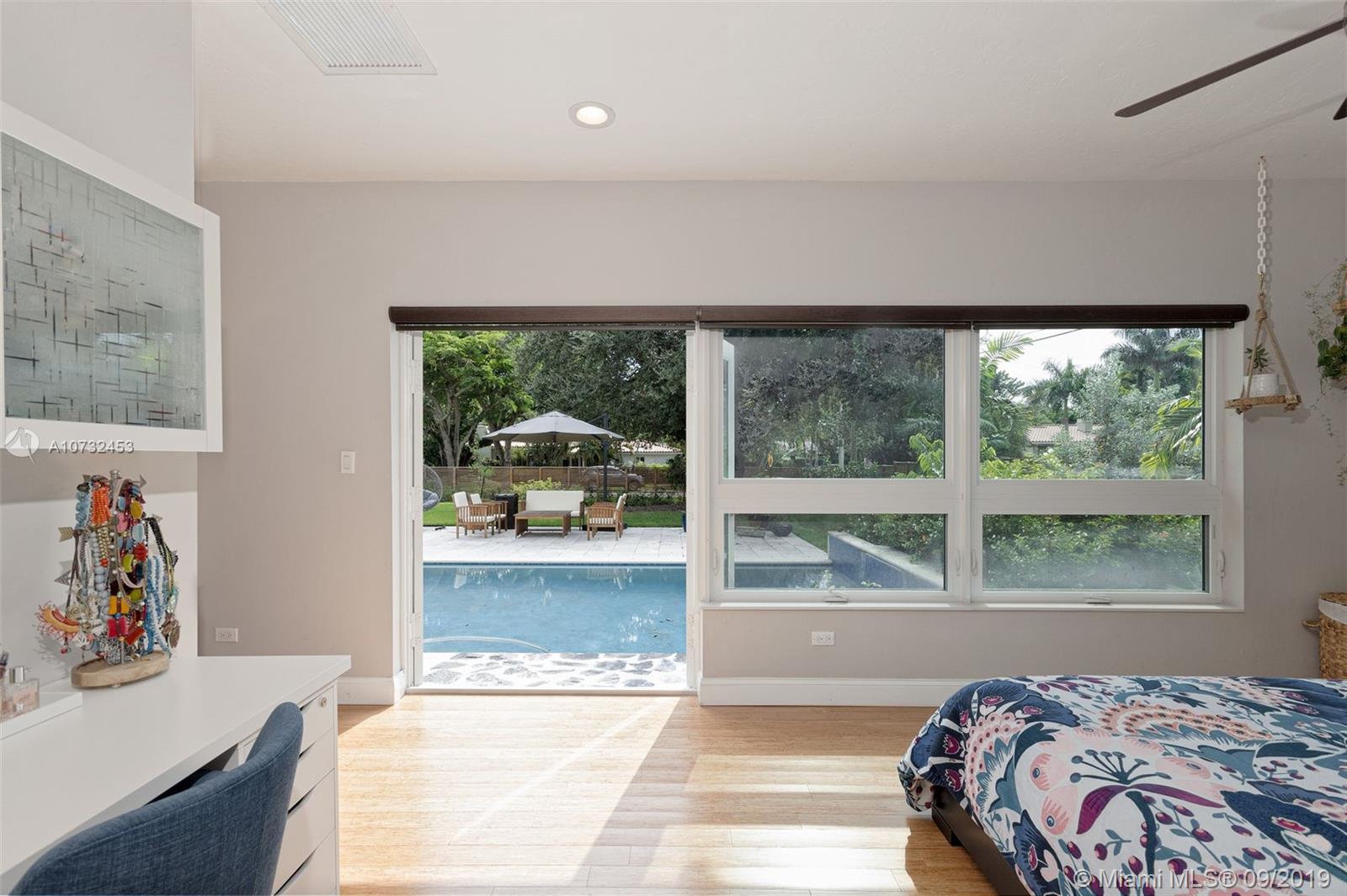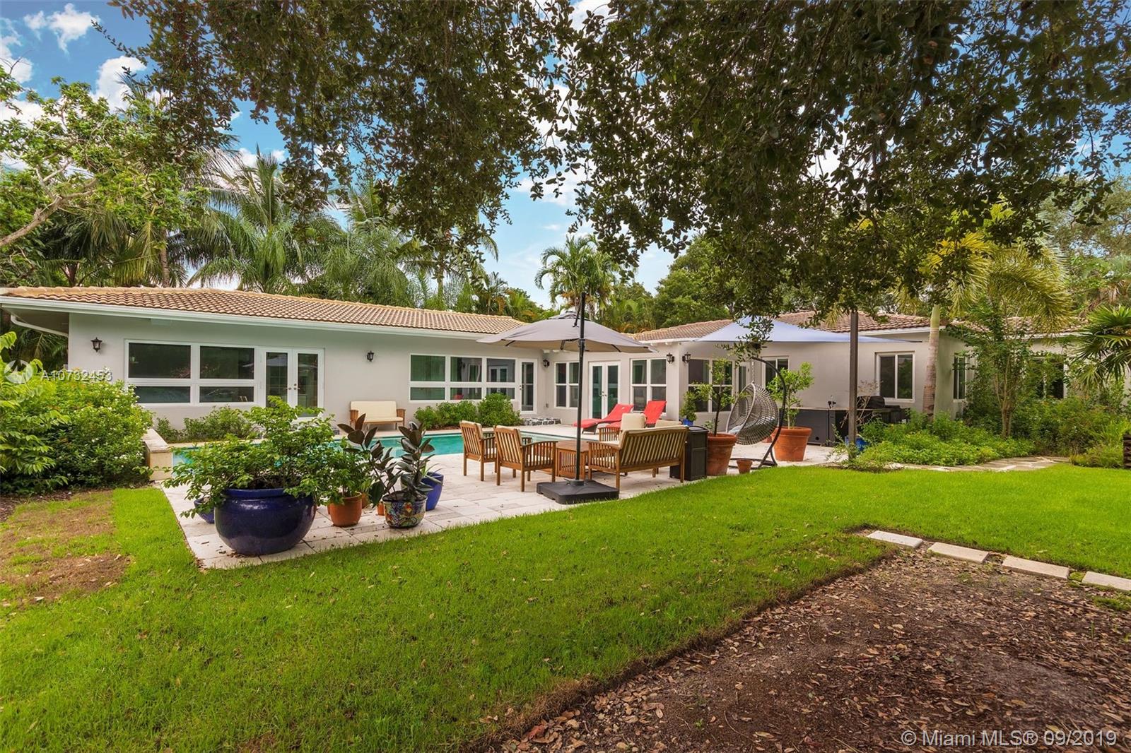 5 bedrooms and 4 full baths in this renovated Miami Shores home. Big corner lot, fenced yard with patio, outdoor kitchen and beautiful pool. Spacious living room ,dining room open to the kitchen and family room overlooking the pool and garden. The kitchen is updated with stainless steel and granite . Wood and tile floors, impact windows and doors, two zones of central a/c. Master bedroom overlooks the pool and garden, has big walk-in closet and new bathroom. Big inside laundry room and utility room, attached one car garage. Move in condition.