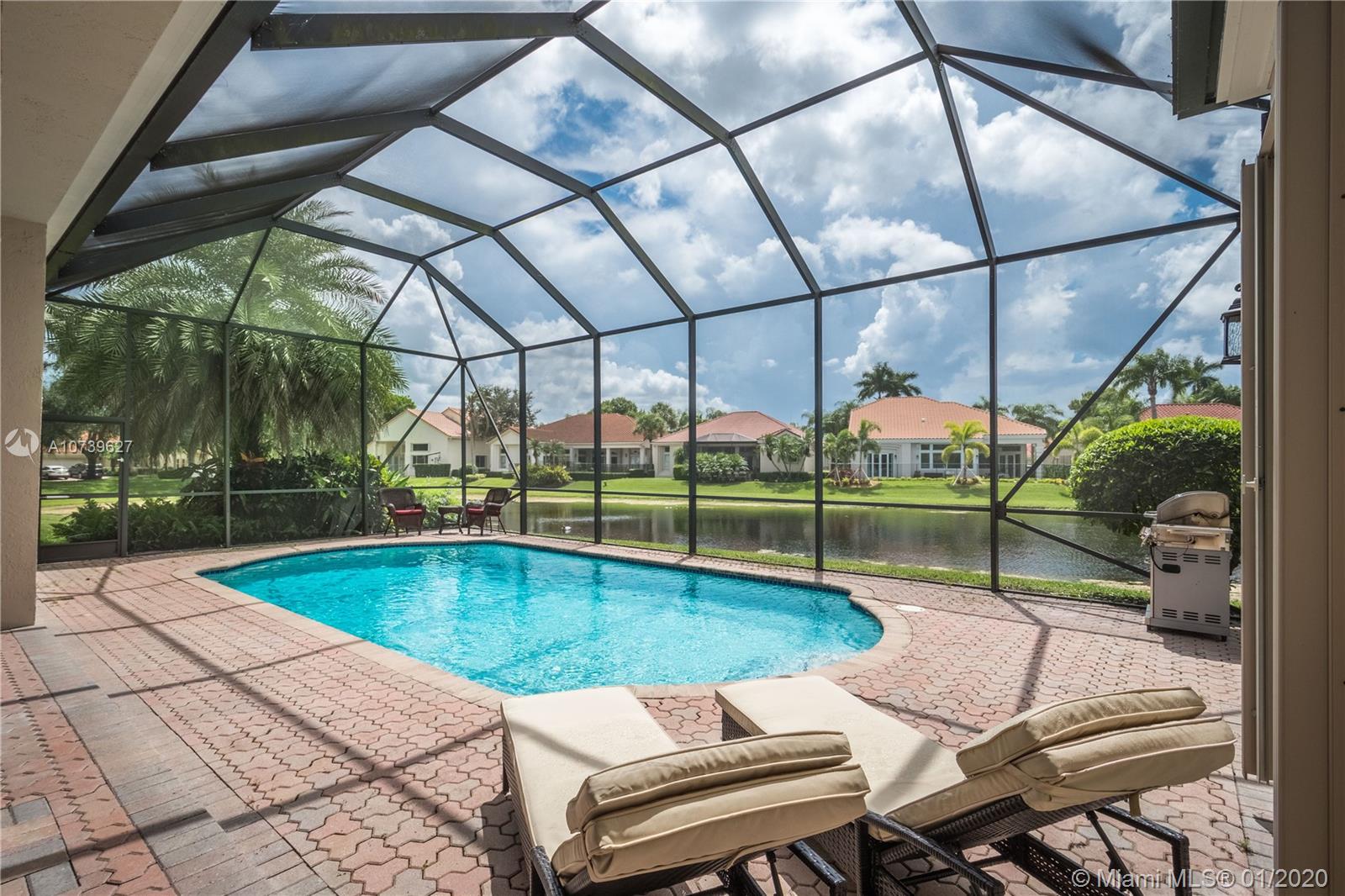Weston Hills spectacular and bright 3 Bedrooms 2.5 baths. Lakefront house w/screened pool and pleasant golf course views. Privately located in cul-de-sac. Foyer leads to living and dining room high ceilings, pool view. Large kitchen, wood cabinets, granite counter tops, cooking island. Breakfast and great family room exit to covered patio lanai to pool. Master bedroom also exit to pool from master bath. Recently polished marble floors in social area. Freshly painted. All new light fixtures inside and out. Accordion shutters in windows and patio. The Pointe @WHCC maintenance includes all lawn service, cutting grass and trim bushes & palm trees, plus pressure clean walkways. All schools A+ Seller very motivated.
