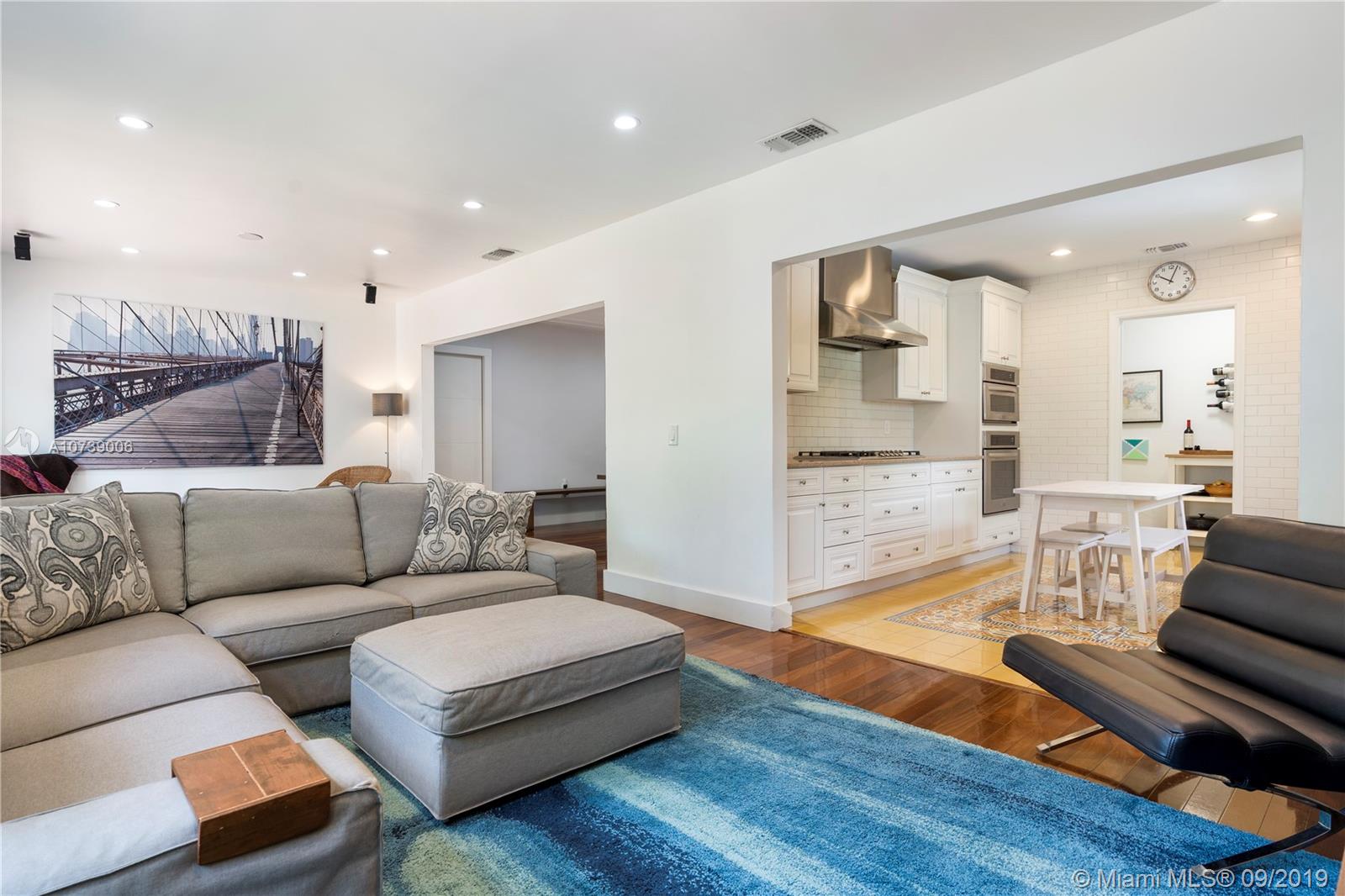 Turnkey Coral Gables home. 3 bedrooms and 2 baths with gorgeous modern wood flooring throughout. Open concept and flow-through space allows for entertaining comfortably. Home is completely remodeled w/ impact windows and doors throughout. Beautiful picture window greets you in entrance. Welcoming front porch area. Spanish tile roof. Tray ceilings, charming archways, tray ceilings, remodeled bathrooms and kitchen, lovely subway tile kitchen with light wood cabinetry on granite and stainless steel appliances. Living and Florida room are ample with big picture windows to invite maximum light into home. Home has an ample 2 car garage and a nice size backyard complete with Chicago Brick pavers, room for a pool. This one will fly off market.