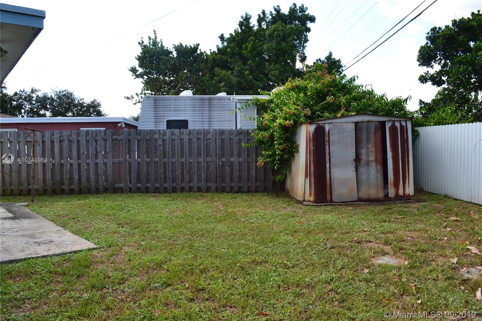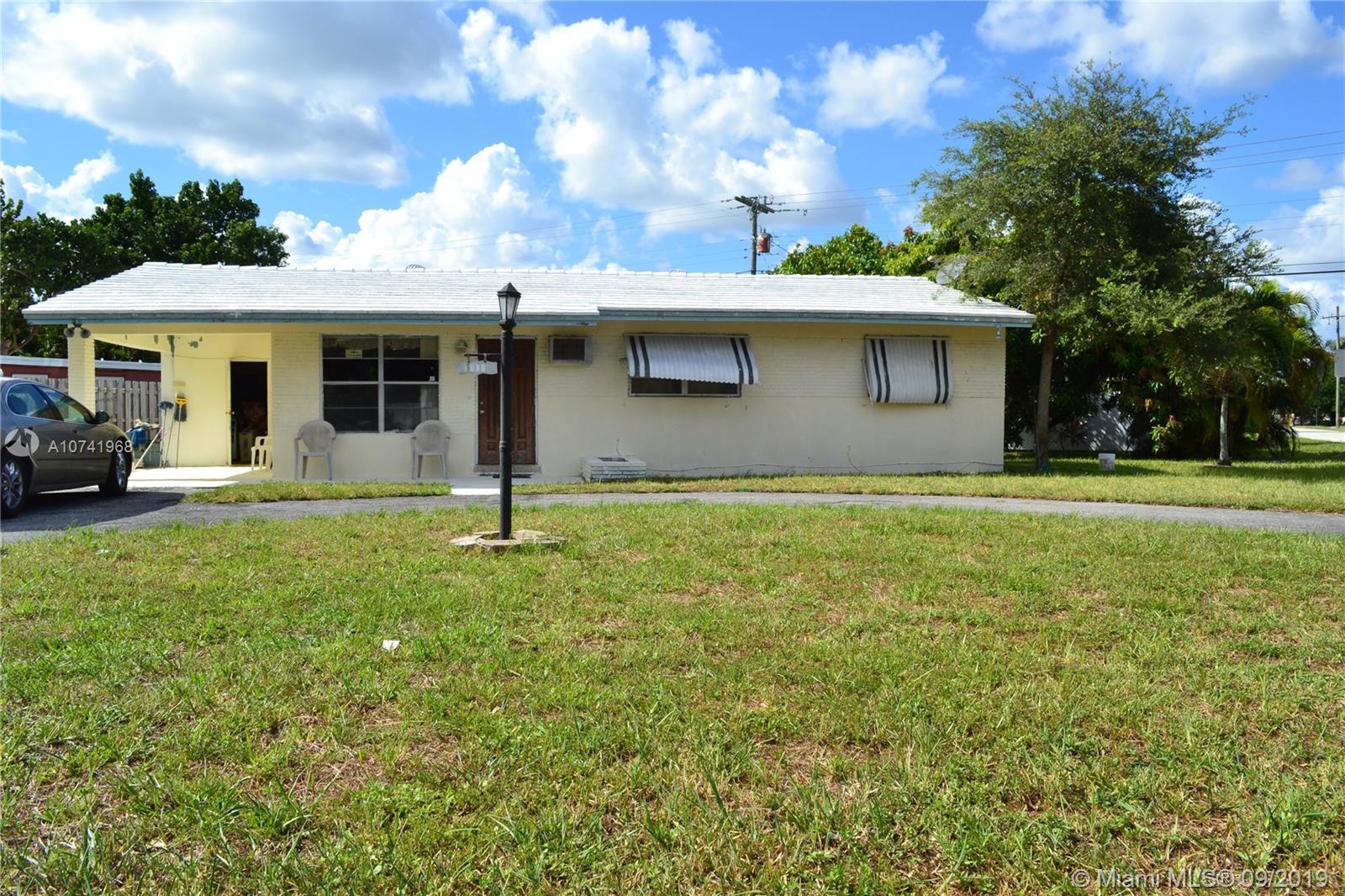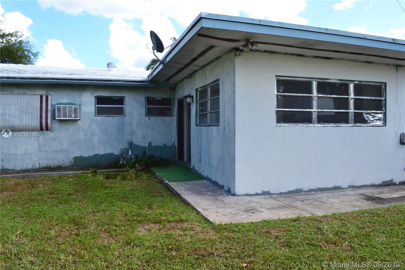 Spacious corner home with 3 bedrooms and 2 bathrooms! Wood cabinets in the kitchen and includes stainless steel appliances. Beautiful tile floors around the home and a large "Florida" room with sufficient natural light for future projects. House is centrally located in Hollywood near I-95 and Florida Turnpike which makes transit much more accessible on the to/from. At 7,951 SQ FT on the lot, there is ample space for many investment projects like a pool or deck. There is a mature mango tree on the outside of the house that is on the property. Convenient utility room that has a refrigerator in it for hurricane purposes and the washer and dryer is located here as well.