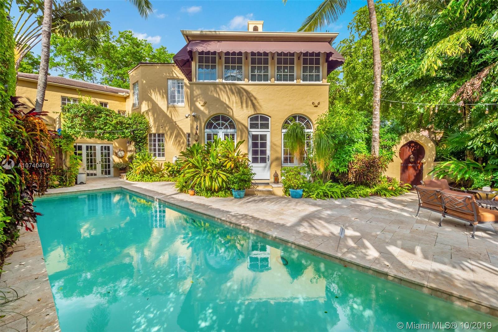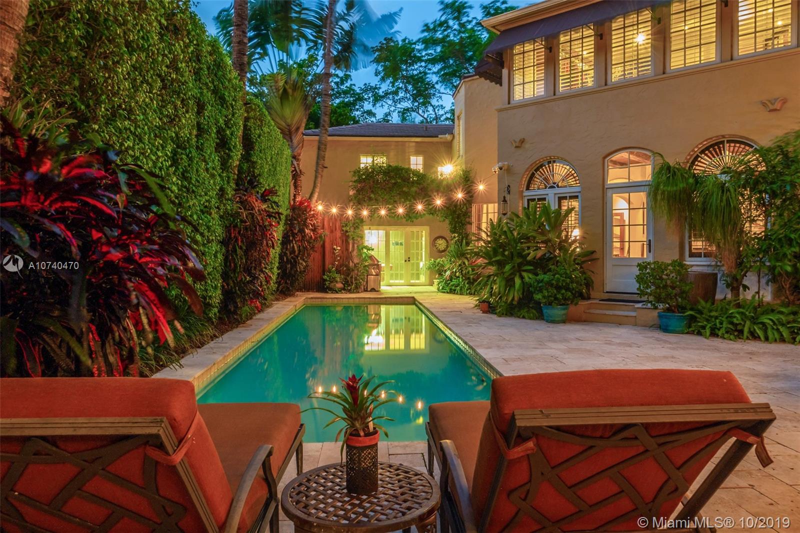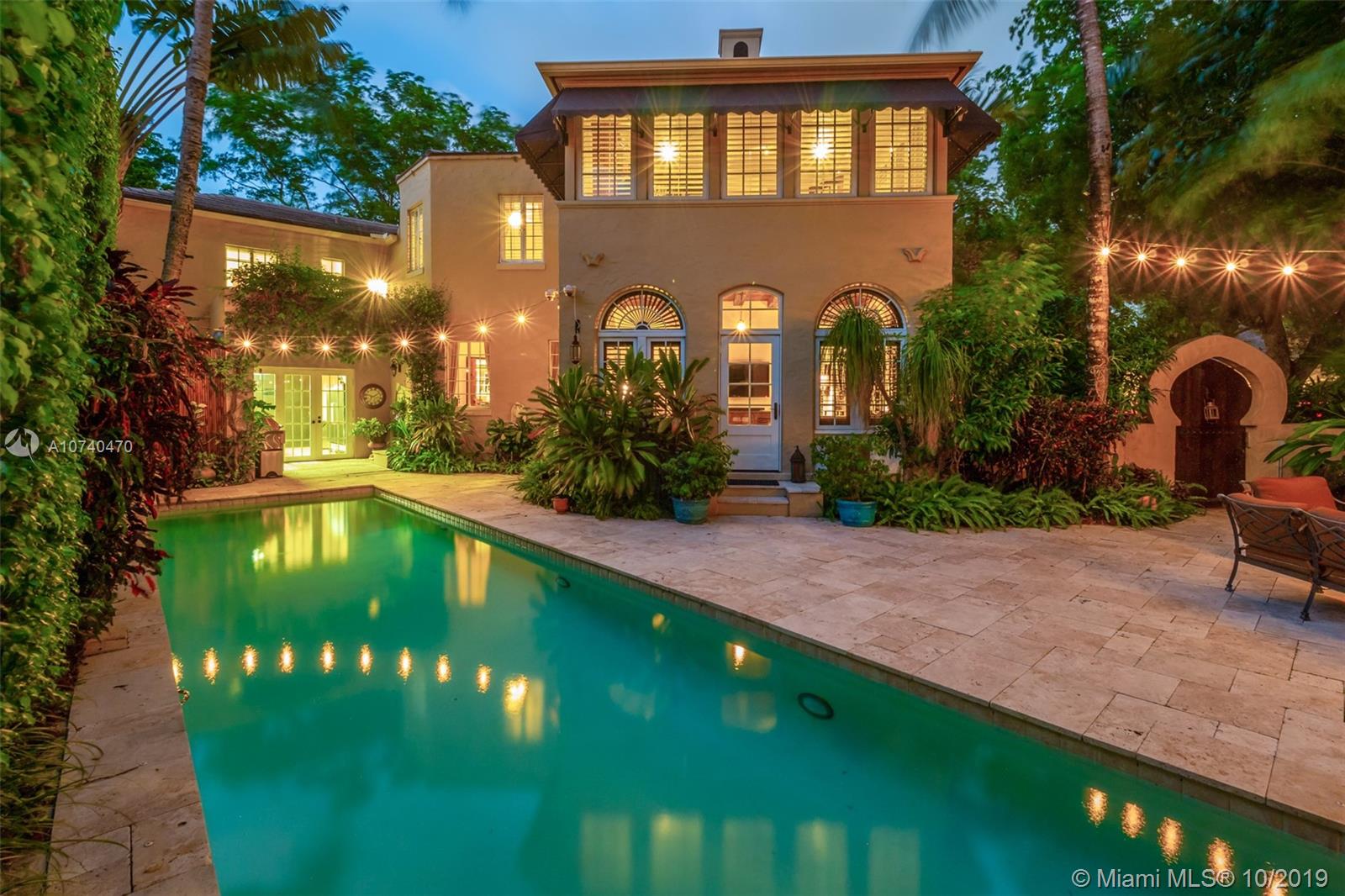 The grandeur of this historic gem spreads throughout the 4,326 sf of living space. An impressive rotunda entry showcases a winding marble staircase. Detailed wood scroll and mill work add elegance to the 4 bedroom and 6 bathroom layout. Adding to the splendor are Moroccan sconces, high beamed ceilings, arched windows, and a carved stone fireplace. The lavish master bedroom and bathroom with custom tile are a delight, and the upgraded kitchen has modern features that complement the unique design. Relax in the sunroom or entertain guests in the spacious formal living and dining space. A game room with pool table leads outside to a lush private garden that surrounds an inviting stone patio and pool. Located in the heart a Coral Gables, downtown City Beautiful is a short walk away.