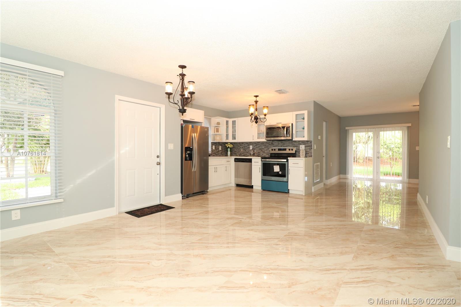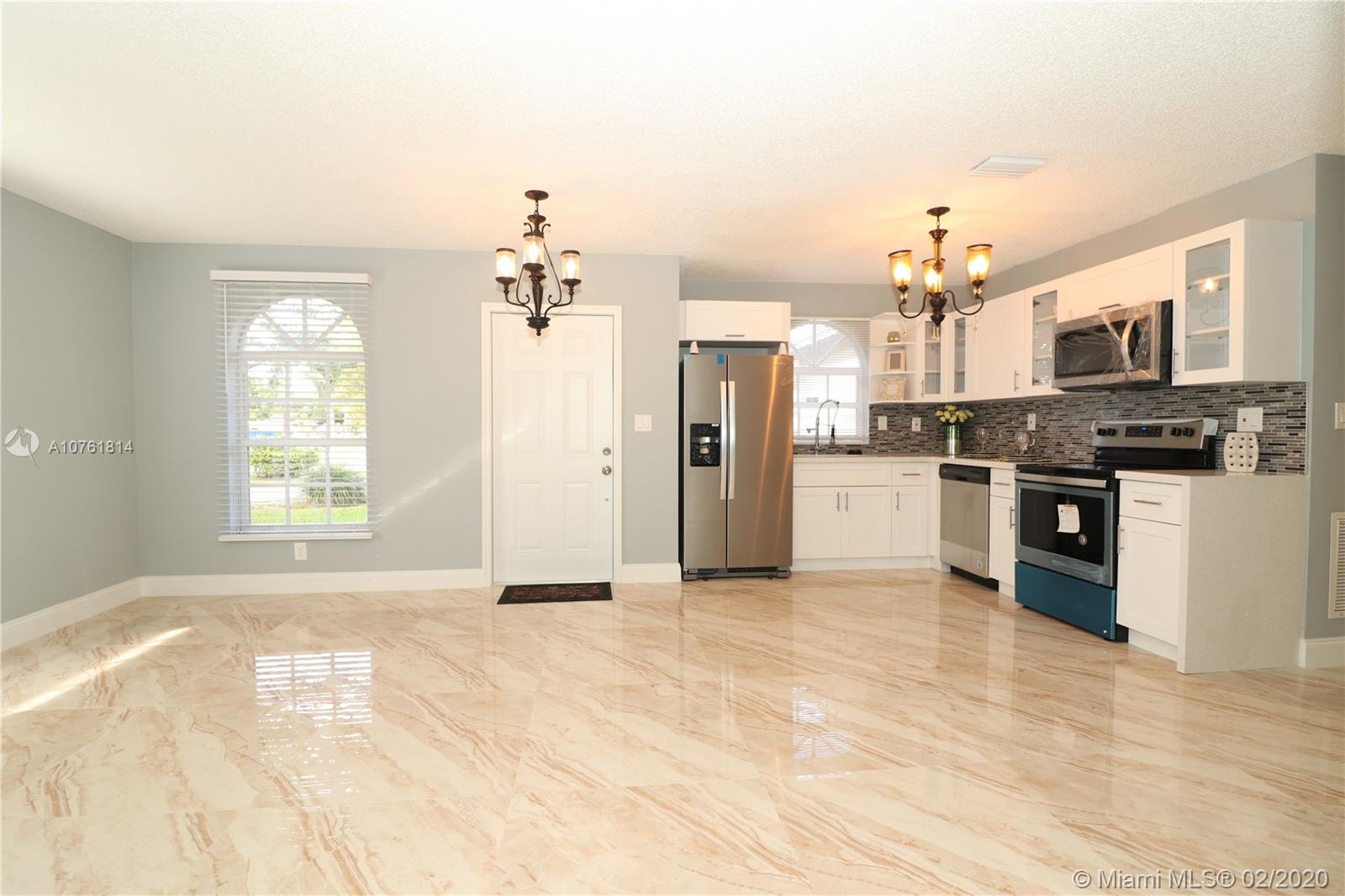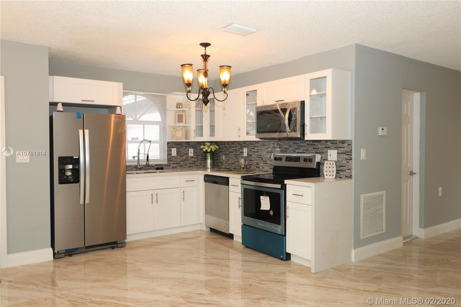 This unique GEM is in a league of it’s own in this area. Luminous elegant one story single family home, 4 Spacious Bedrooms, 2 Full Bathrooms completely remodeled New hard wood vanities. New Roof, New Garage door done with permit, New interior doors with frames, New entrance door. New tile Flooring in living room and dining room and New Wood laminate Flooring in bedrooms. New Kitchen with quartz counter top on soft closing hard wood cabinets and New SS Appliances, New Landscaping, New Sprinkler system with piping and new timer and heads. New Electrical and Plumbing fixtures. New blinds. New Smoke detector. Freshly painted interior and exterior building. Centrally located with convenient access to major roads, highways, I95. No HOA, No restriction. Must See.