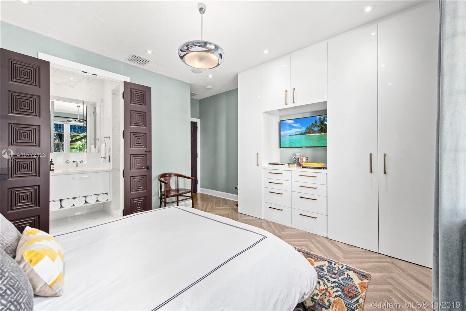Med-Deco architecture in Miami Beach, Recently Featured in Elle Decor, 3 bed 2.5 bath home on the coveted Española Way, a quiet closed street, short walk to South Beach's hottest spots. Designed by Award-winning designer Alex Alonso. Extensive total renovation of all the interior and exterior spaces. The original tile floors, beamed ceiling, and Art Deco fireplace have been lovingly restored. It boasts a Bertazonni Italian Kitchen, Phillippe Starck and Porcelanosa bathrooms, custom Italian-style cabinetry and wardrobes throughout, wood herringbone floors, and a salinated modern pool that rivals Miami’s best boutique hotels. Meticulously sourced designer and custom furnishings and well curated artwork throughout .This luxurious chic home is being offered completely furnished and turn key.