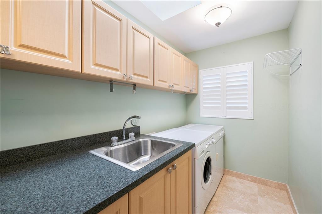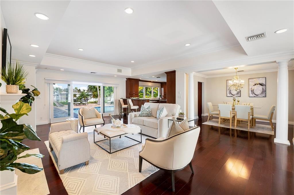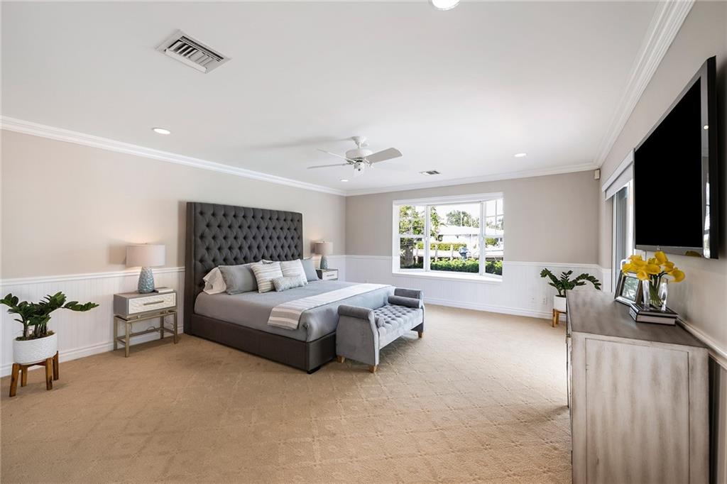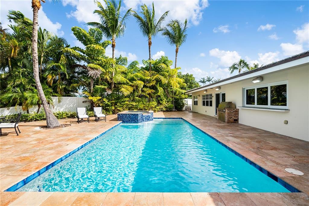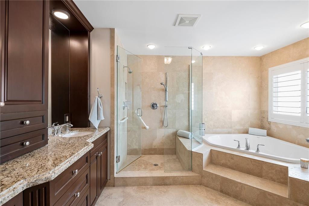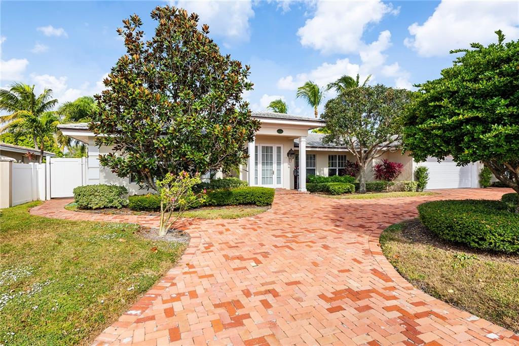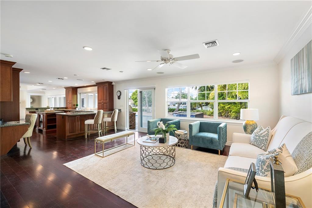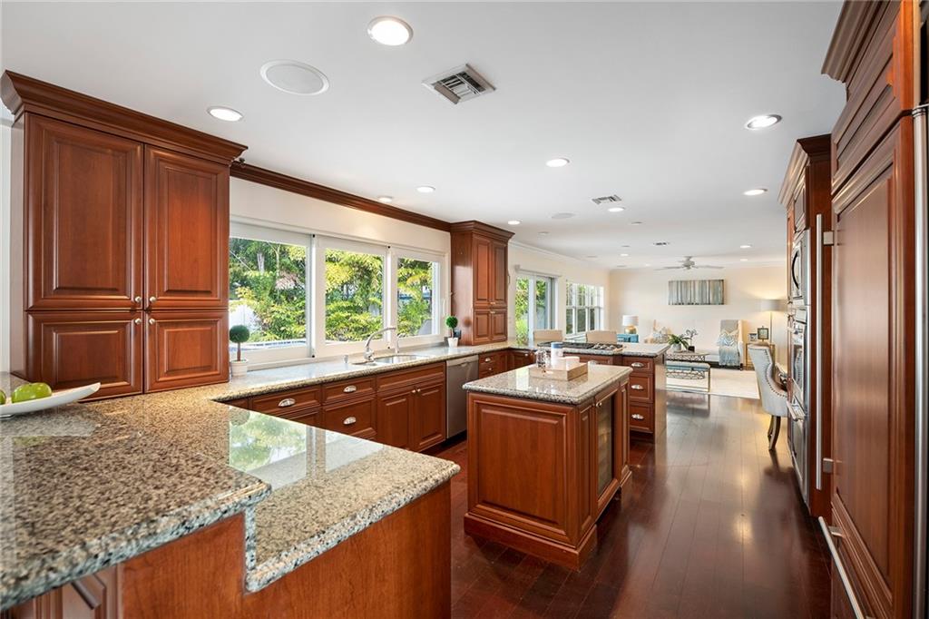 Transitional home in The Landings with deep water dockage suitable for up to a 43 ft. vessel. The single-level home surrounds a marble paver patio with refurbished pool and spill-over waterfall spa, taking full scenic advantage of 53 ft. of waterfront with views looking down the length of the Bayview Inlet. Open gourmet kitchen with gas cooking, Sub-Zero and Wolf appliances, stand-alone island, wine cooler, solid wood cabinets and granite counters. Four bedrooms, plus an office. Large master suite with walk-in closet and sliding door access to the patio / pool. The marble-finished en-suite bathroom has dual sinks, glass shower and Kohler soaking tub. Rebuilt in 2004 by the award winning Marker Construction Group, this home includes a myriad of amenities including impact windows and doors.