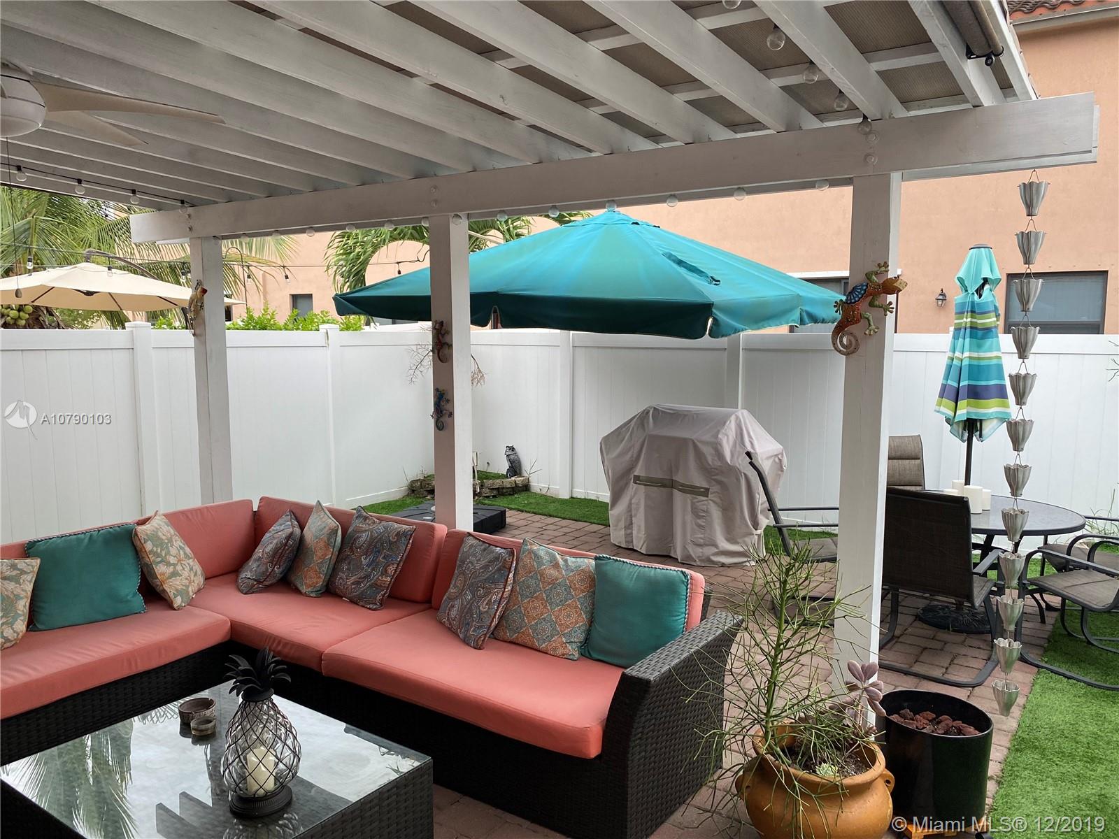 Great opportunity. Beautiful and cozy townhouse in pristine conditions, 3 bd 2.5 bth, 1 car garage. Beautiful upgraded laminate floors throughout the house with flush stairnose steps. SS appliances. Amazing patio for entertainment with pavers, fake grass, Pergola with electricity, ceiling fan, all done with permits. Spacious bedrooms, walking closets, W/D conveniently upstairs. Gated community, amazing Clubhouse with resort pool, gym and playgrounds. Close to shopping centers, highways and great schools. Don't miss this opportunity!!! Curtains are not par of the sale