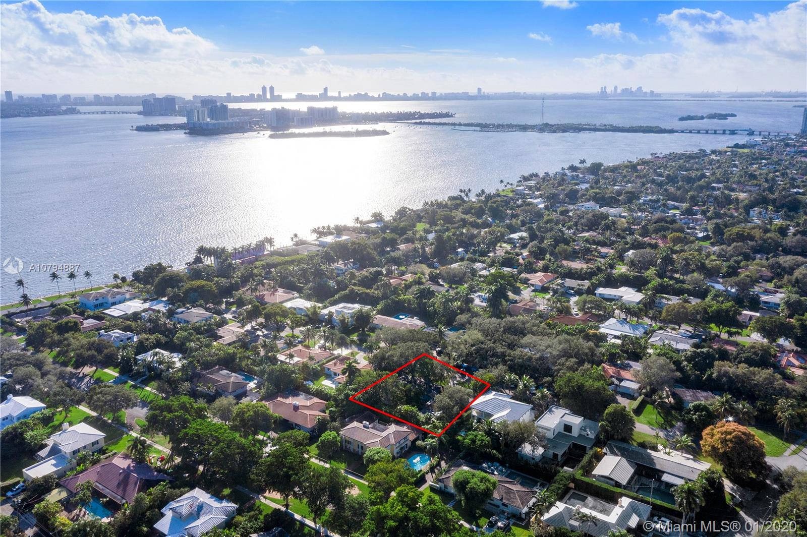 Strategically price so you make this your dream home!! House sit on almost 19,000 SF double lot on the most desirable st in Miami Shores East of Biscayne Blvd. Famous Architect Wahl Snyder’s previously owned & designed this residence just ½ block from Biscayne Bay! Scallion roof design combines ample indoor-outdoor living area. This home will never be duplicated & is reserved to lovers of architecture. All bedrooms overlook the screened-in patio/pool area. Huge master bedroom with separate his & hers walk-in closets, connects to large separate library/office/entertainment room. The house is loaded with flexible space to customize your preference. Open concept living with a formal entry, living, dining & kitchen. Pool cabana, coral wall & new deck. Combined are 7099 SF. 4 car garage.