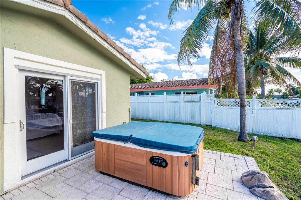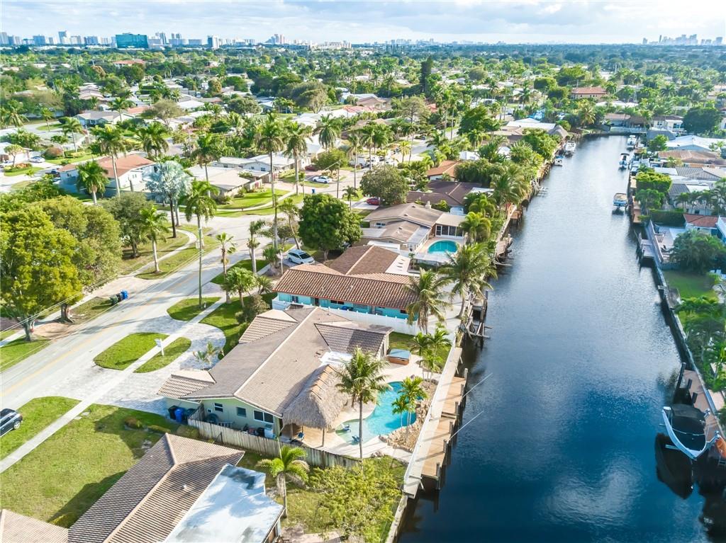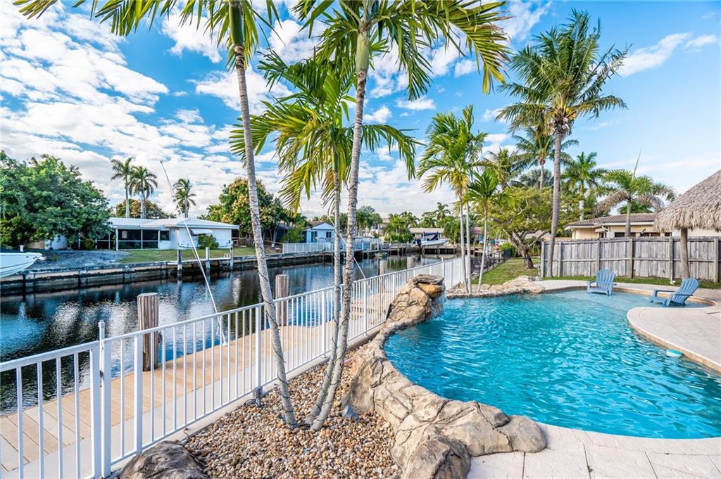 Exquisite 3/2 Convertible Waterfront Pool Home in Coral Ridge Isles. This home has ocean access and a pool featuring waterfall with baja shelf! The kitchen is modern with granite counters, tile backsplash & stainless appliances. Plus, its over-looking the lovely pool and waterfront! Spacious Florida room with custom built-in wet bar which opens up to outdoor tiki hut for resort lifestyle atmosphere. Master bedroom with walk-in closet & en-suite bath opens to patio & hot tub. Both bathrooms are beautifully updated. Impact windows and doors throughout & S-Tile roof. Home has a 45 foot dock and new indestructible batter piling seawall. Fenced with private yard and tropical entertaining area. A+ location close to beach, I-95, best schools & shops. Don't miss it! Call now this one won't last!!!