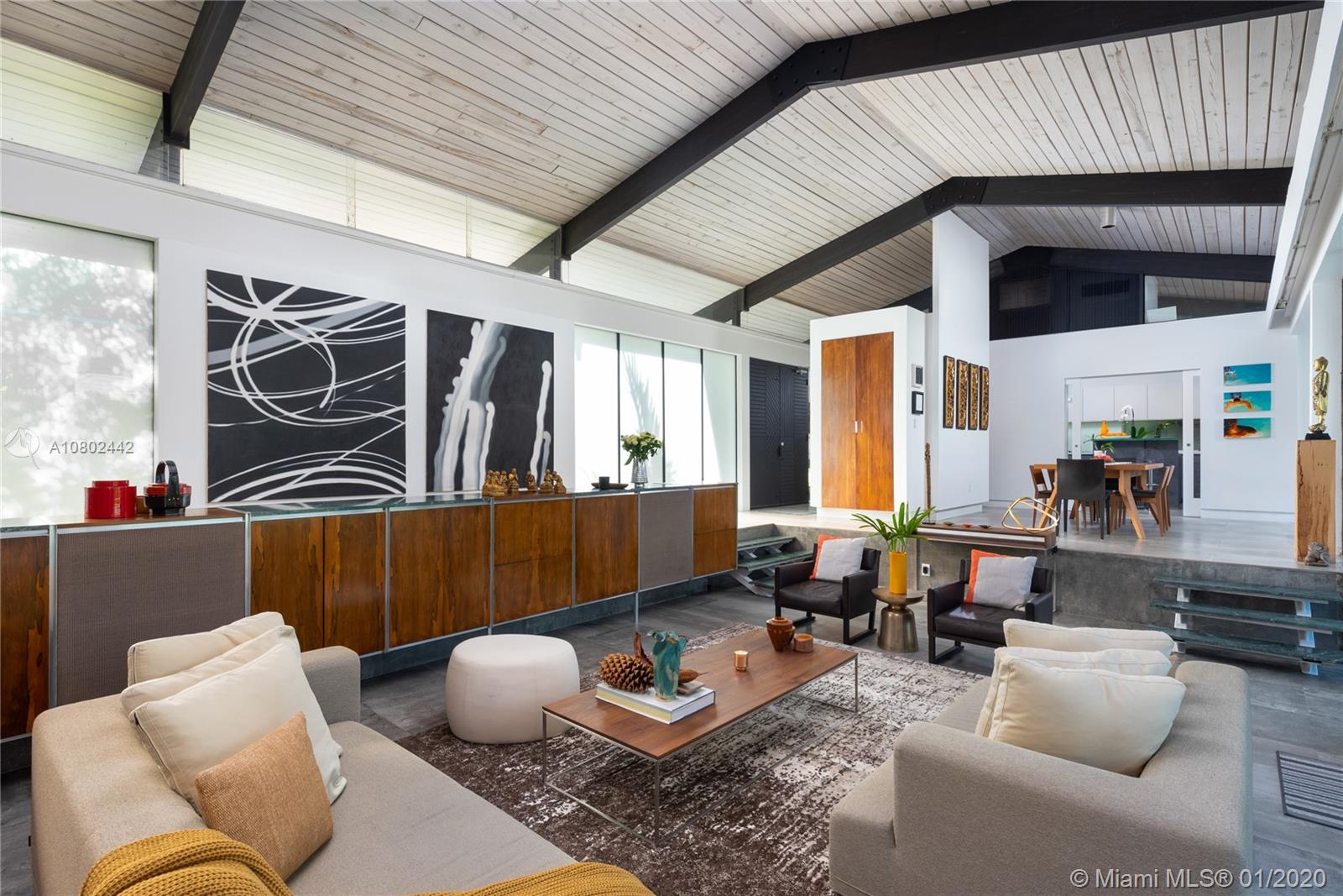 Timeless midcentury modern, 1 of a kind, Henry End designed architectural gem in Miami Shores exudes elegance of bye gone era & embraces excitement of modern living. Natural light flows throughout this 4 bd, 3 ba, 3,300+ sq ft home w/views of pool from every room.17’ ceilings add to voluminous feeling of home. Functional built-in 16' Brazilian Rosewood console divides sunken living room & gallery. Large pool adjacent to new koi pond surrounded by 15’ privacy foliage on oversized corner lot. Boasting gourmet gas chef’s kitchen w/second refrigerator in adjacent utility room. Located on quiet street in best section of Miami Shores 1 block from bay & bay walk. Future ready after comprehensive 22 mos renovation. Many more details available. A space not just for living, but for feeling alive.