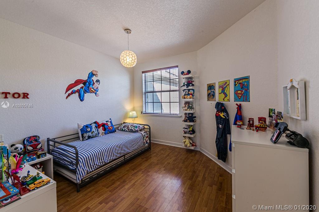 Beautiful 3 beds/3 full baths corner townhouse at gated community in Doral. Spacious, full of light layout with high ceilings, Accordion shutters in all windows and sliding doors. Tile flooring downstairs and laminated flooring upstairs. Kitchen with SS appliances and granite countertops. Downstairs bedroom with full bath and private entrance, perfect for in-laws, guests or home office. 2 large master suites style upstairs. New A/C. Designer landscaping outside and at paved, fenced patio. 2 car garage plus 2 cars at driveway. Plenty of visitor parking. Garage with extra storage. Exclusive and safe community, rarely a home for sale! Access to Islands of Doral Clubhouse. Next to Turnpike, new Legacy Park, new Glades Park, A+ schools, malls, restaurants and more. Easy to show!