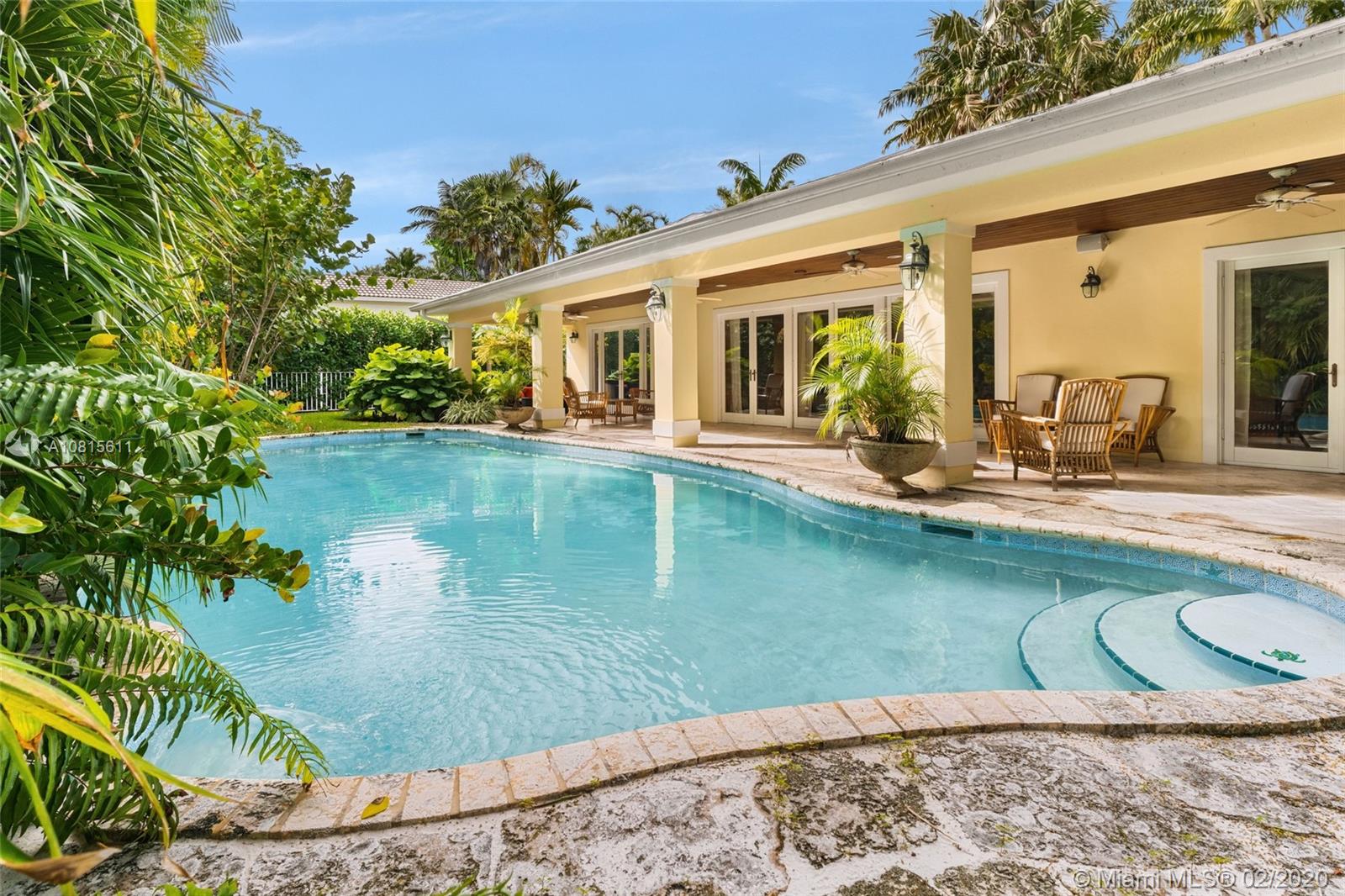 Great single story ranch home located on quiet street in prestigious Sunset Island 2. Home has impact windows and doors; large covered patio overlooking free form pool and lush landscaping. Features large eat-in kitchen and a split floor plan for privacy.