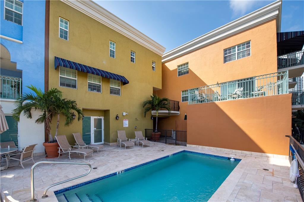 Motivated Seller ready for offer. European style low rise condo in charming courtyard setting. Complex has 23 condos total. TWO PARKING SPACES exclusive to this unit in second level secured garage. Lush central courtyard offers private relaxation with lounge chairs, gas grill, and dining tables. The unit has marble floors on the 1st level, carpet on 2nd, spacious rooms and closets, and cozy breakfast area overlooking the courtyard. Freshly painted interior, and all impact doors and windows. Balconies offer beautiful skyline views buffered by green space. This is a unique offering in a unique location. Stroll Las Olas Blvd, enjoy cafes, shopping, Performing Arts Center, Ann's Coffee Bar steps away, business district, one mile to ocean. One pet allowed w/restrictions. COME LIVE IN PARADISE!