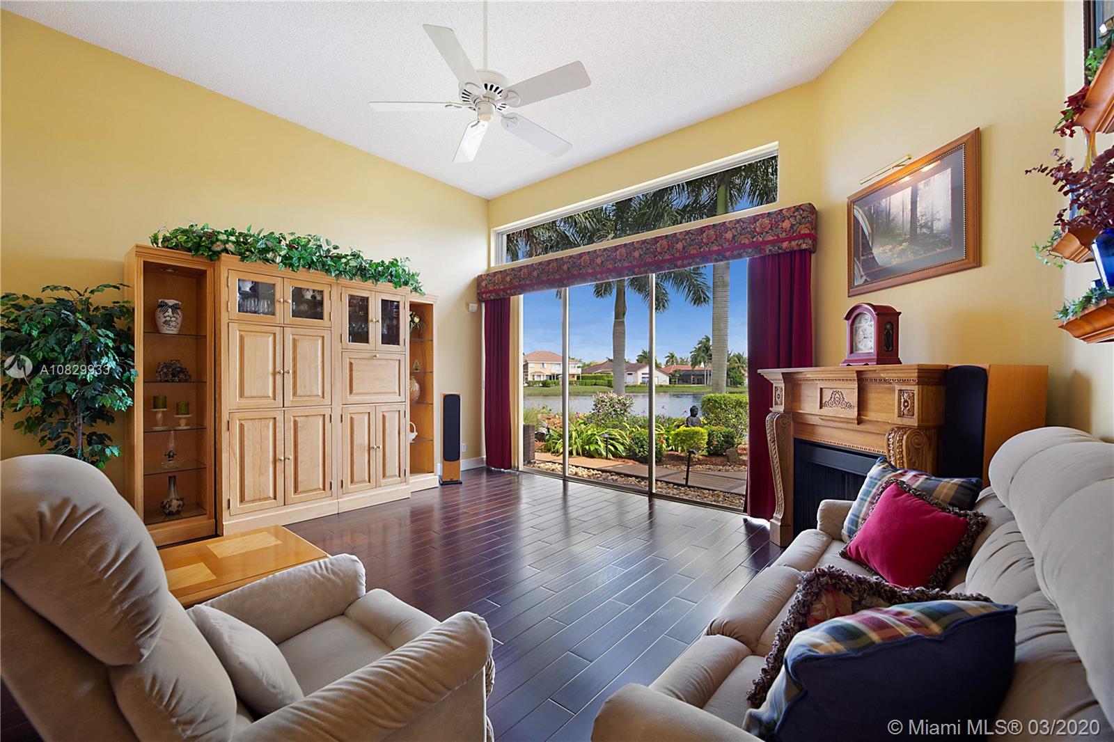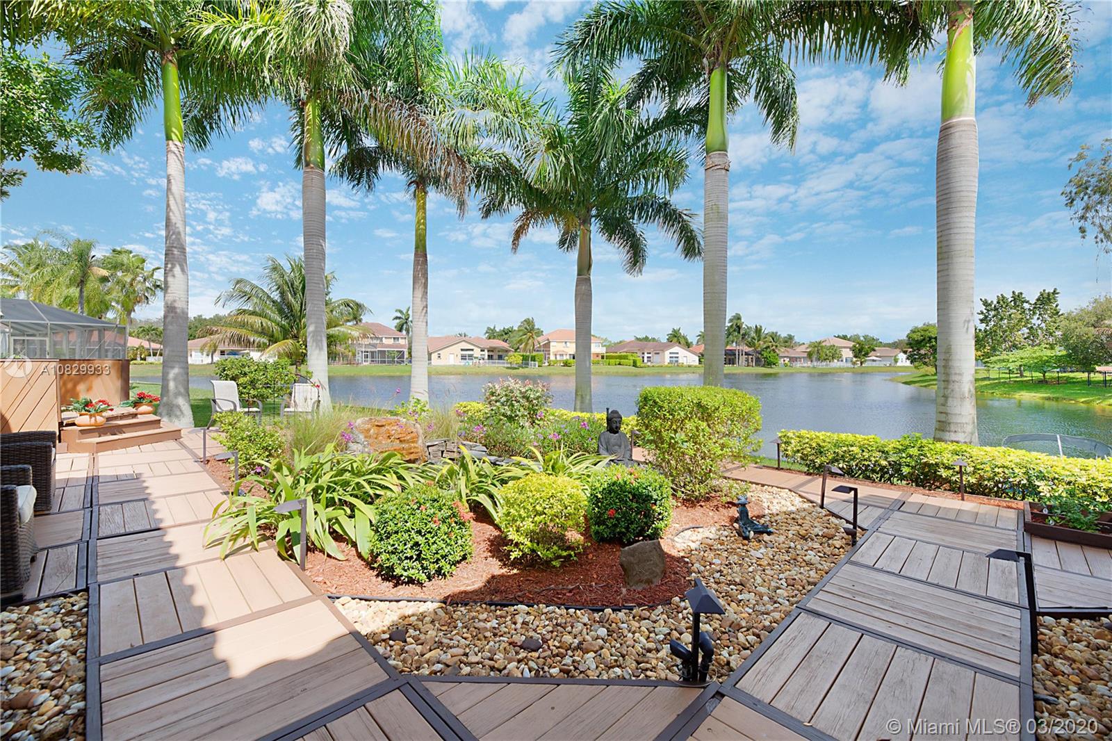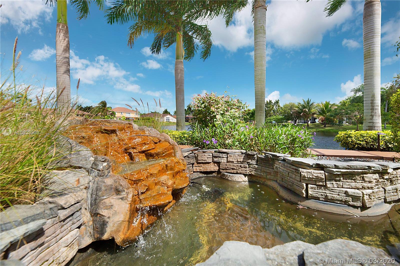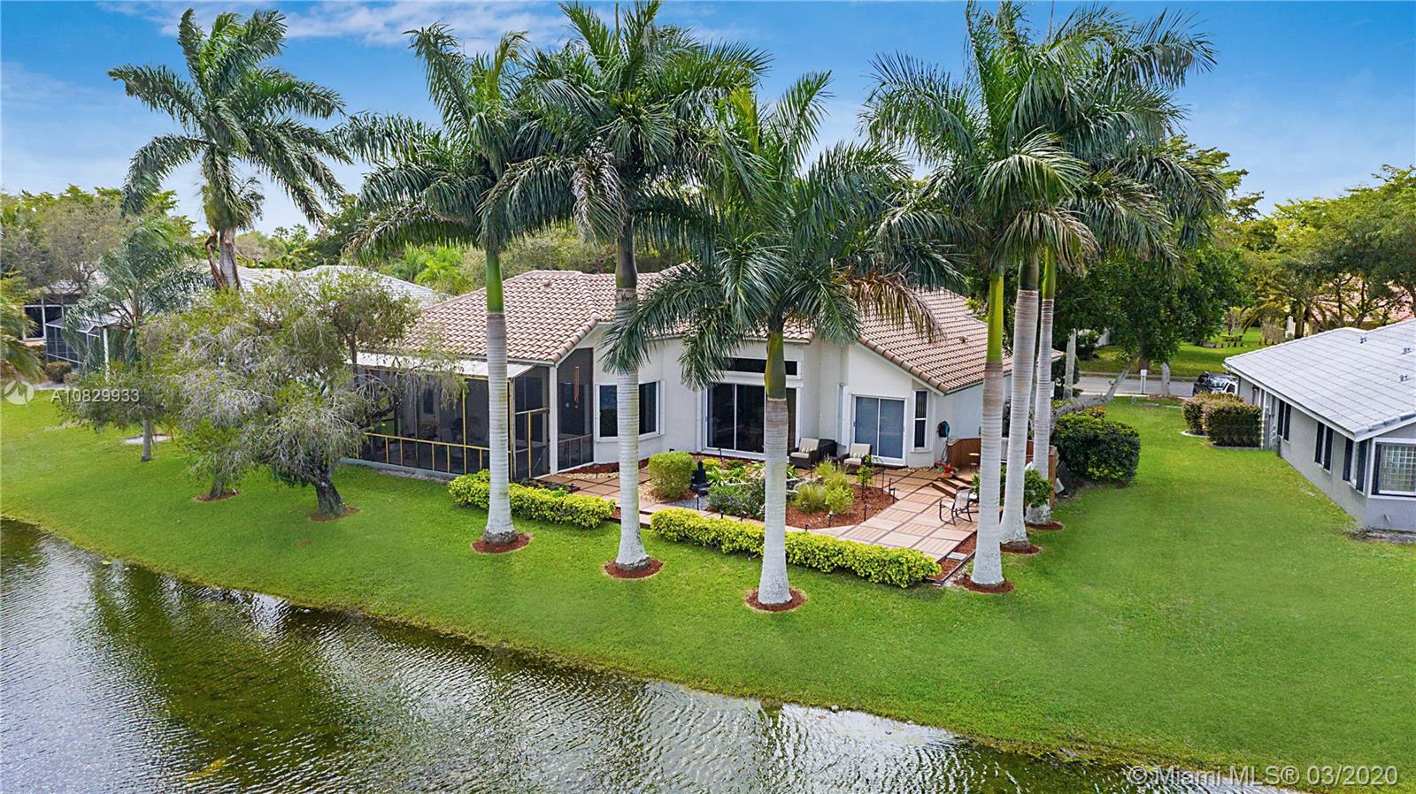 Spectacular 4/3.5 home situated on a prime 11,773 sqft waterfront lot. Walk through your covered entry & you are greeted by volume ceilings & incredible views right to your backyard. Warm wood floors throughout your formal dining & living rooms. Split bedroom floor plan. Master suite features double walk-in closets & large en-suite bath! Your upgraded kitchen is located in the heart of the home w/ stainless appliances, granite counters & overlooks your breakfast nook lined w/ windows & family room. Bedroom 2 has an attached private bathroom. Once you step outside you are transported to a tropical oasis that leads you out to an incredibly manicured zen garden w/ deck, walking paths, pond w/ rock waterfall and the property is lined w/stunning royal palm trees & more. Video tour available.